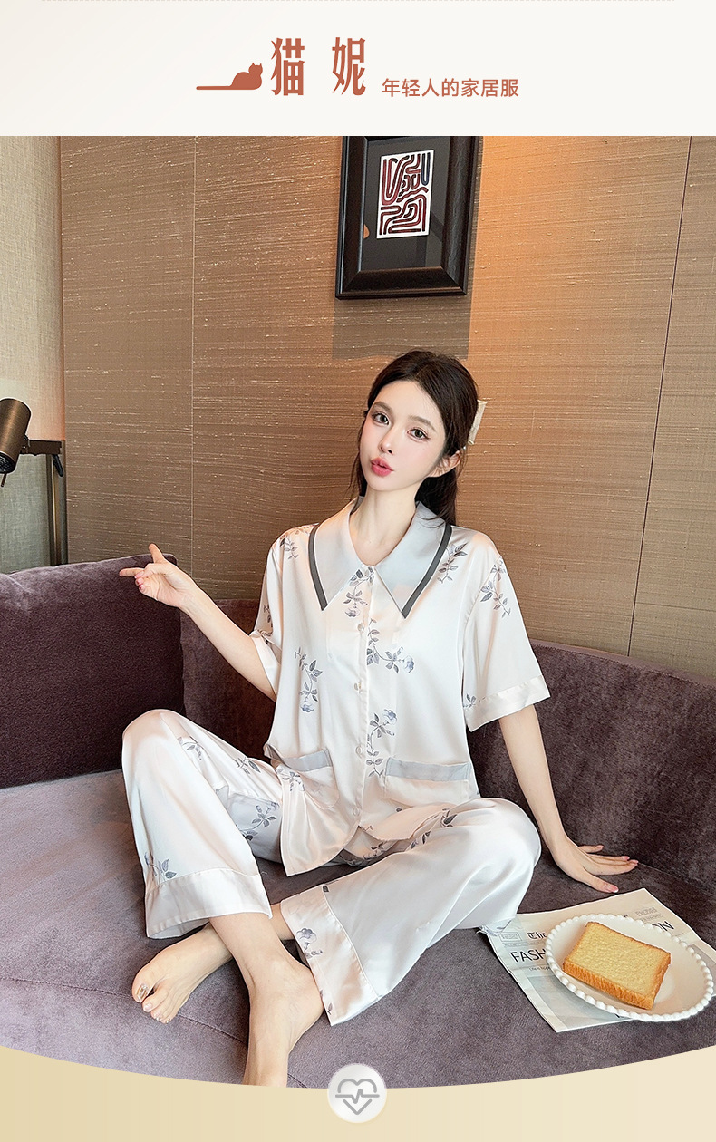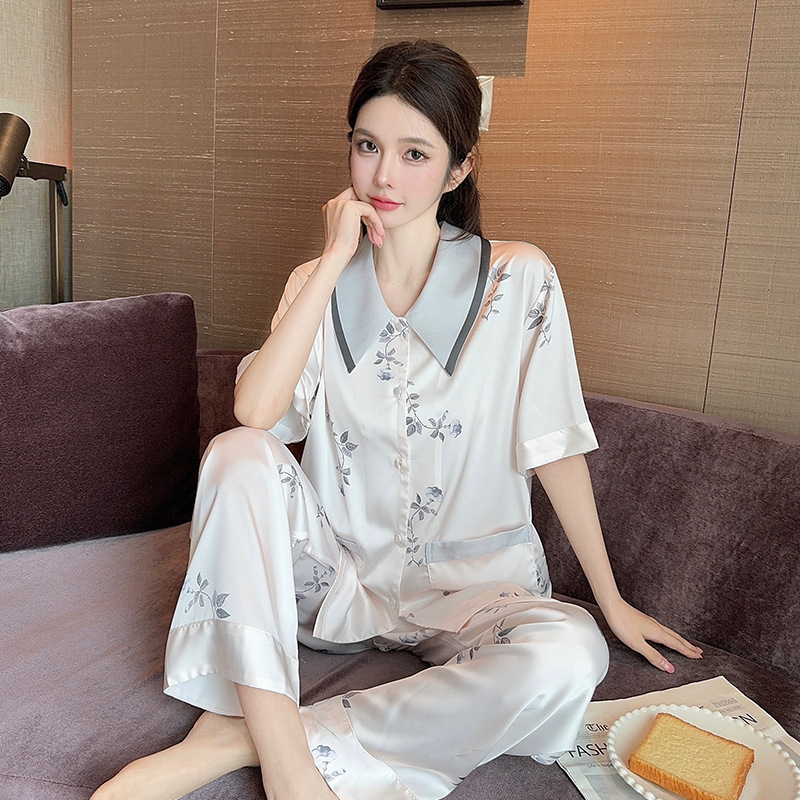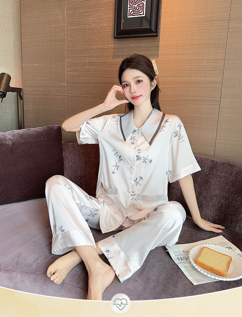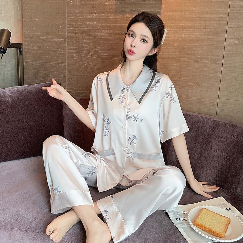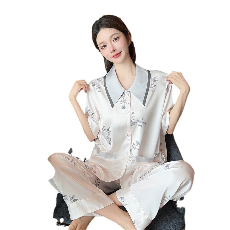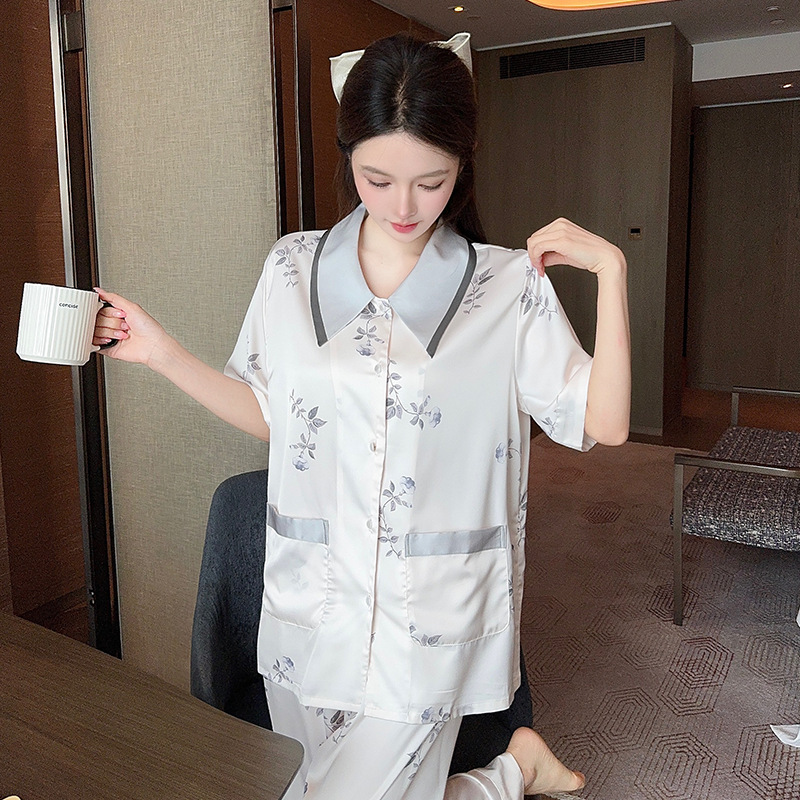 새로운 한국식 프랑스 스타일 꽃 아이스 실크 파자마 봄과 여름 반팔 실크 소녀의 달콤한 홈 옷 투피스 세트