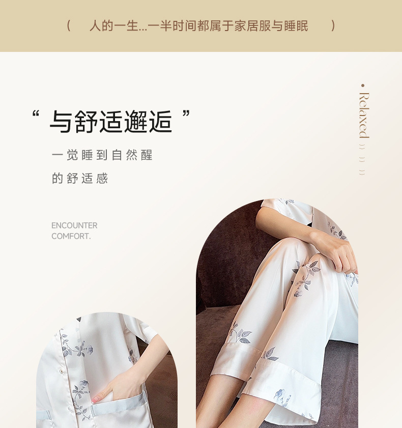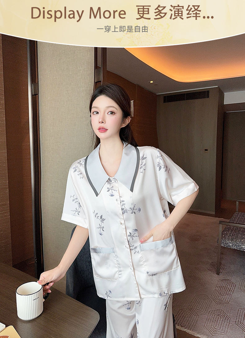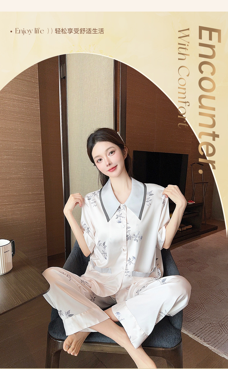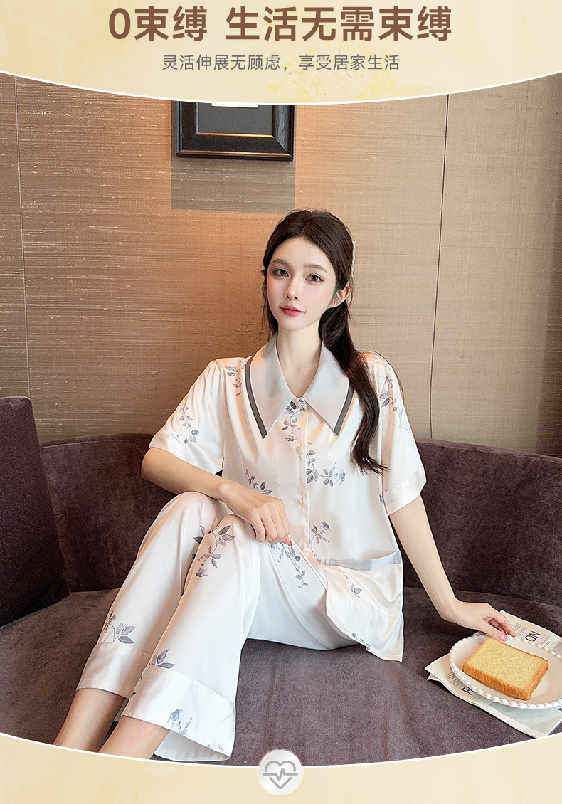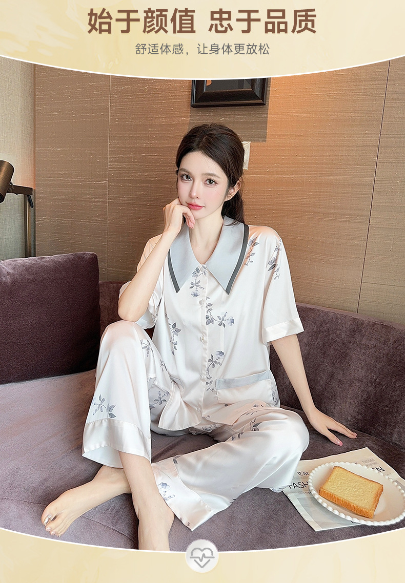 새로운 한국식 프랑스 스타일 꽃 아이스 실크 파자마 봄과 여름 반팔 실크 소녀의 달콤한 홈 옷 투피스 세트