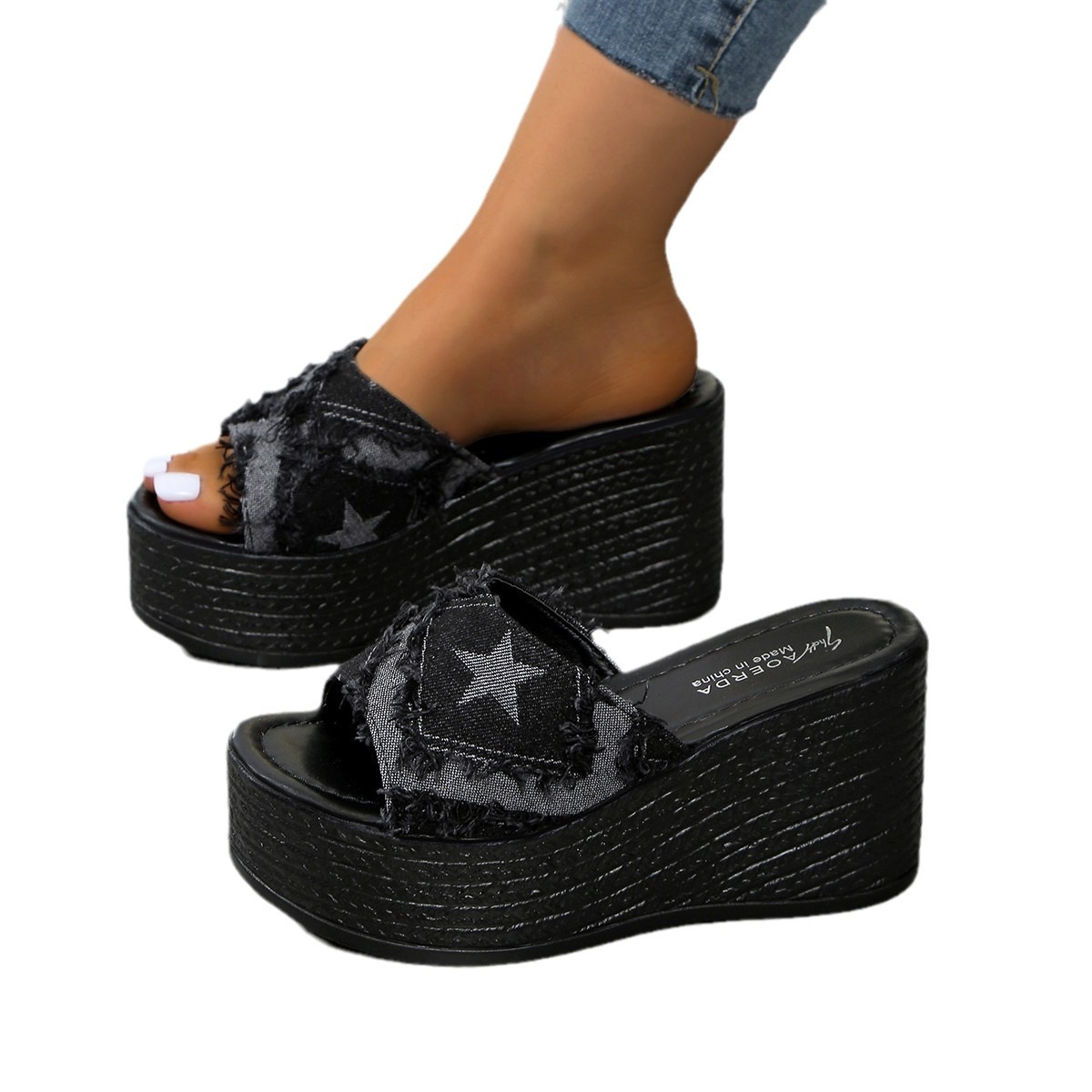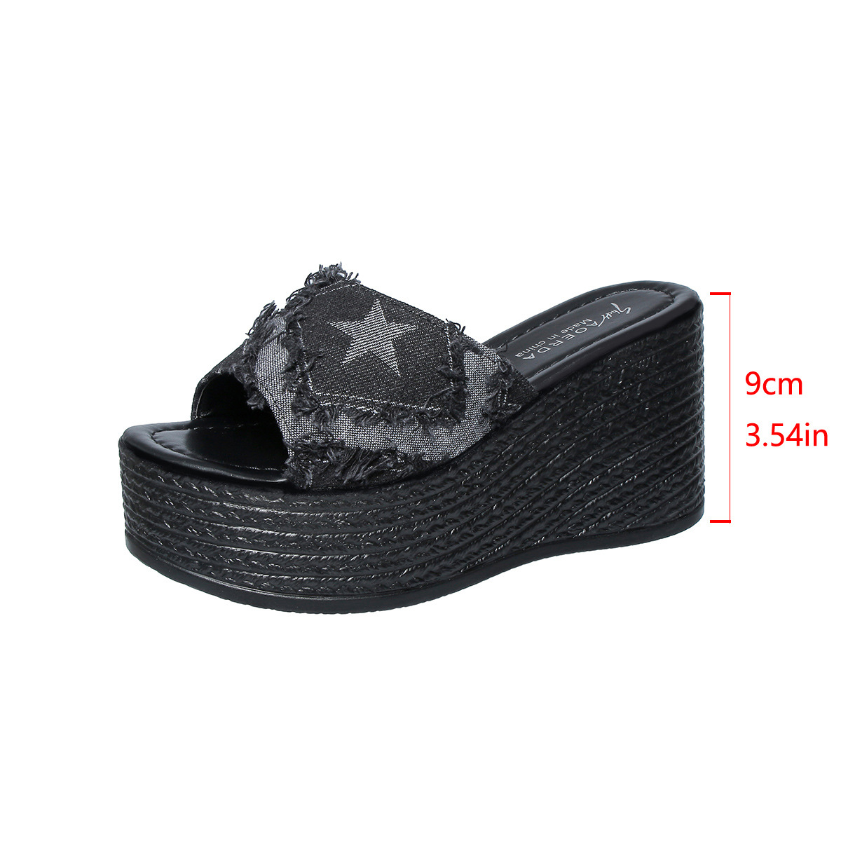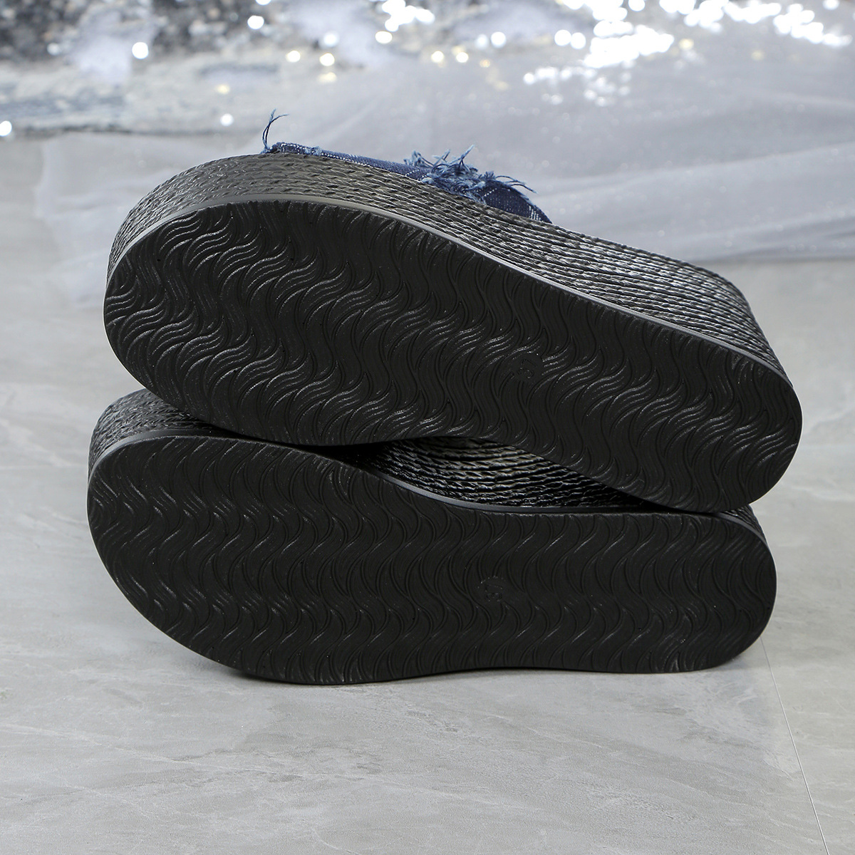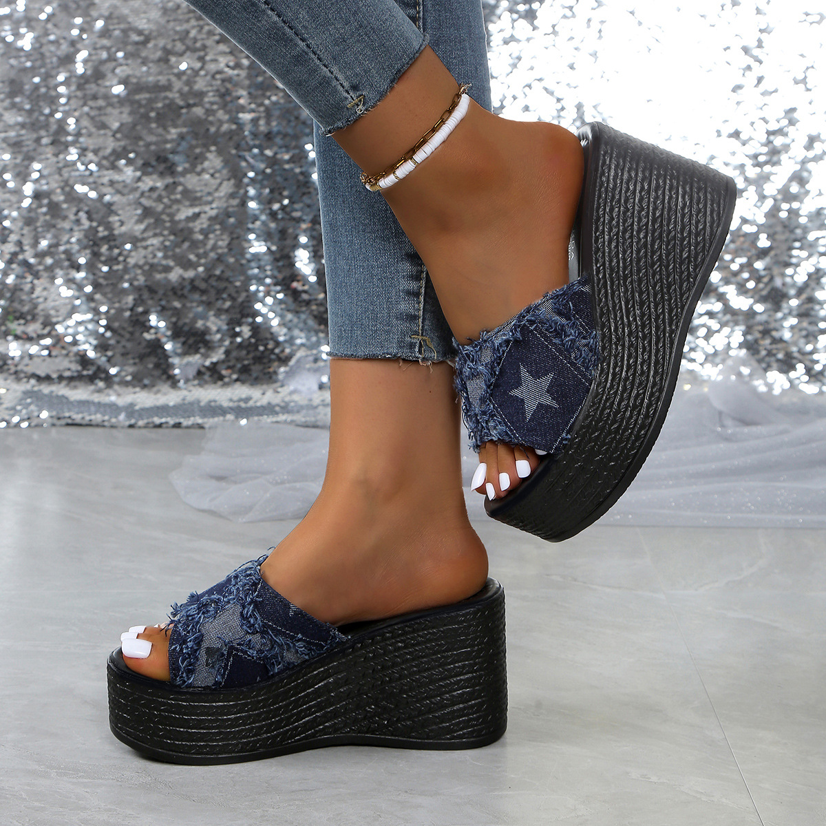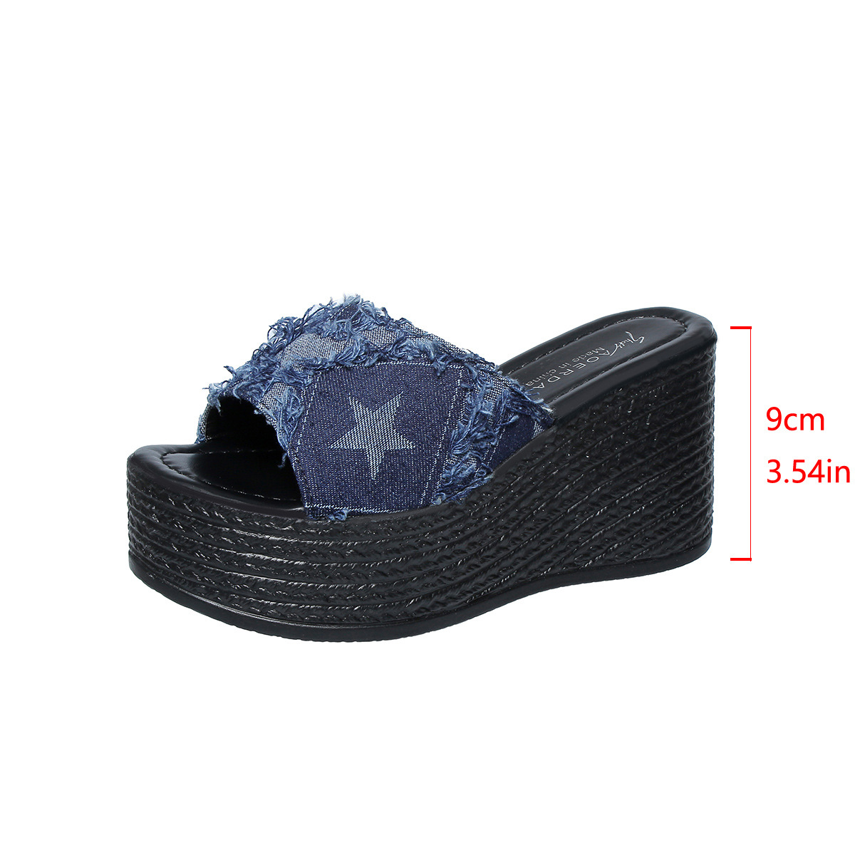 2024 여름 여성을위한 크로스 보더 대형 슬리퍼 유럽과 미국의 새로운 스타일 두꺼운 밑창 웨지 데님 캐주얼 샌들
