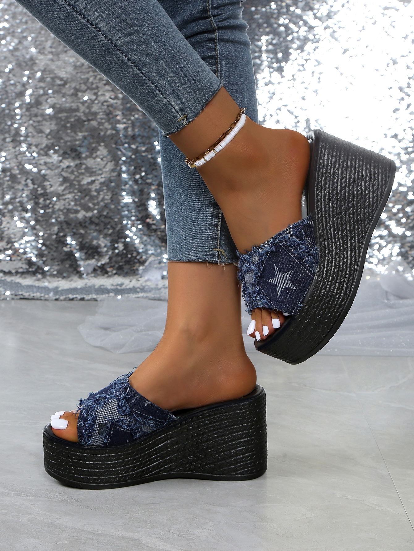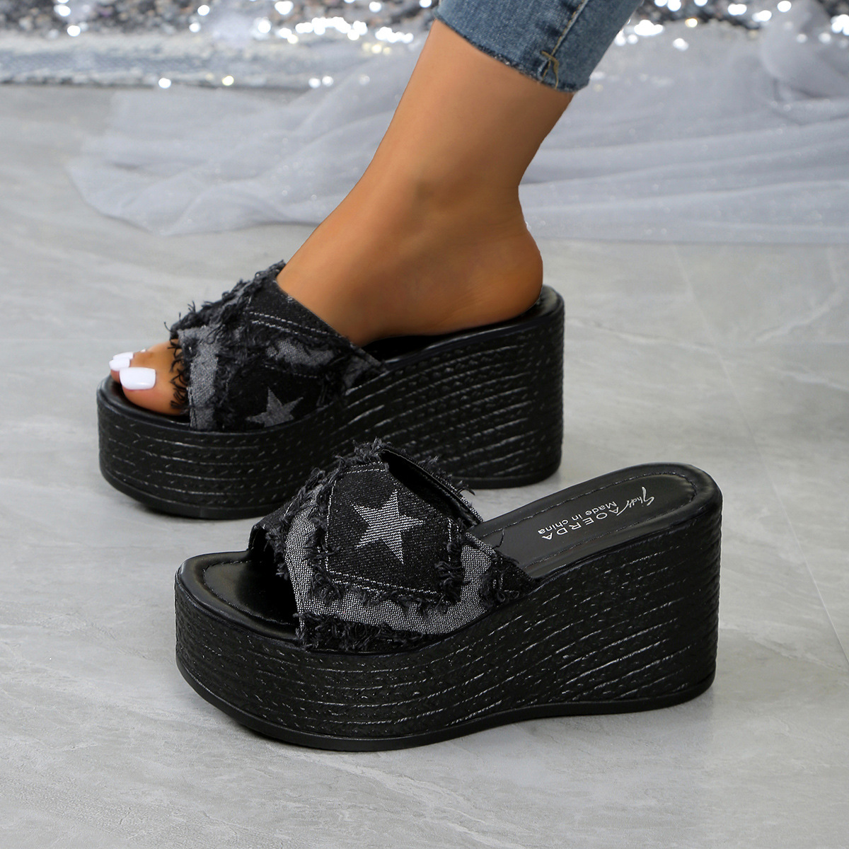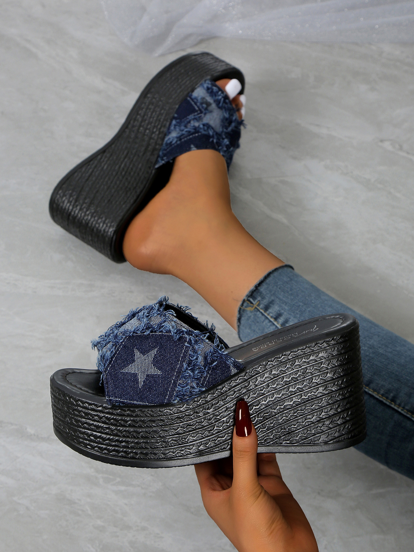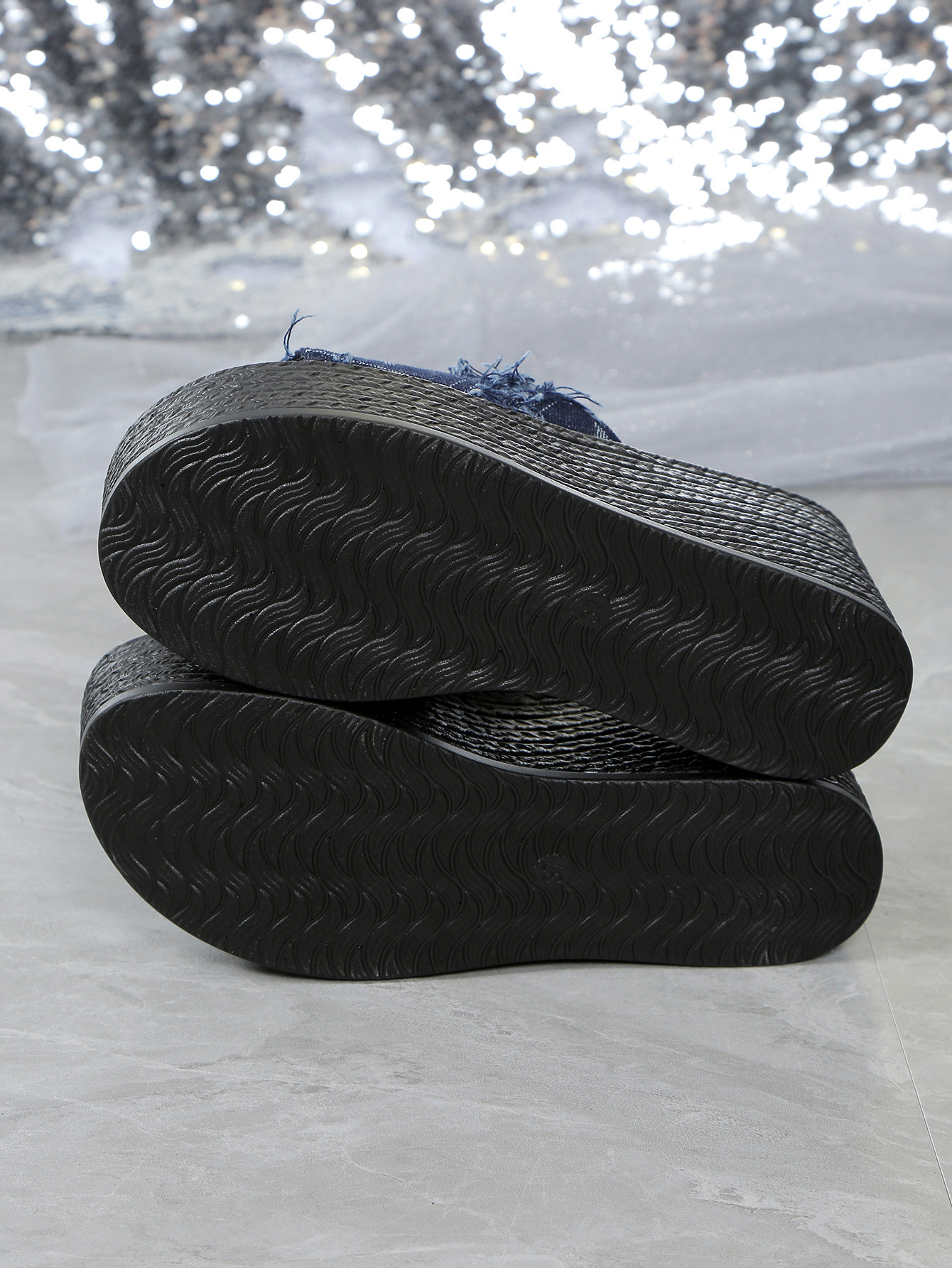 2024 여름 여성을위한 크로스 보더 대형 슬리퍼 유럽과 미국의 새로운 스타일 두꺼운 밑창 웨지 데님 캐주얼 샌들