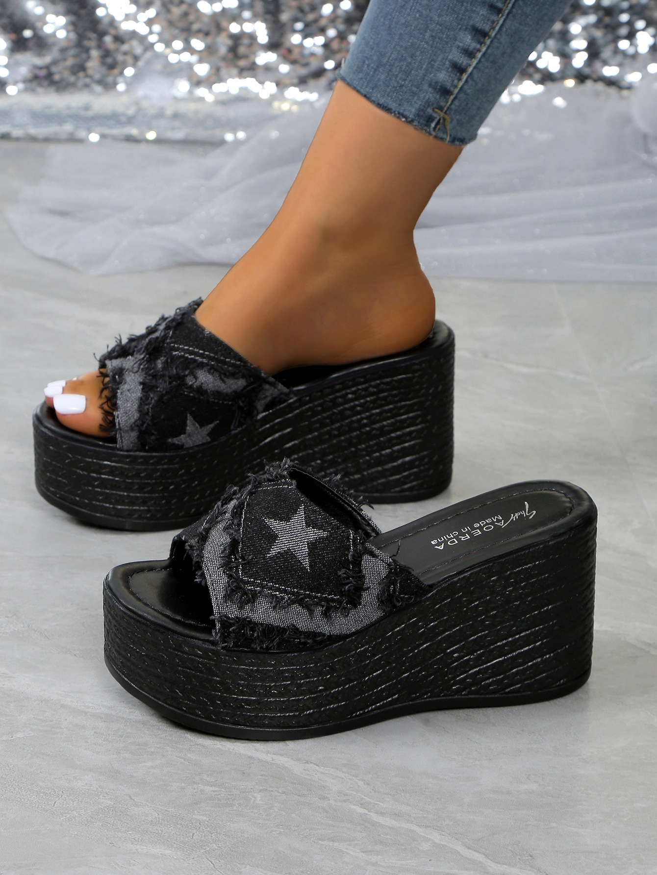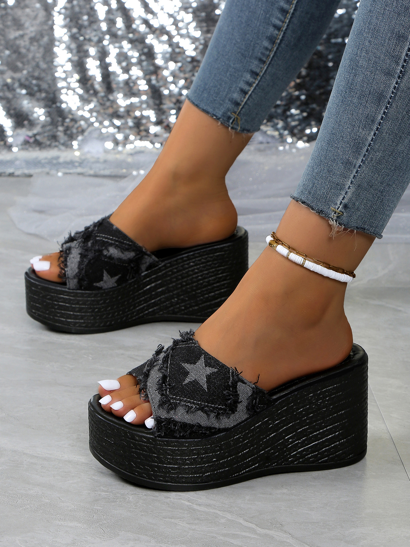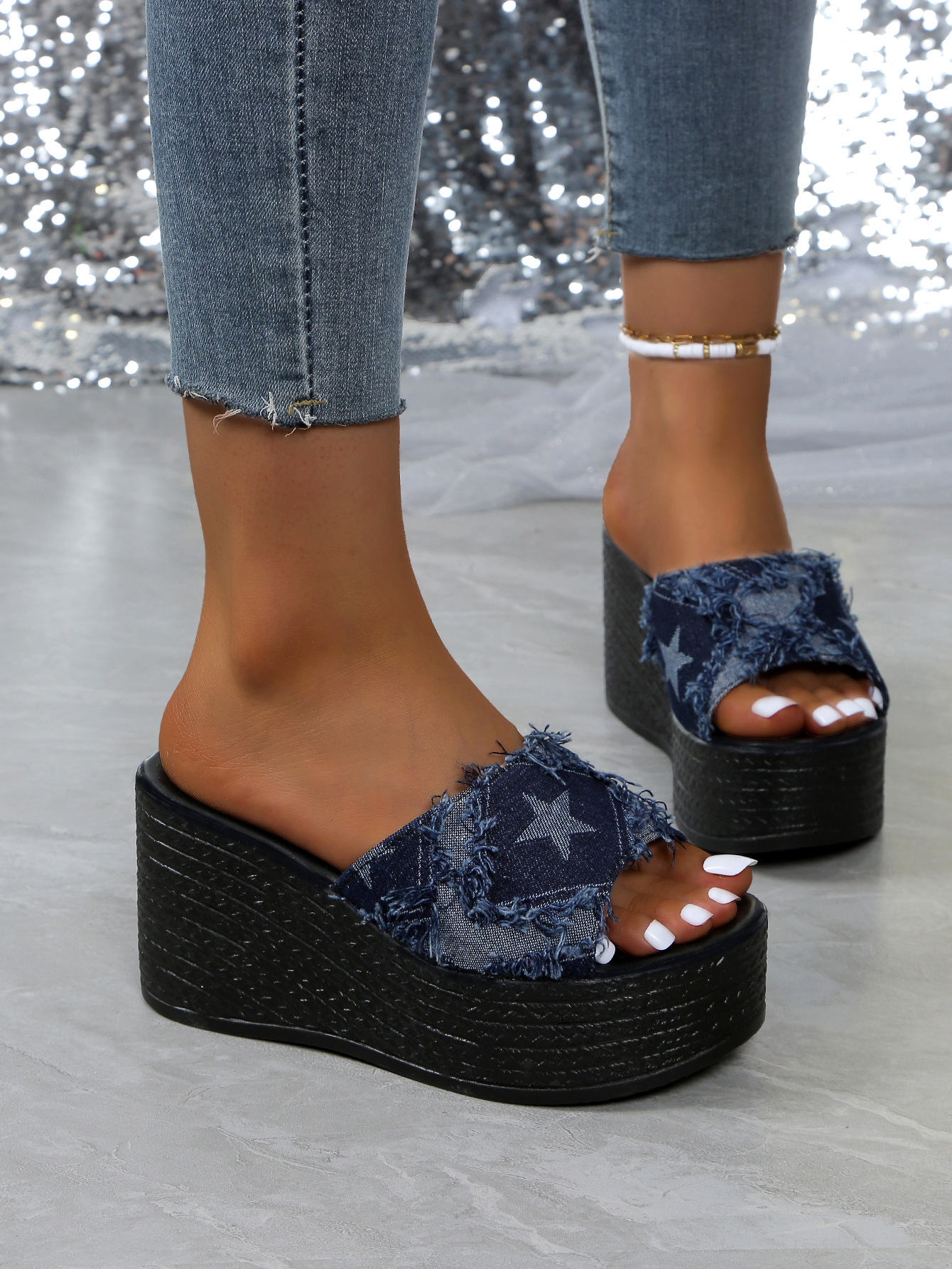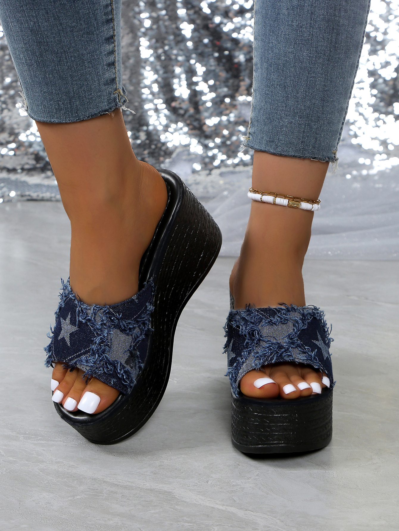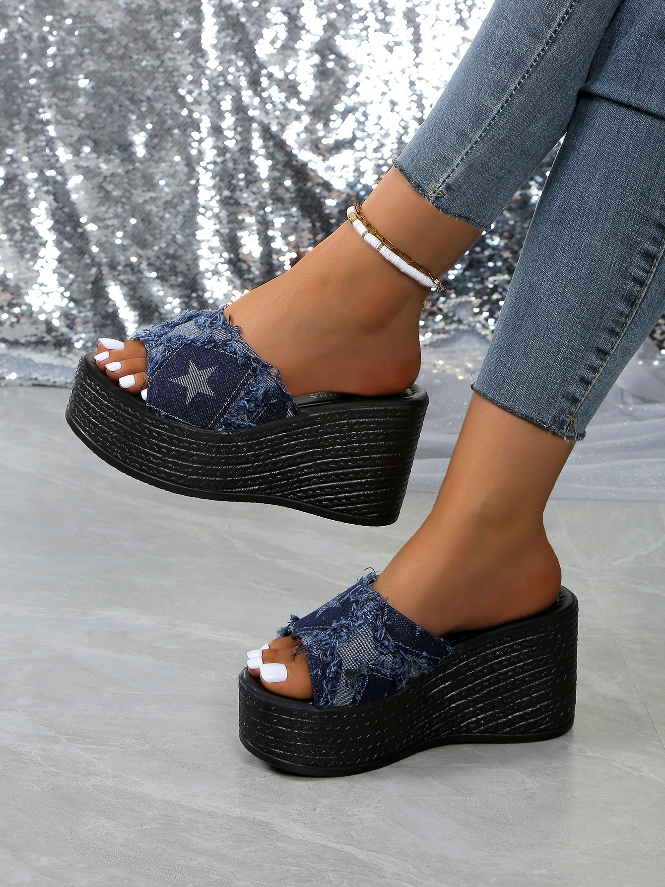 2024 여름 여성을위한 크로스 보더 대형 슬리퍼 유럽과 미국의 새로운 스타일 두꺼운 밑창 웨지 데님 캐주얼 샌들