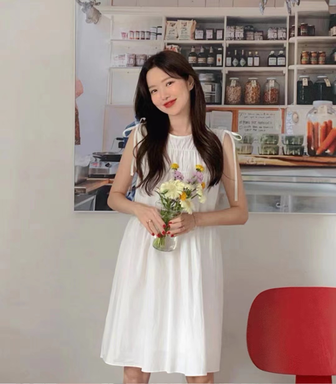 한국풍 시크 라운드넥 주름 장식 리본 끈 민소매 조끼 원피스 여성용 한국 스타일 셔츠와 함께 입기 좋은