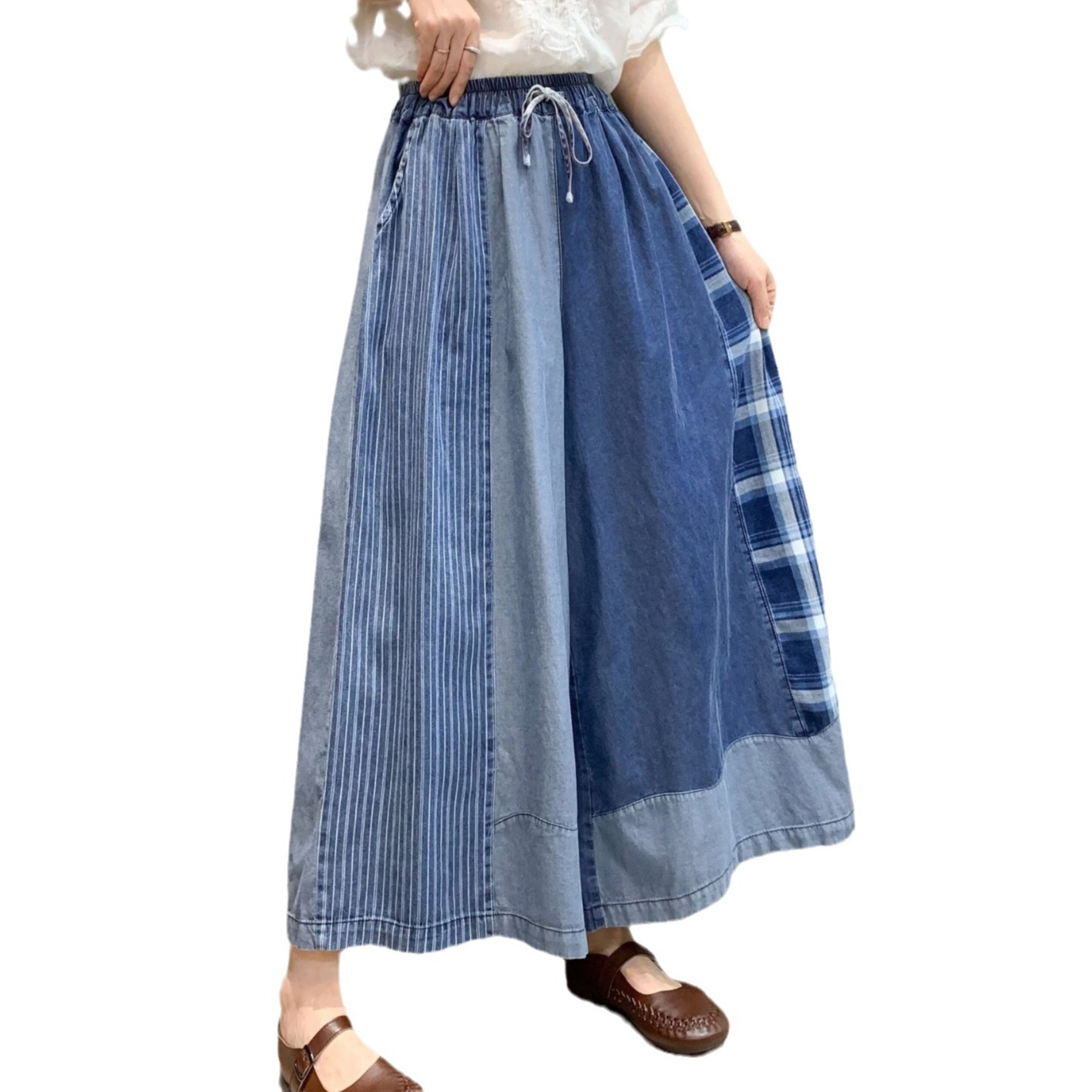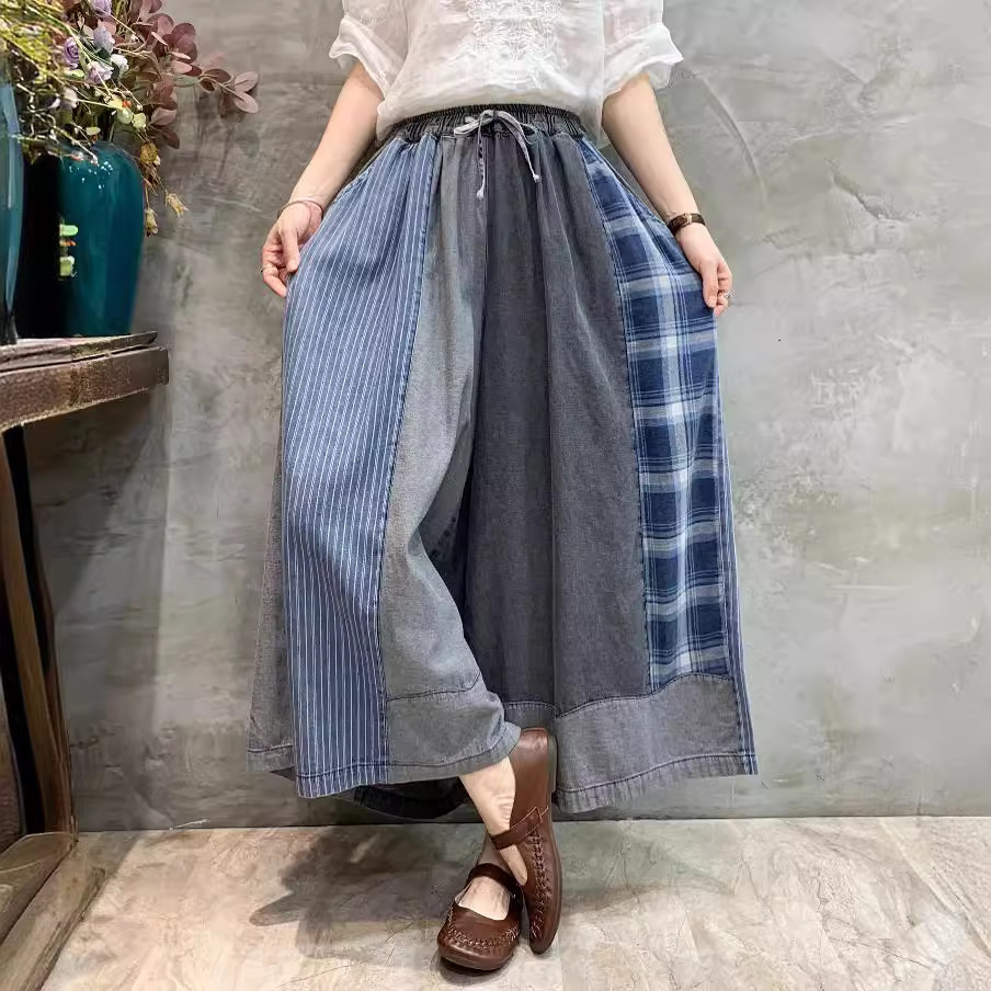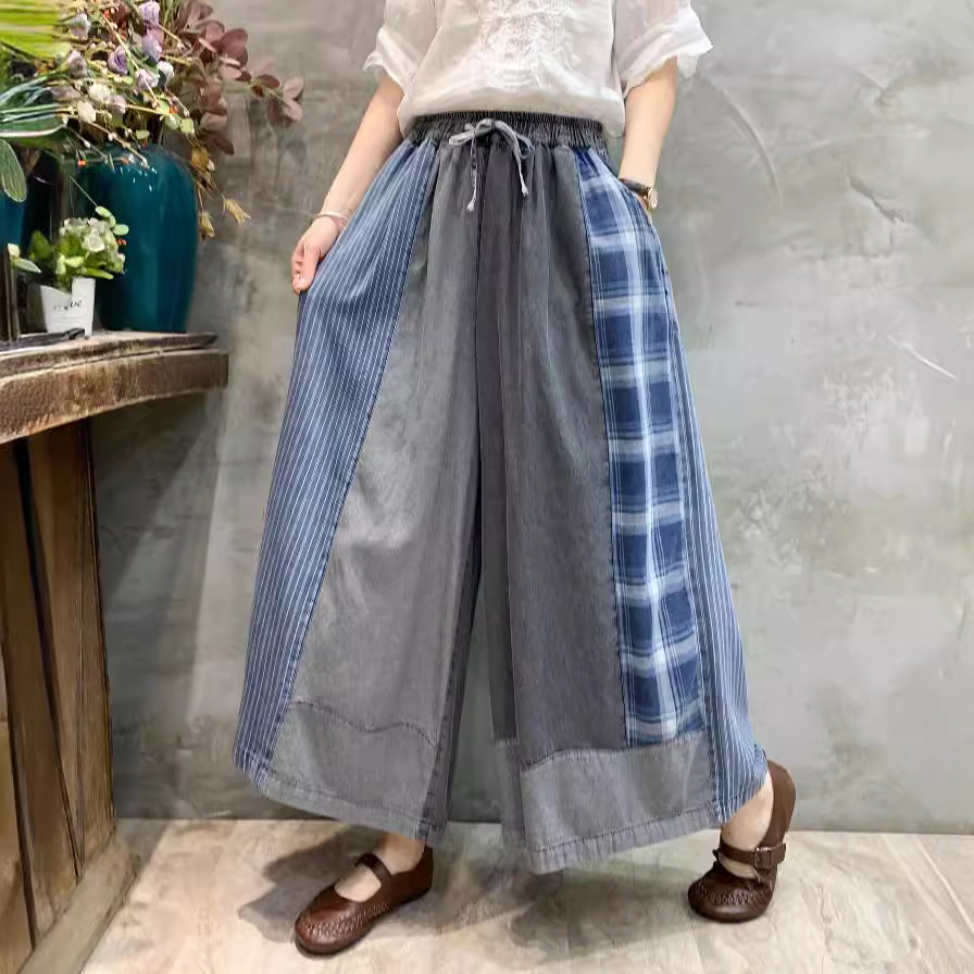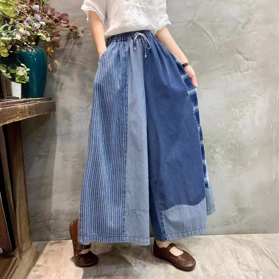 데님 바느질 와이드 레그 바지 봄과 가을 새로운 도착 Elasticated Waist Lace-up Washed White All-match Loose 대형 바지 여성용 바지