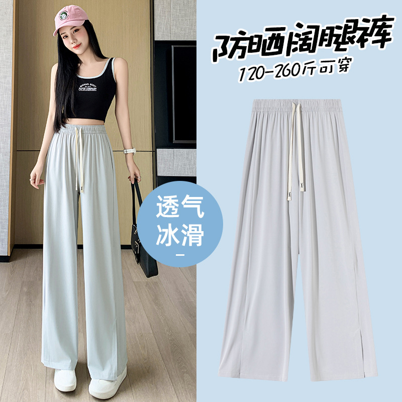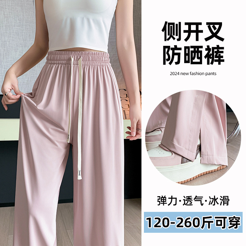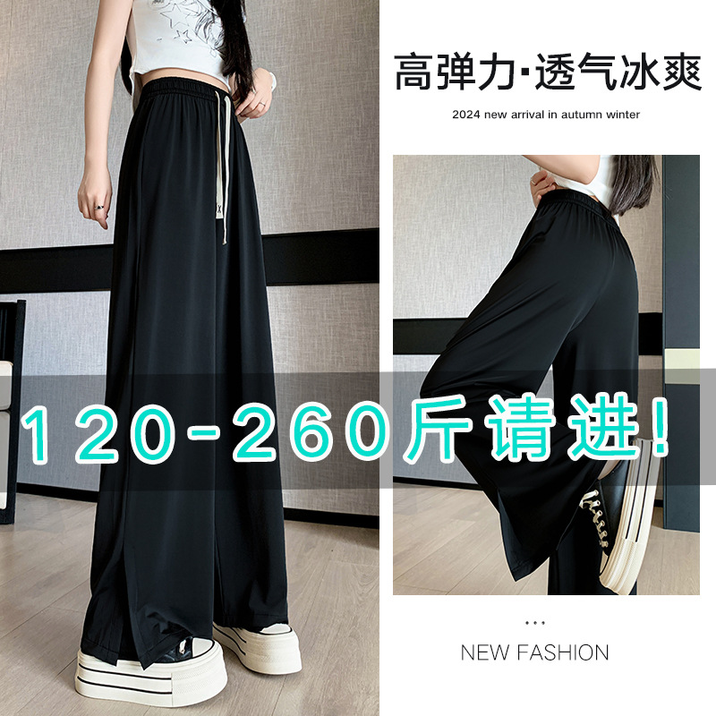 여름 자외선 차단제 와이드 레그 바지 여성용 플러스 사이즈 200kg 통통녀 하이 허리 슬리밍 사이드 스플릿 캐주얼 스트레이트 팬츠