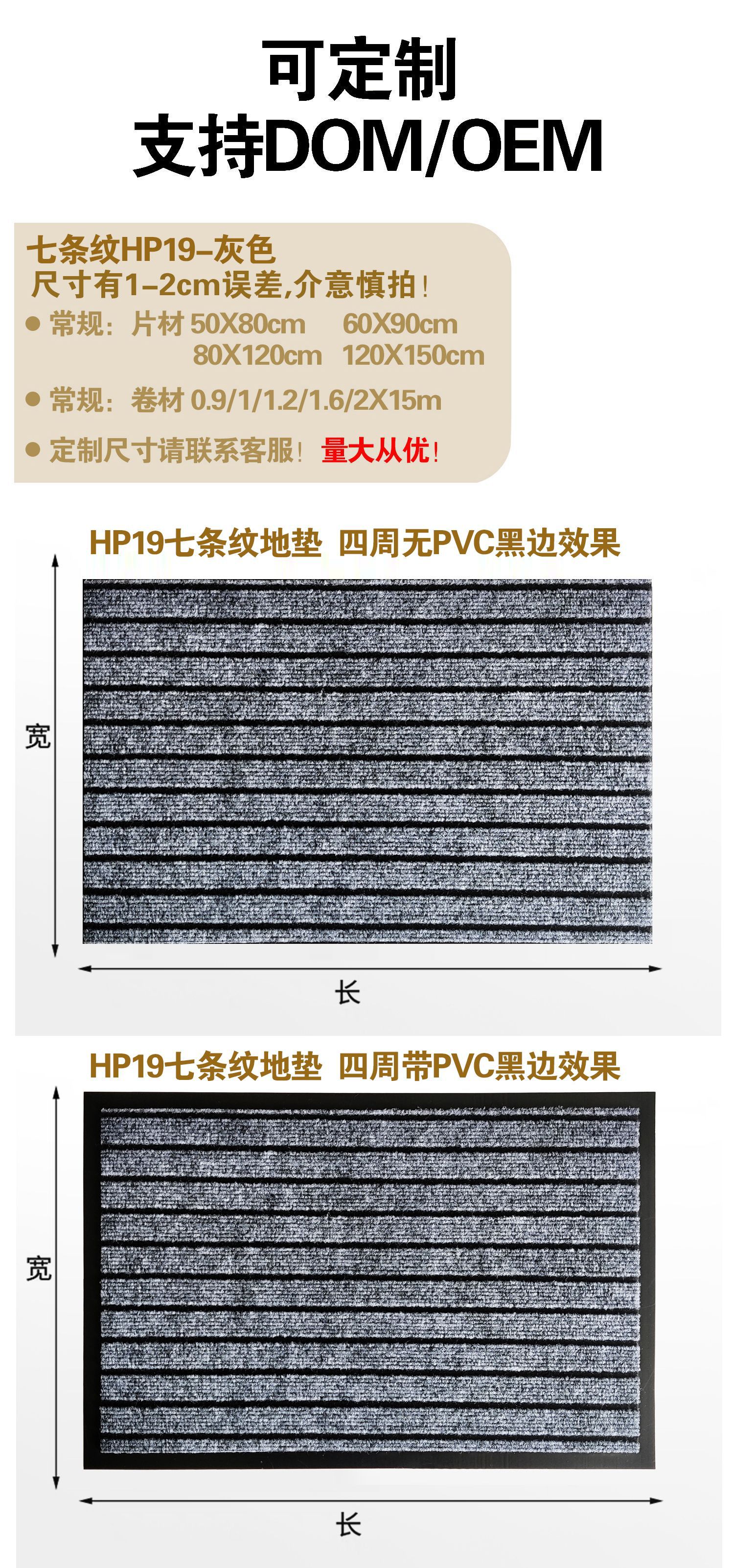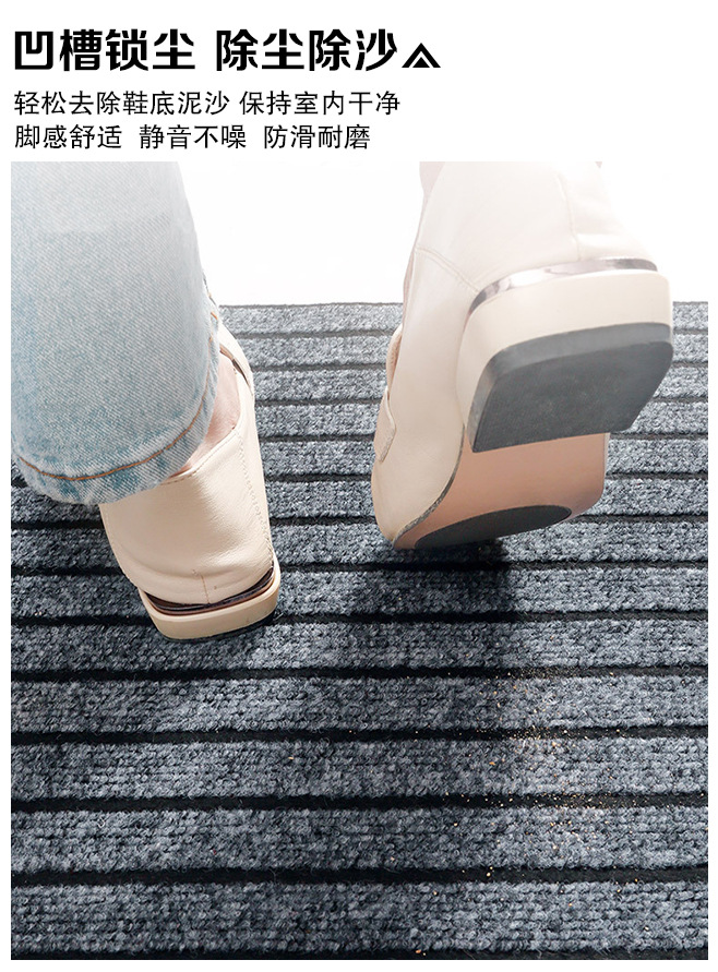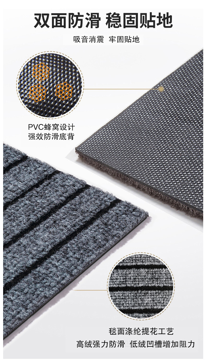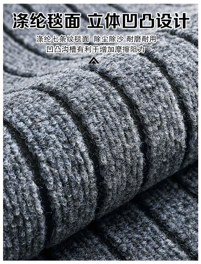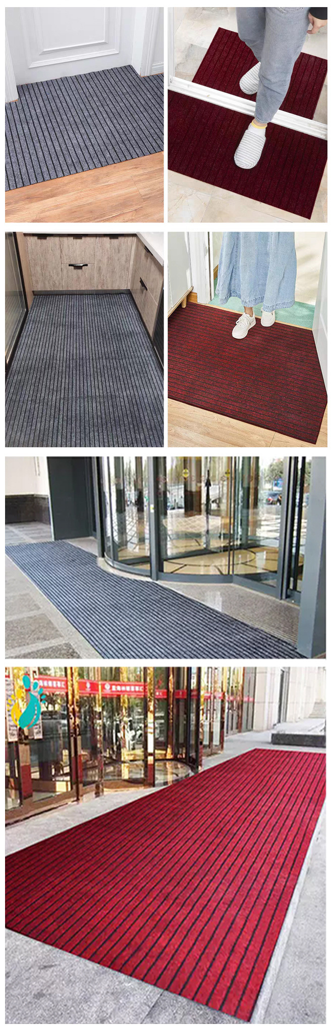 七条纹地毯。厂家直销 优质优量!可定制!有片材、卷材可选。颜色灰色,暗红,咖色可选。毯面涤纶材质,有效去除鞋底泥沙灰尘。易吸水、易挥发。易打理!拍打、冲洗、吸尘器皆可除尘沙。底背为PVC材质耐磨耐用,有效隔绝地面潮气。适用于家居入户门垫、商用酒店、别墅、超市、办公写字楼大门口、门廊、电梯毯等。