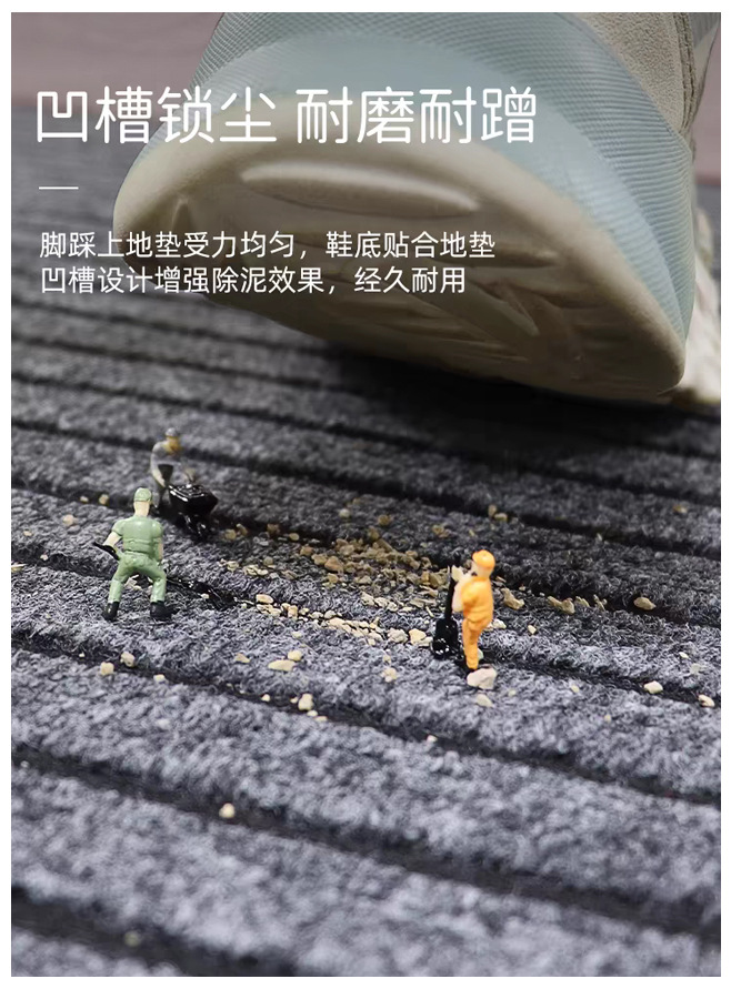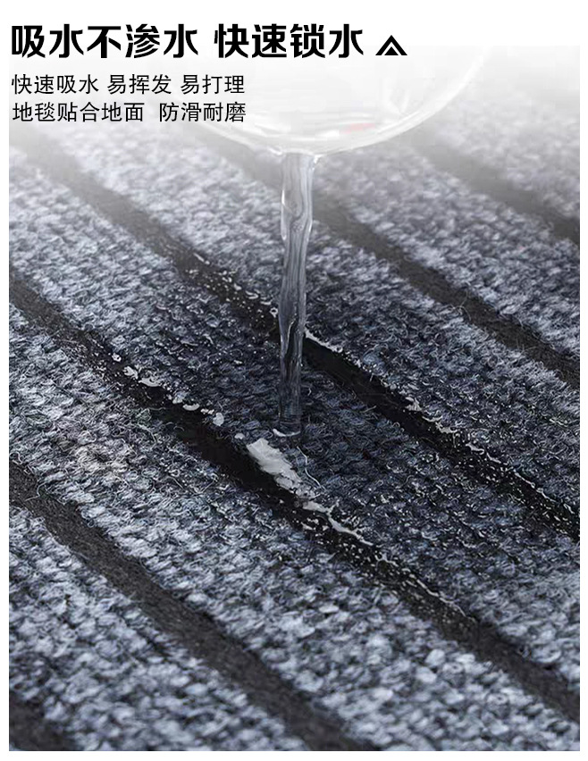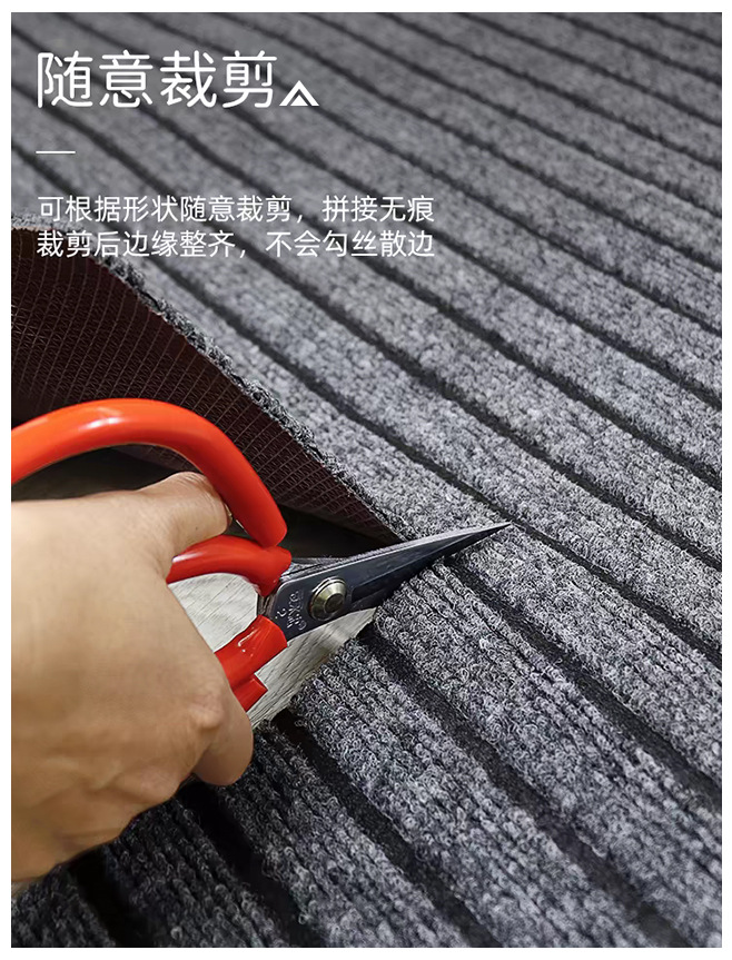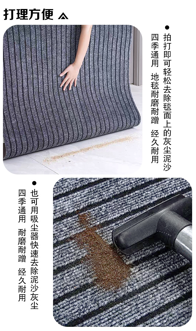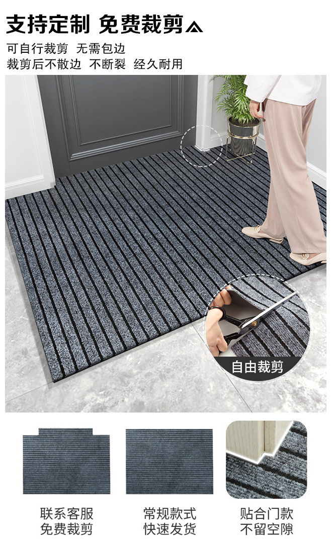 七条纹地毯。厂家直销 优质优量!可定制!有片材、卷材可选。颜色灰色,暗红,咖色可选。毯面涤纶材质,有效去除鞋底泥沙灰尘。易吸水、易挥发。易打理!拍打、冲洗、吸尘器皆可除尘沙。底背为PVC材质耐磨耐用,有效隔绝地面潮气。适用于家居入户门垫、商用酒店、别墅、超市、办公写字楼大门口、门廊、电梯毯等。