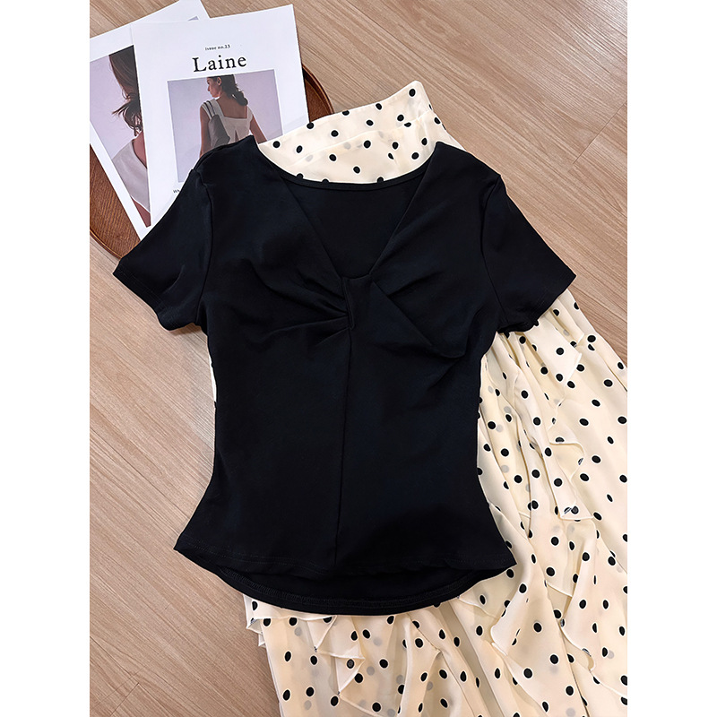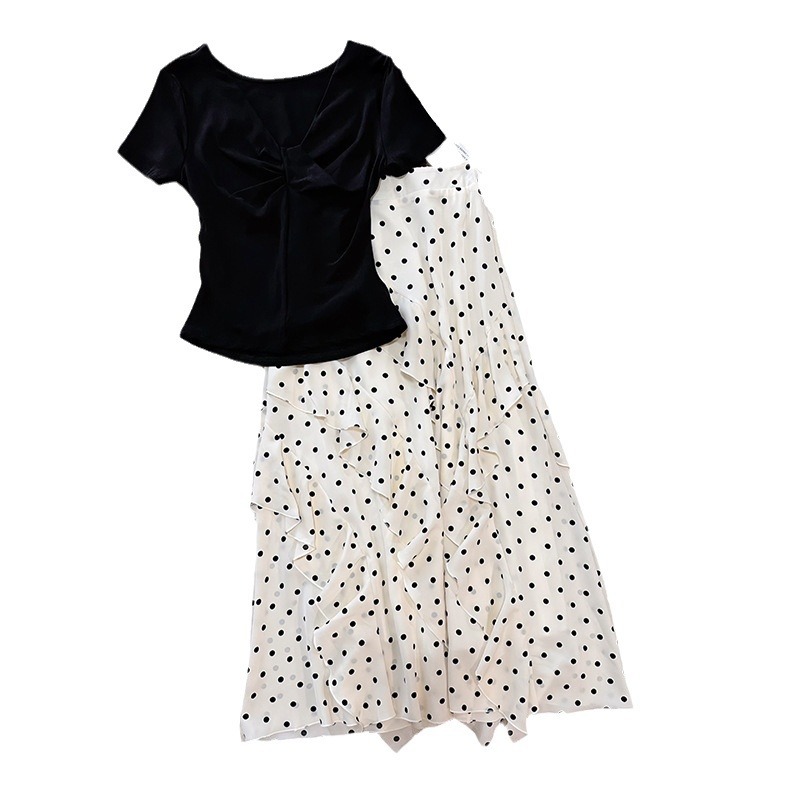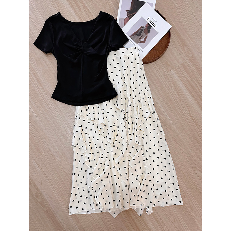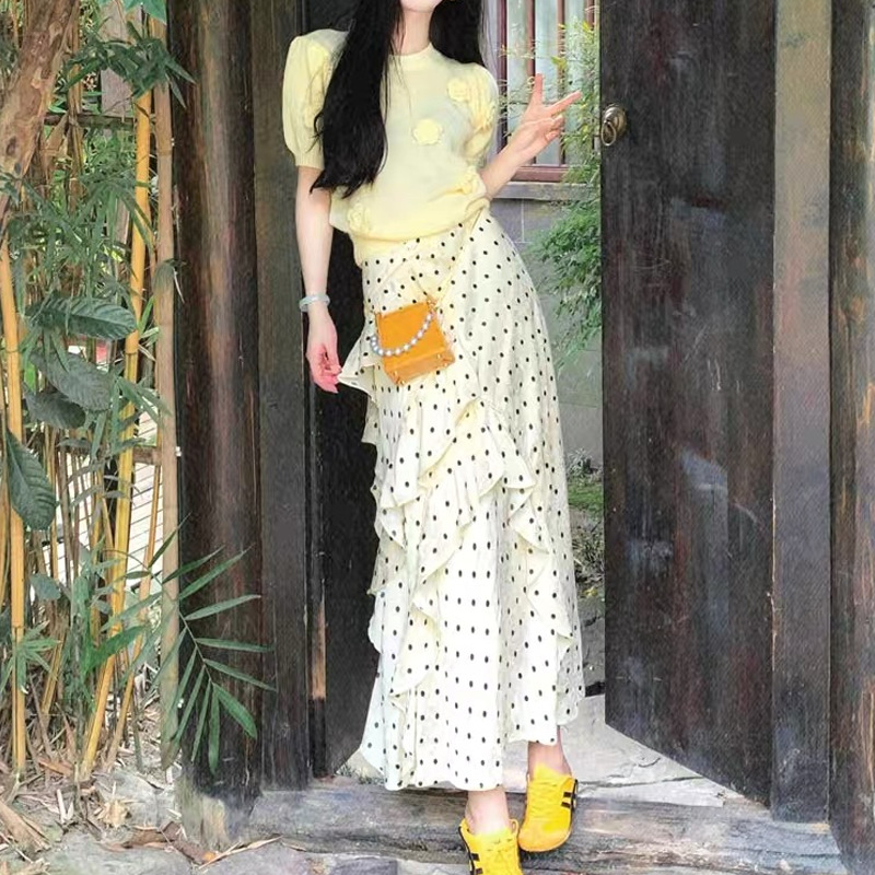 Qianyu 2026 여름 프렌치 스타일의 부드러운 디자인, 불규칙한 러플과 물방울무늬 하이웨이스트 롱 스커트
