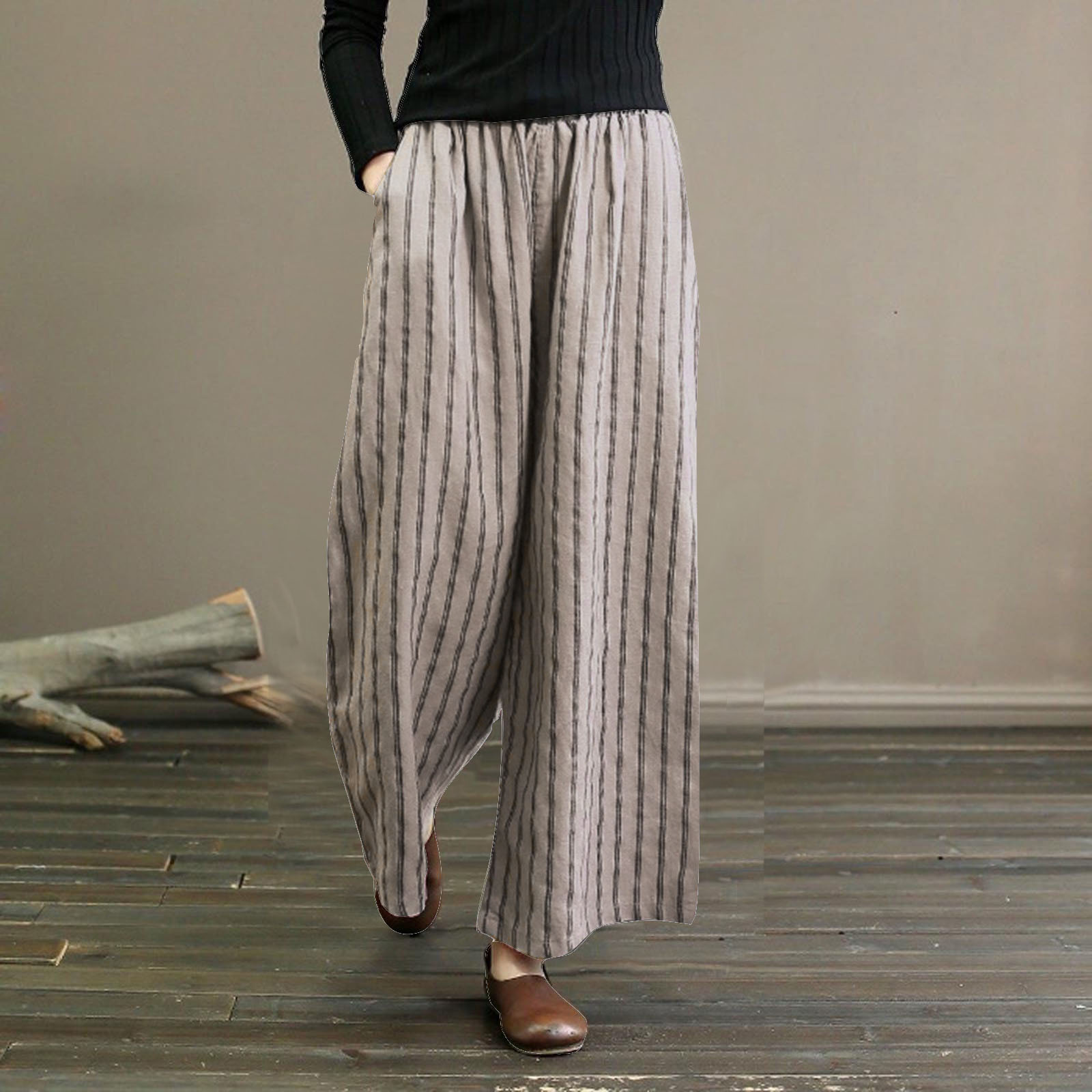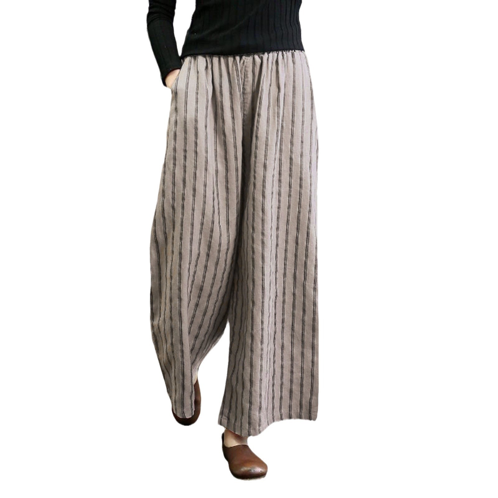 2023 아마존 레트로 코튼 및 리넨 스트라이프 와이드 레그 팬츠 여성용 슬림 핏 드롭 캐주얼 스트레이트 팬츠 여름 스타일