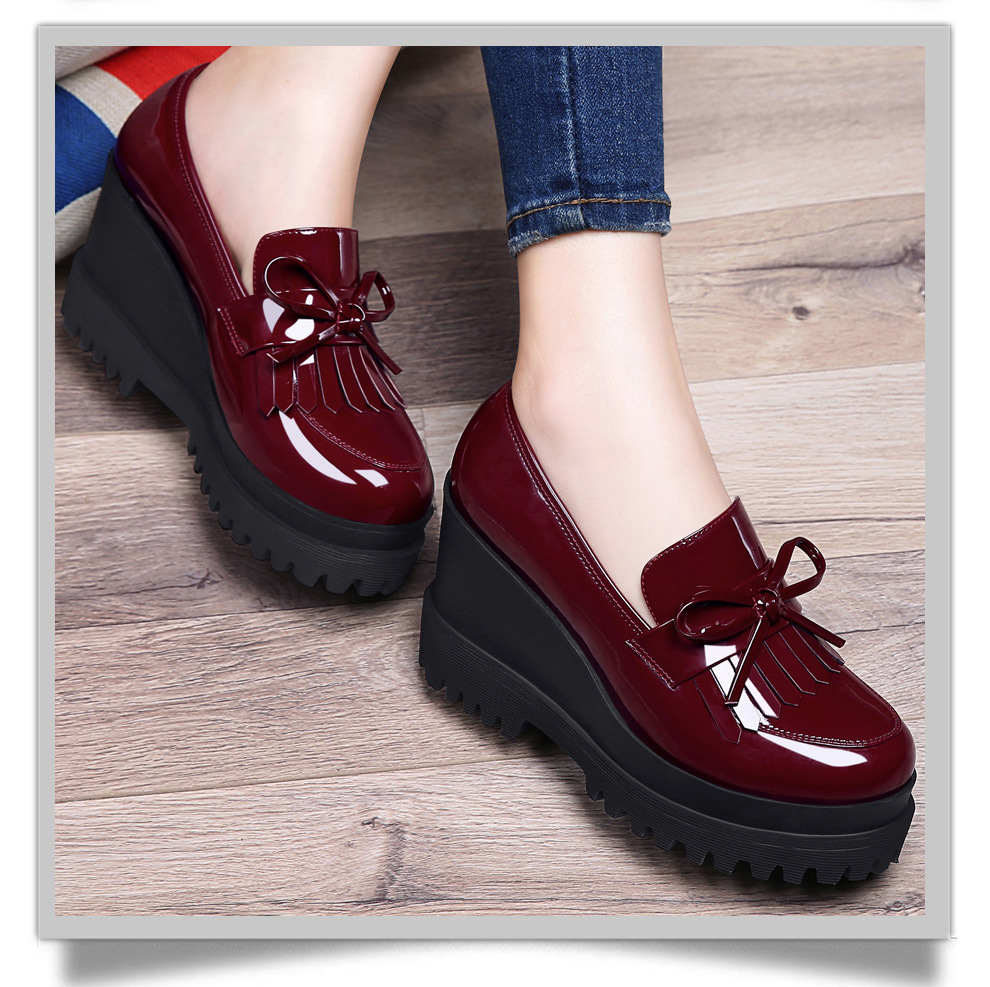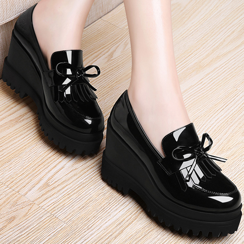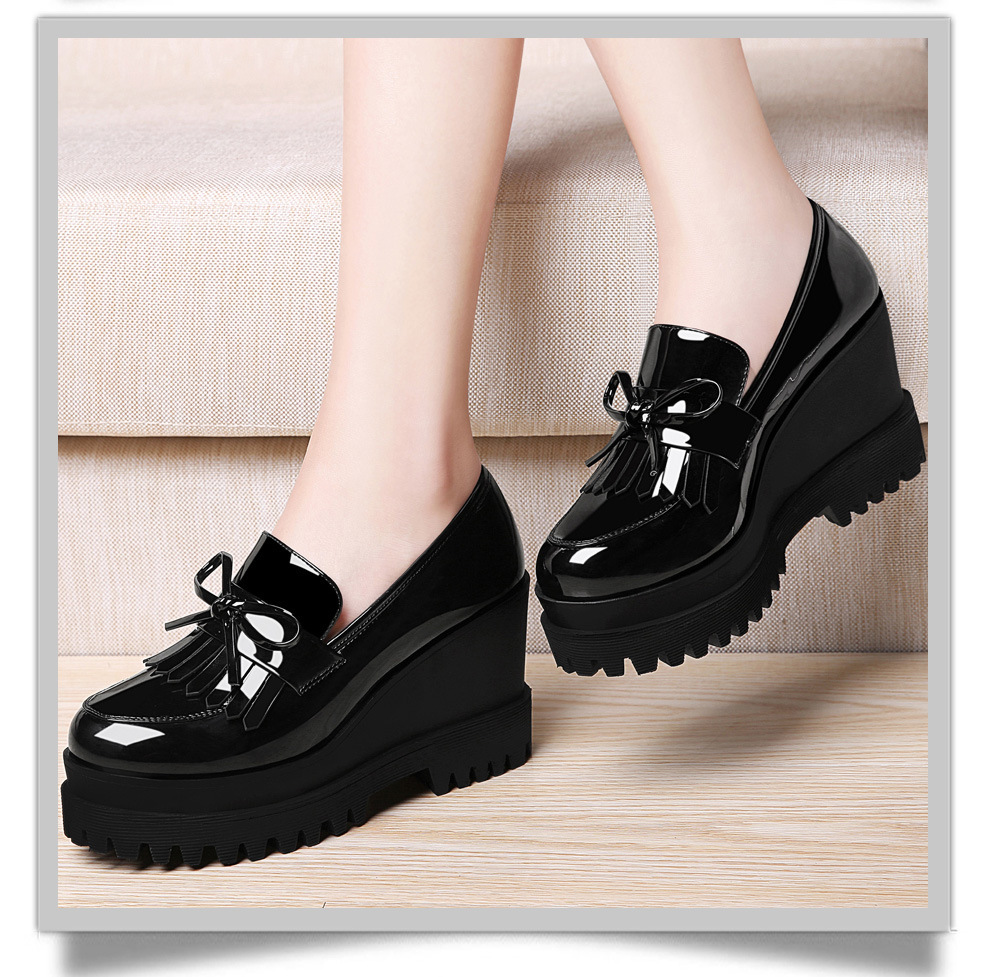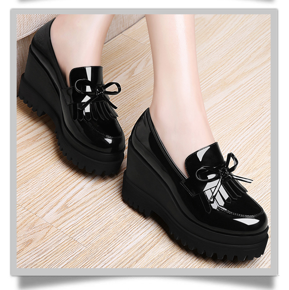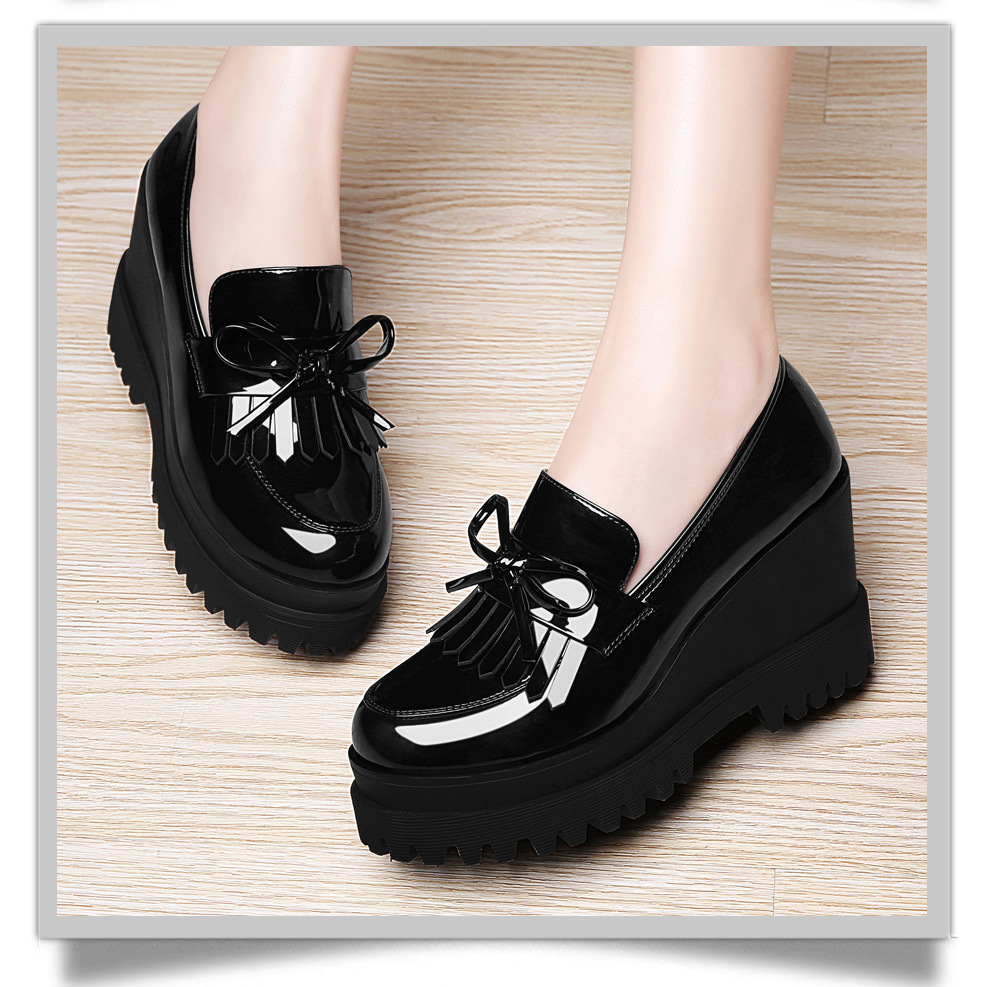 Gucci Tianlun 2024 봄과 가을 새로운 캐주얼 특허 가죽 신발 여성 로퍼 나비 매듭 웨지 하이힐