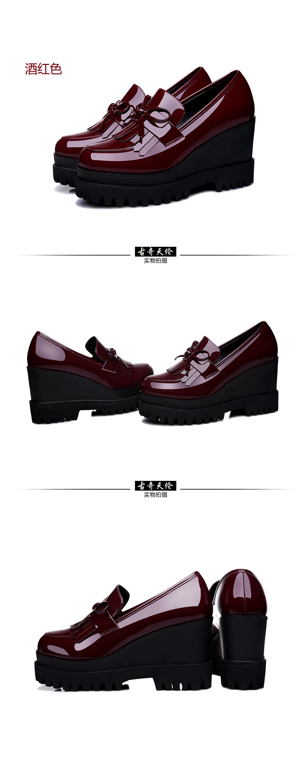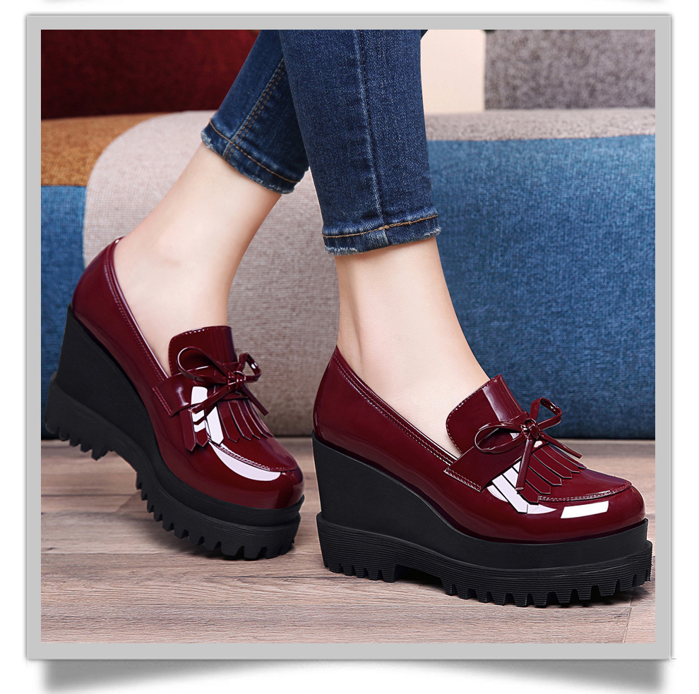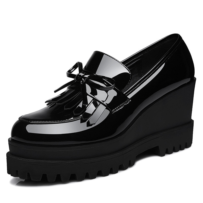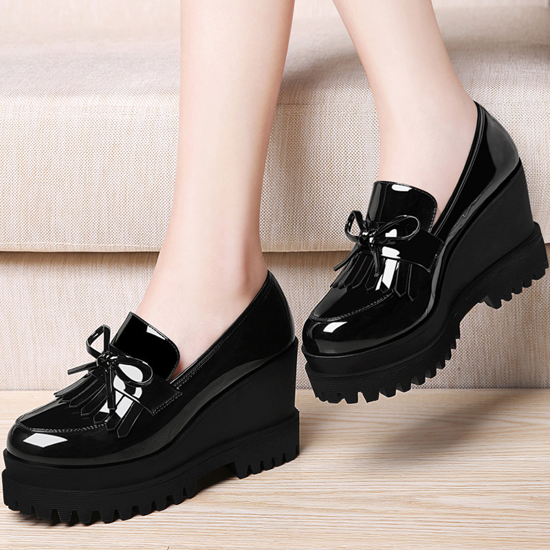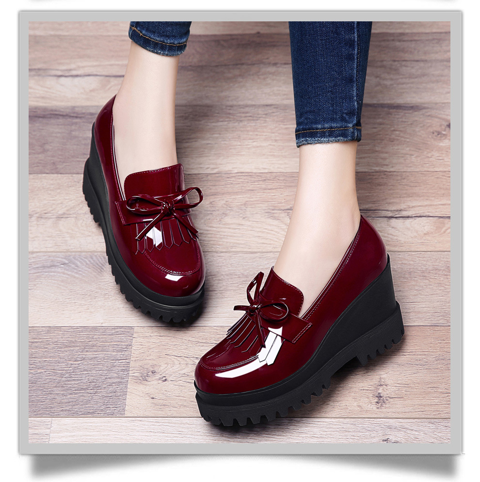 Gucci Tianlun 2024 봄과 가을 새로운 캐주얼 특허 가죽 신발 여성 로퍼 나비 매듭 웨지 하이힐