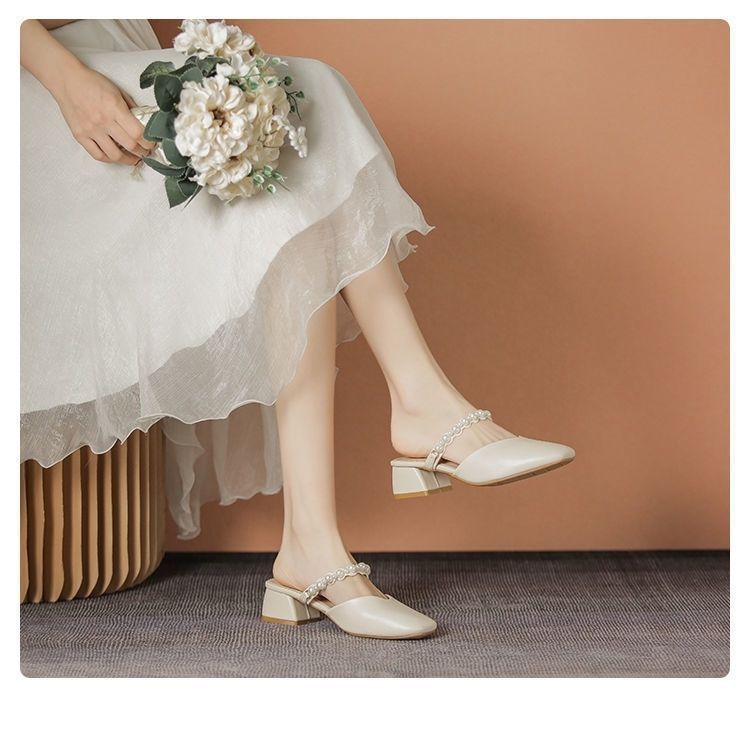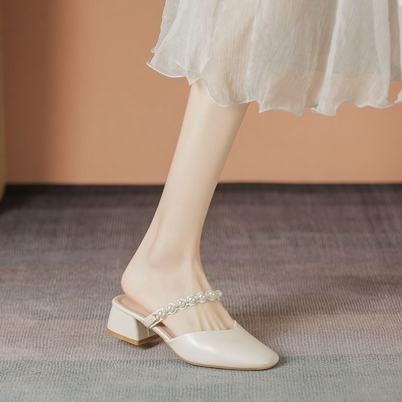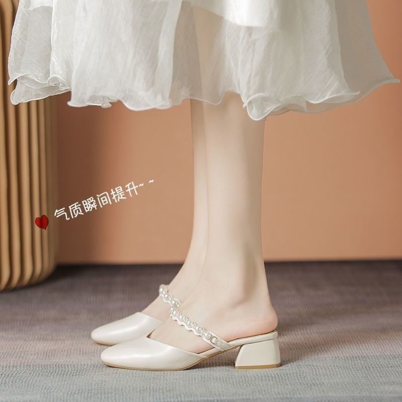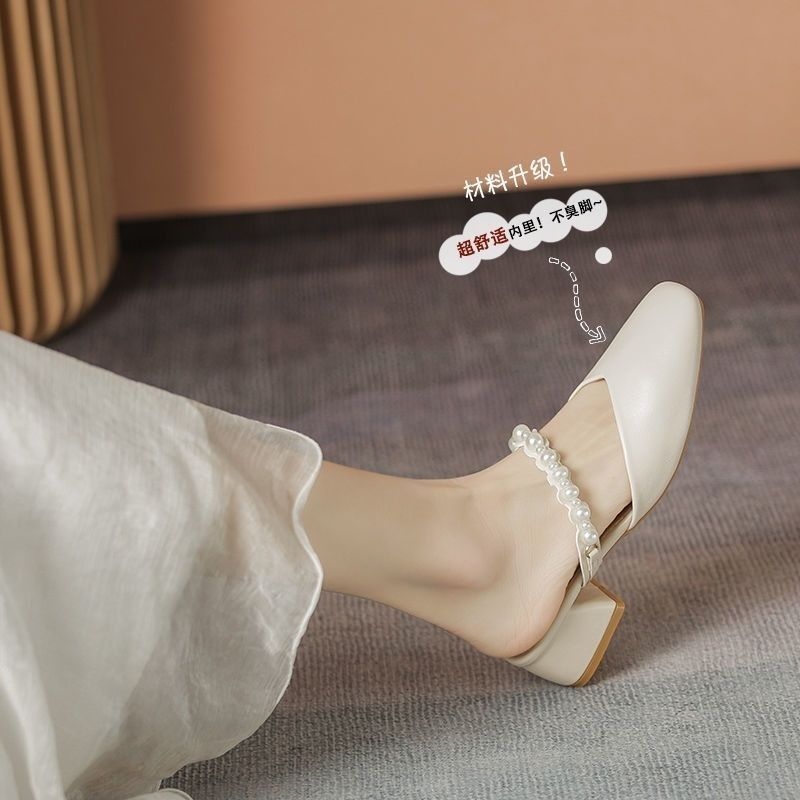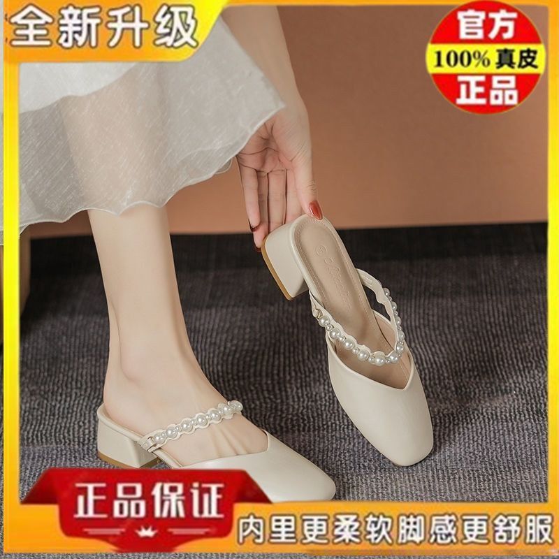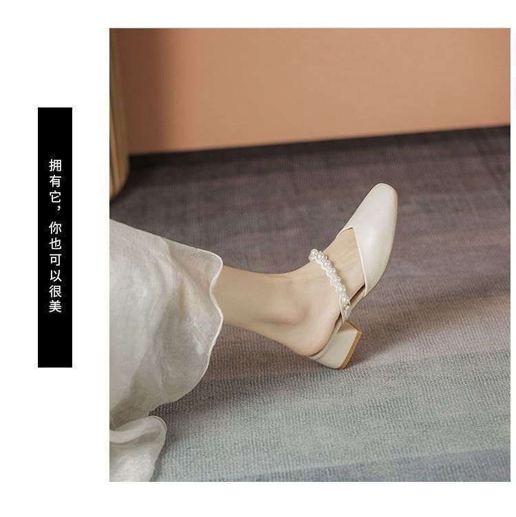 발가락 샌들 부드러운 가죽 여성 신발 외부 착용 2024 여름 새로운 올매치 청키 힐 스퀘어 토이 메리 제인 프렌치 하프 슬리퍼