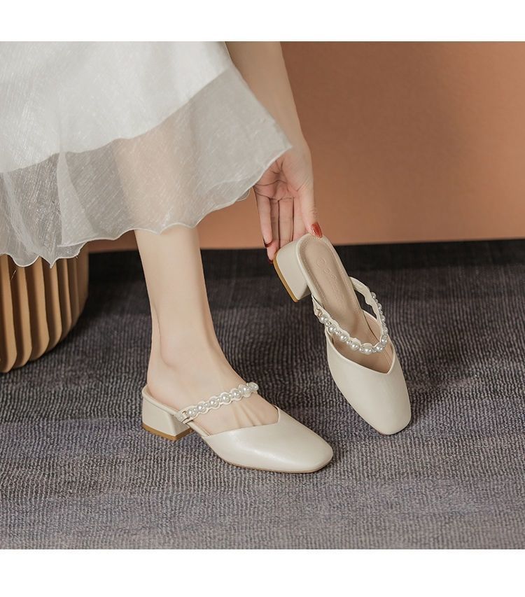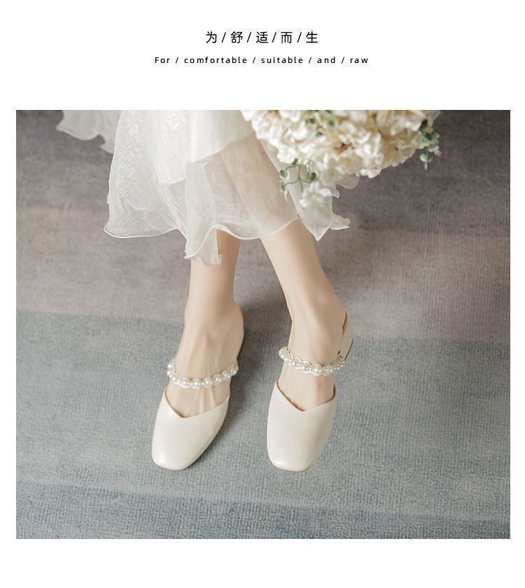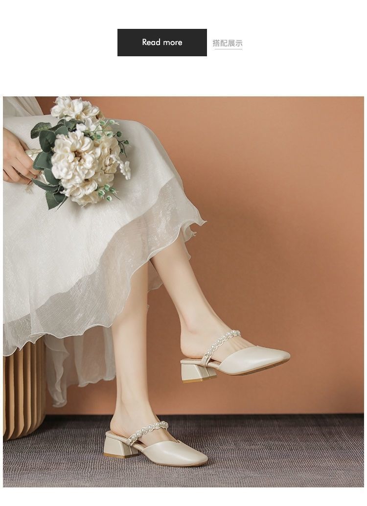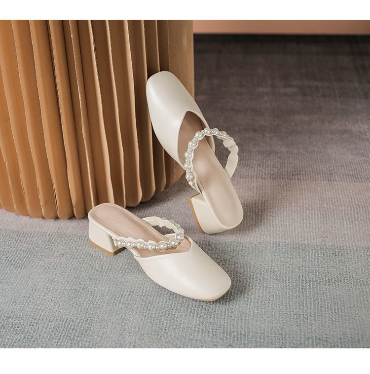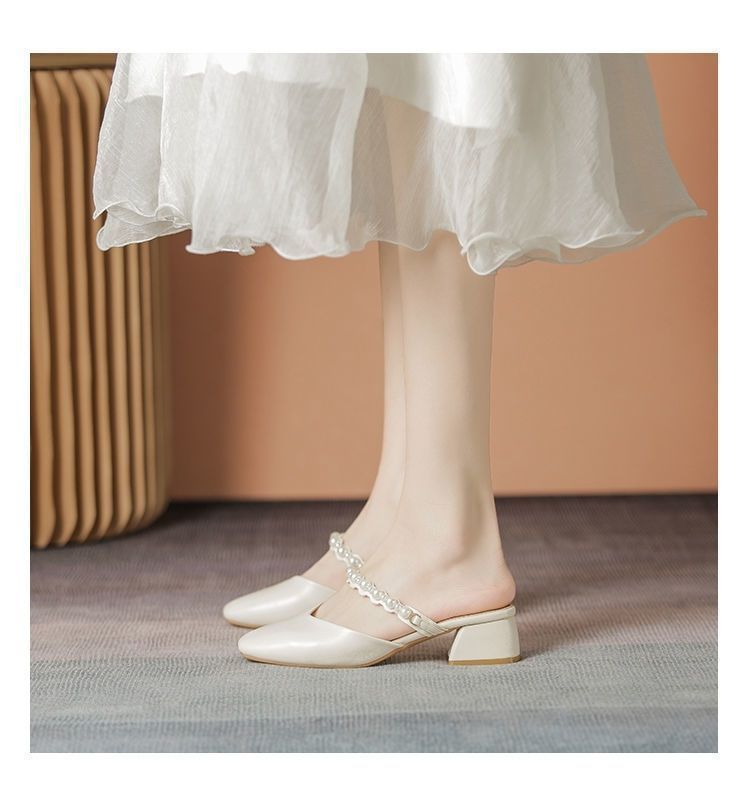 발가락 샌들 부드러운 가죽 여성 신발 외부 착용 2024 여름 새로운 올매치 청키 힐 스퀘어 토이 메리 제인 프렌치 하프 슬리퍼