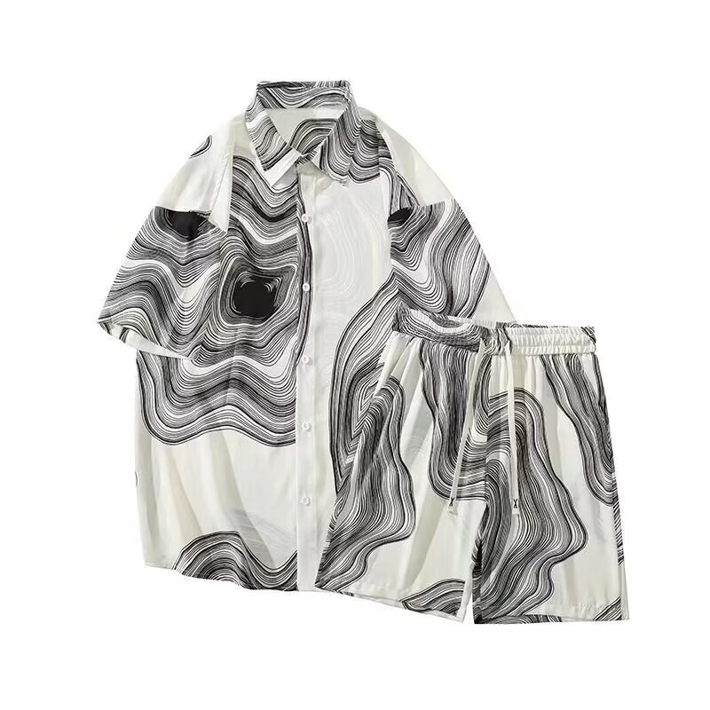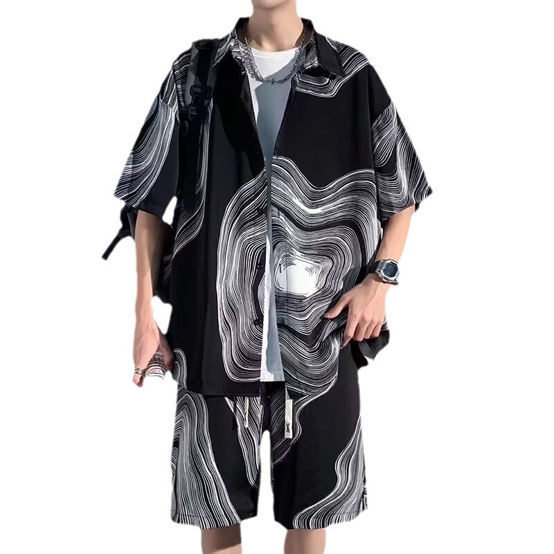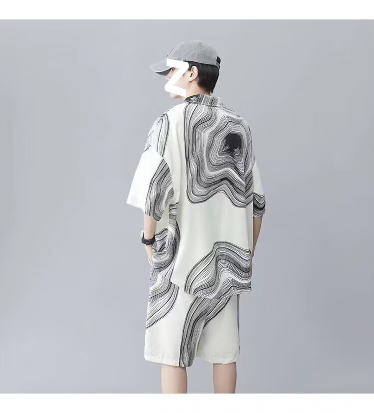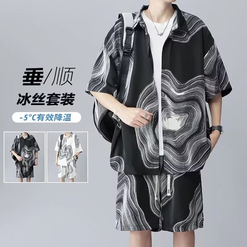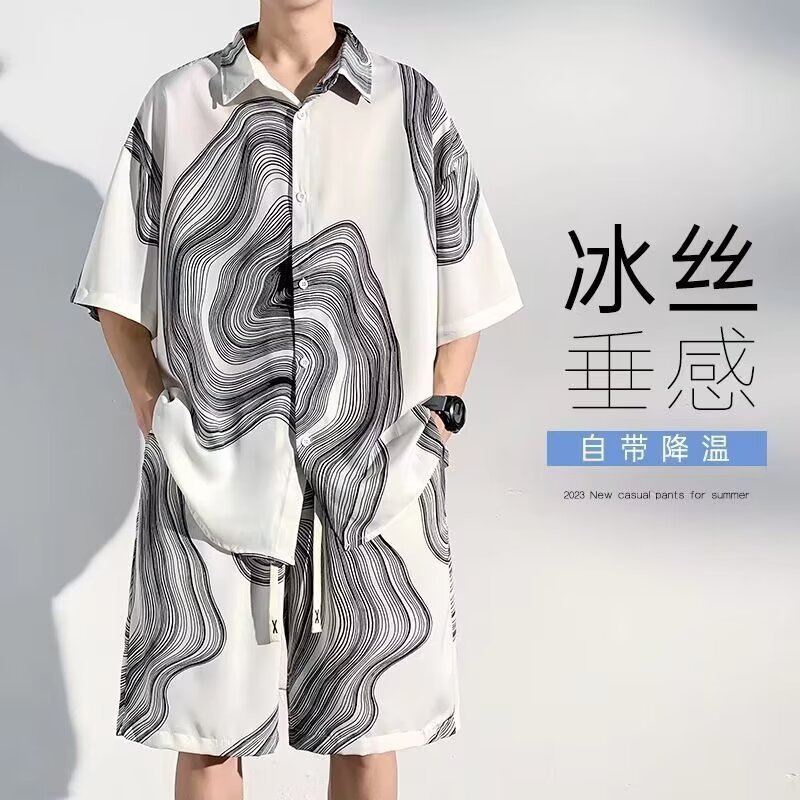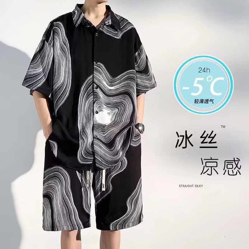 남성 여름 세트 세련된 잉크 및 잉크 전국 패션 반바지 아이스 실크 여름 비치 카디건 반팔 남성 투피스 세트