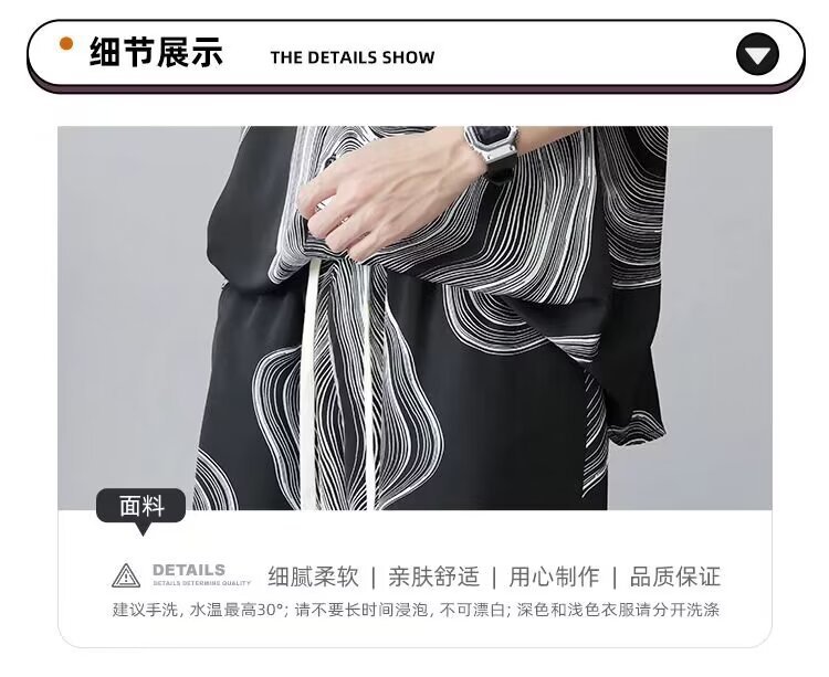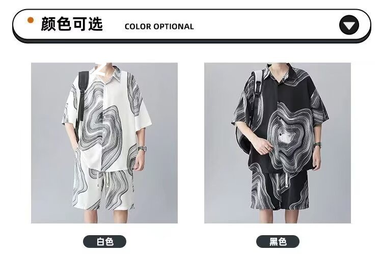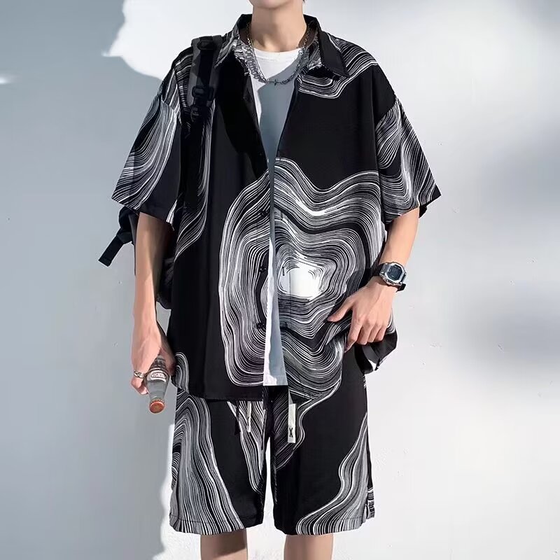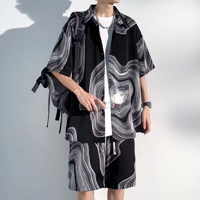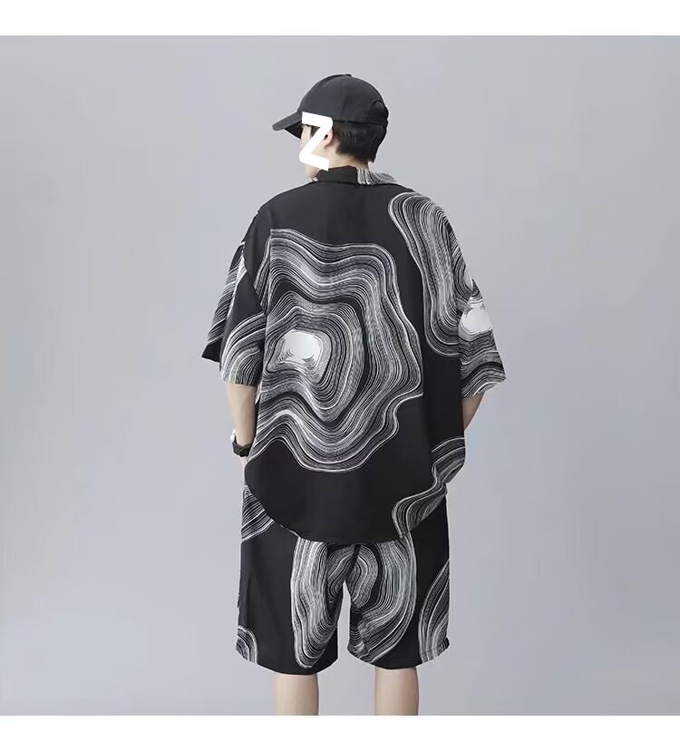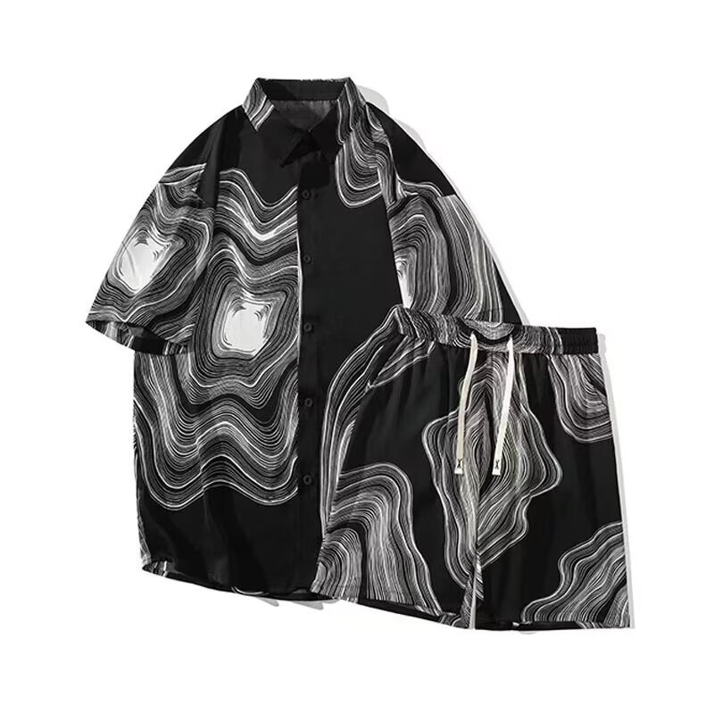 남성 여름 세트 세련된 잉크 및 잉크 전국 패션 반바지 아이스 실크 여름 비치 카디건 반팔 남성 투피스 세트