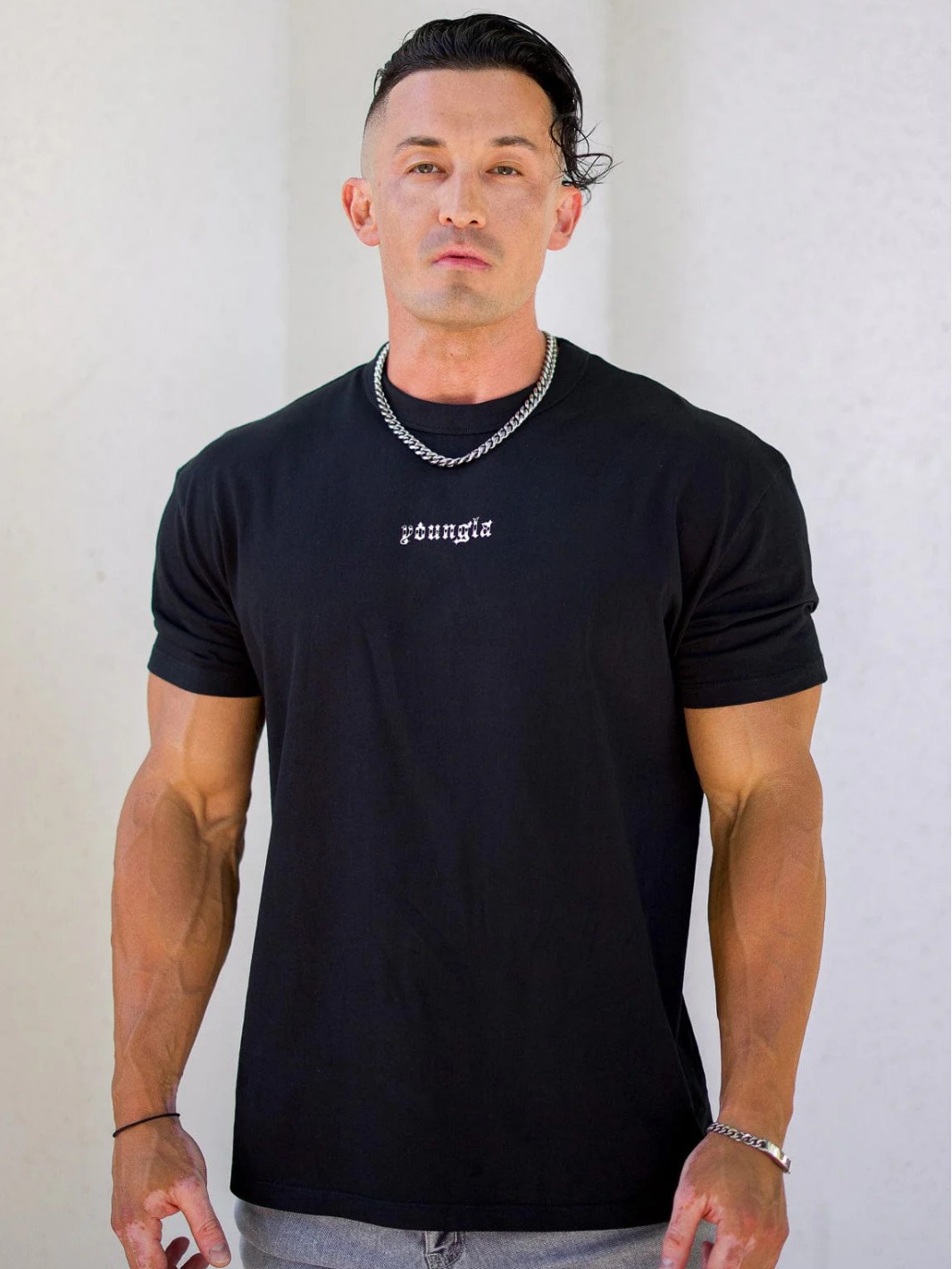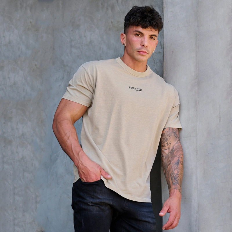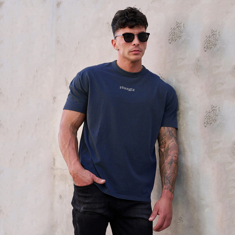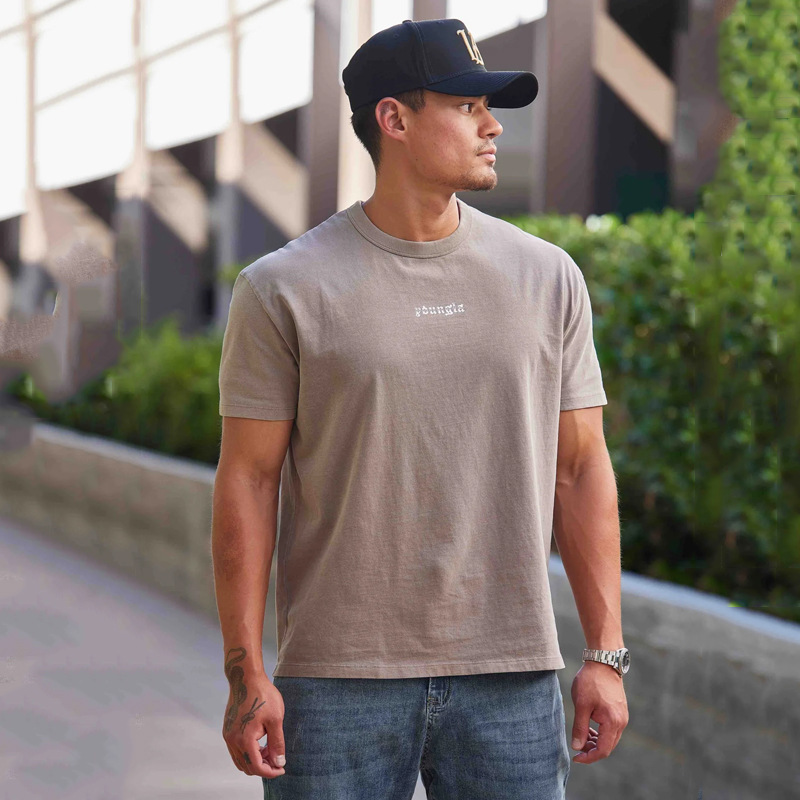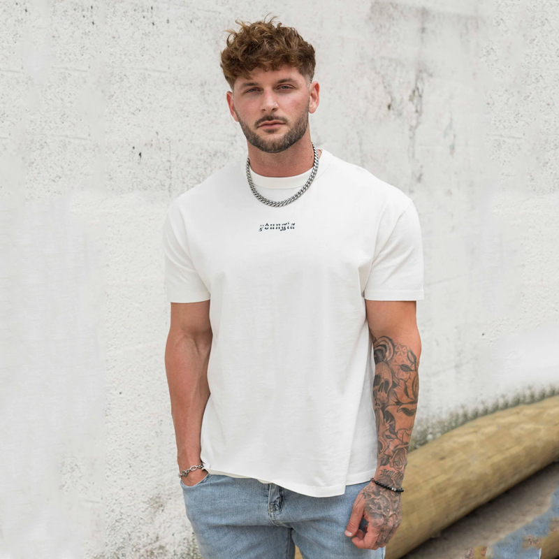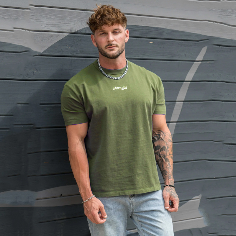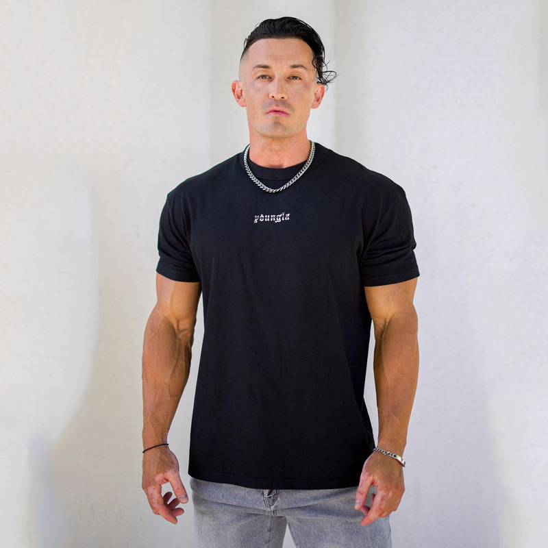 YOUNGLA 남자 대형 티셔츠 근육 스포츠 피트니스 코튼 라운드 넥 짧은 소매 체육관 달리기 농구 훈련