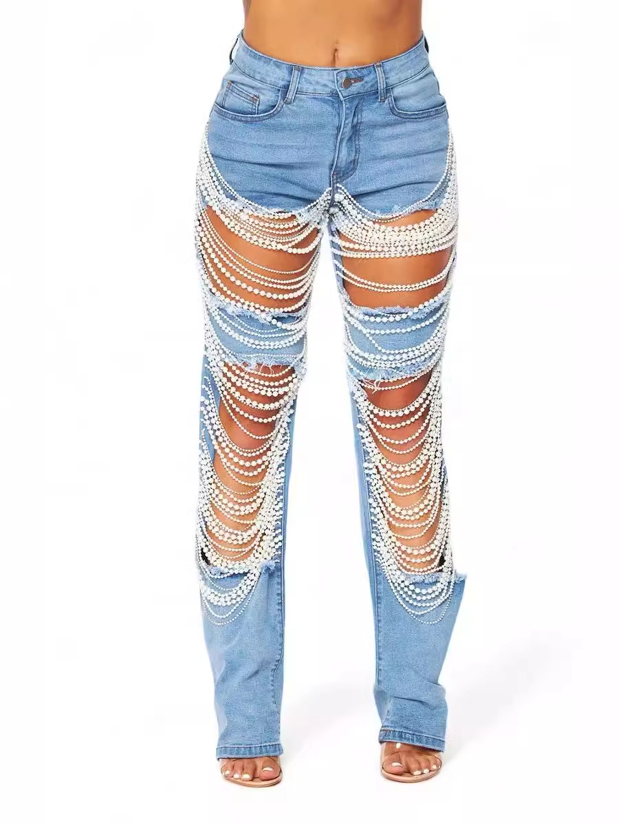 INS Amazon AliExpress 유럽과 미국 국경 2024 큰 구멍 청바지 여성 체인 비드 체인 매달려 스트레이트 팬츠