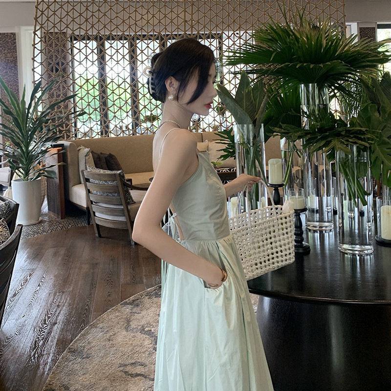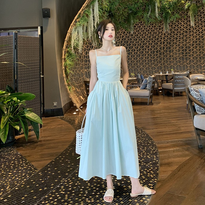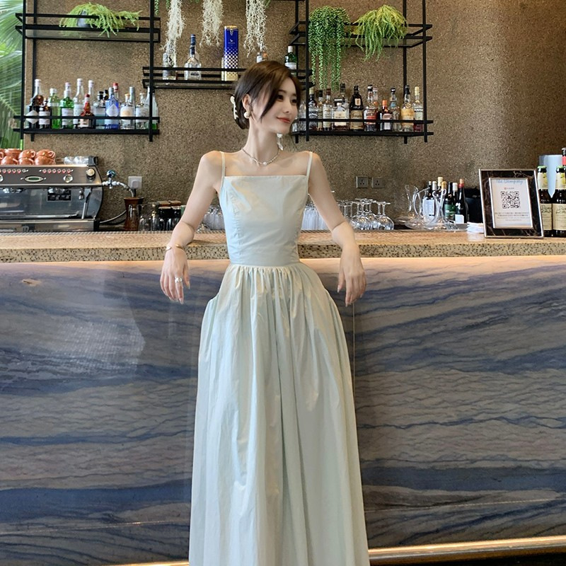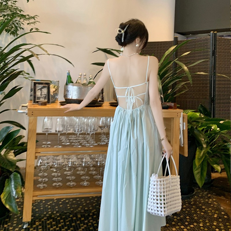 도파민 Backless Sling 원피스 여성의 여름 타이트 허리 슬리밍 요정 해변 원피스 해변 휴일 긴 원피스
