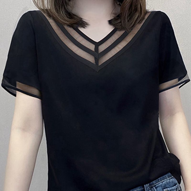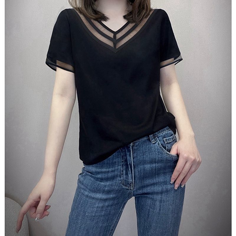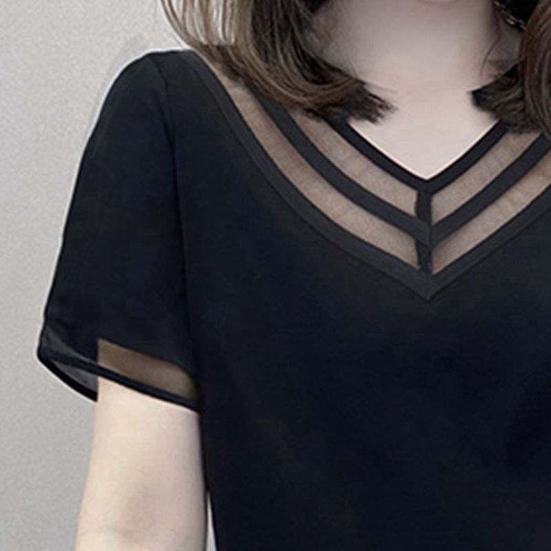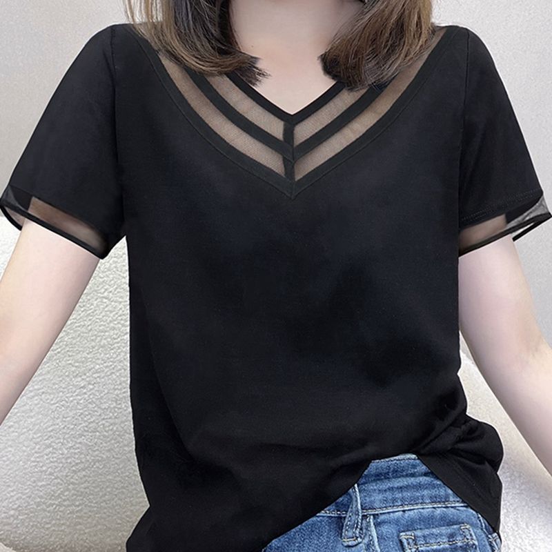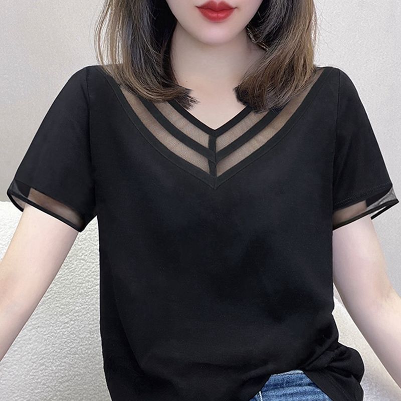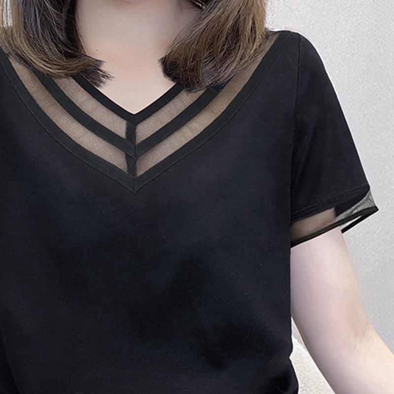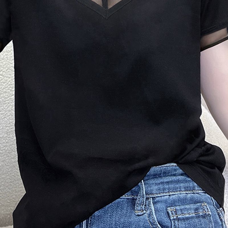 통통녀 초대형 300kg 여름 블랙 V 넥 메쉬 스티칭 반팔 티셔츠 여성용 배꼽 커버 연령 감소 바닥 셔츠