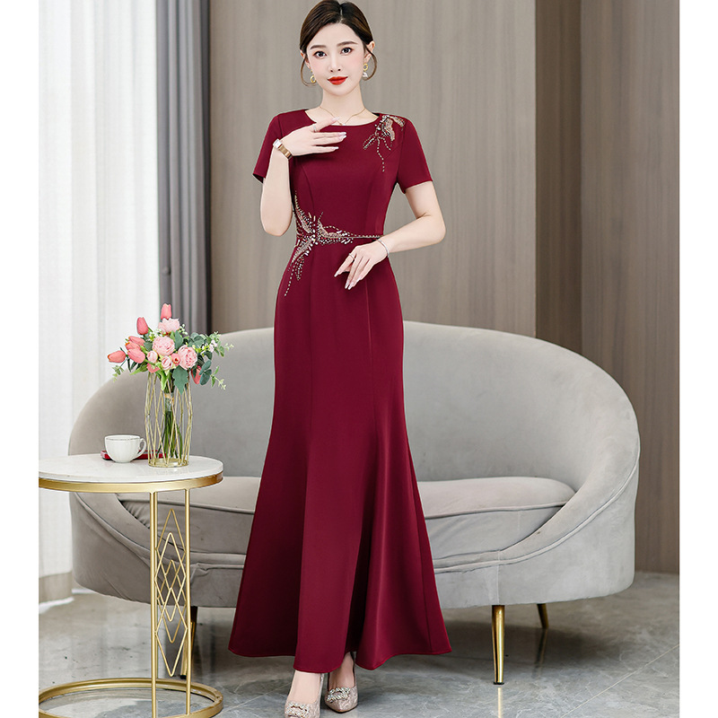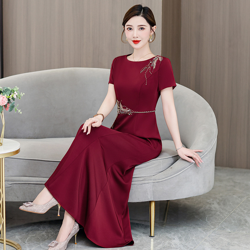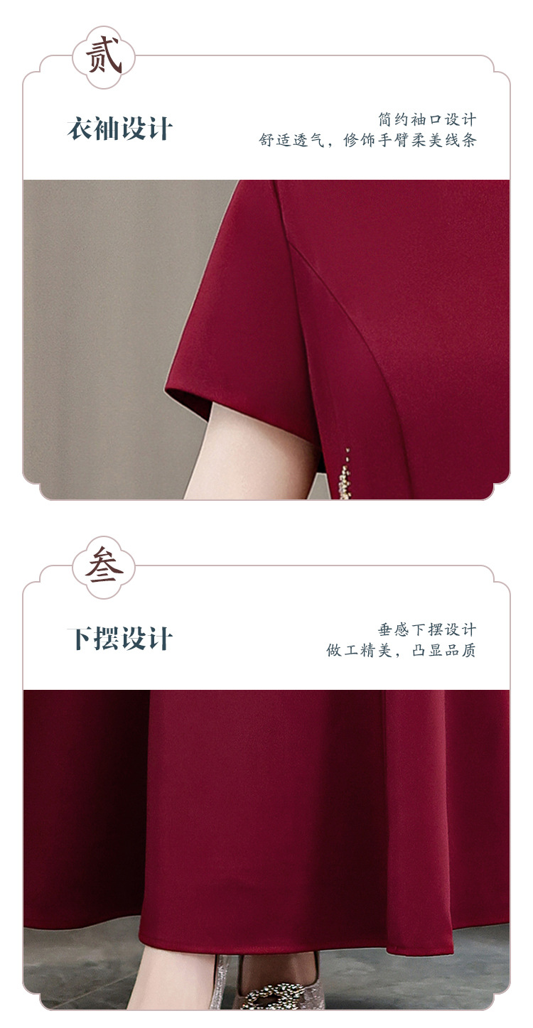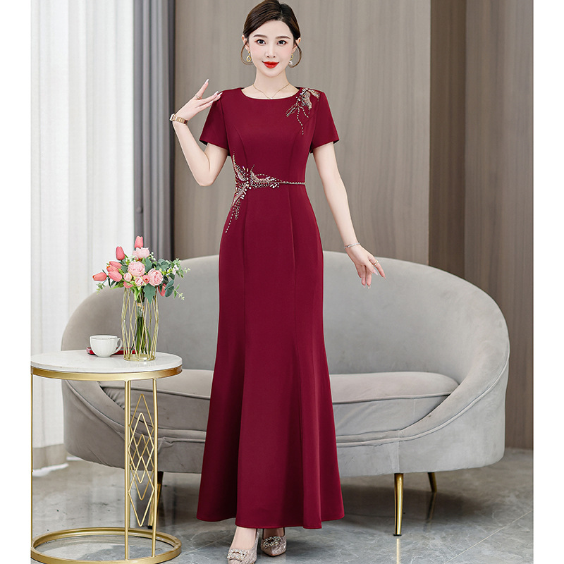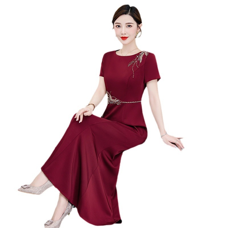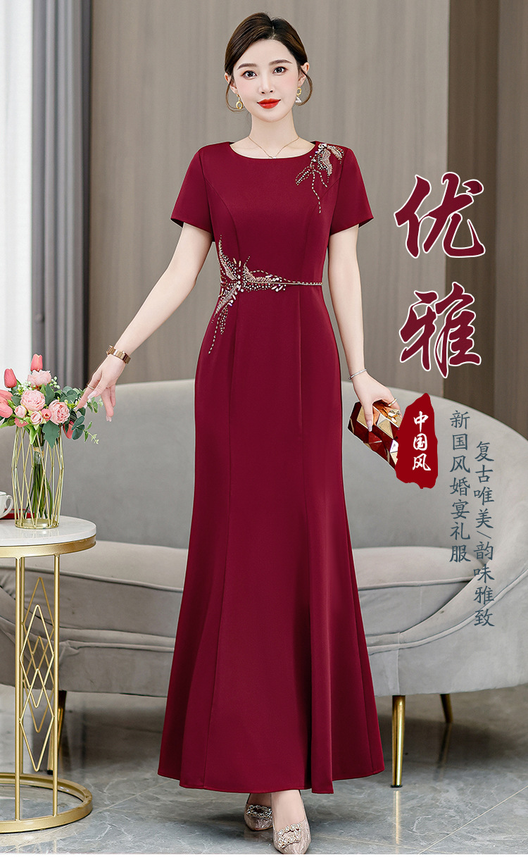 중국 스타일 우아한 웨딩 원피스 원피스 2024 여름 새로운 어머니 원피스 중공업 구슬 버건디 원피스