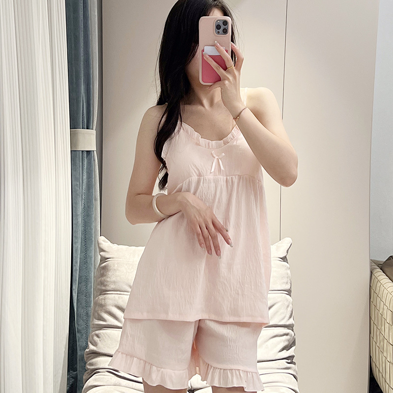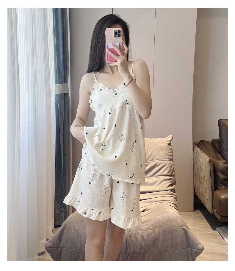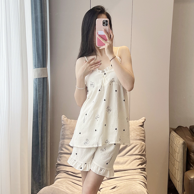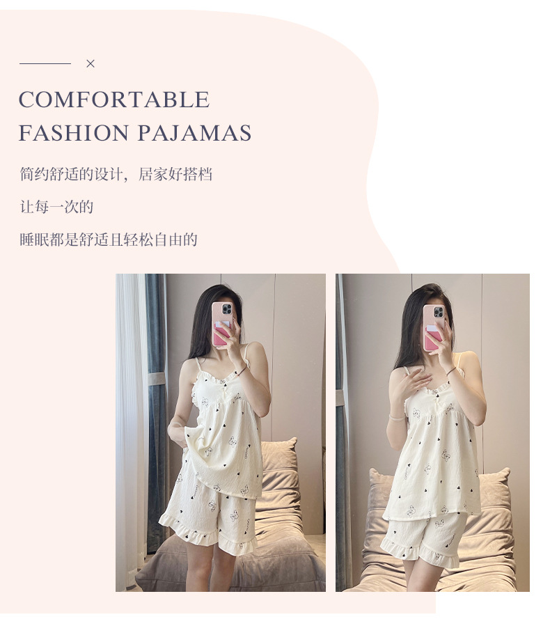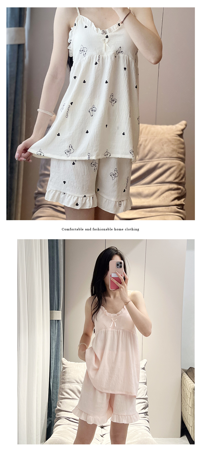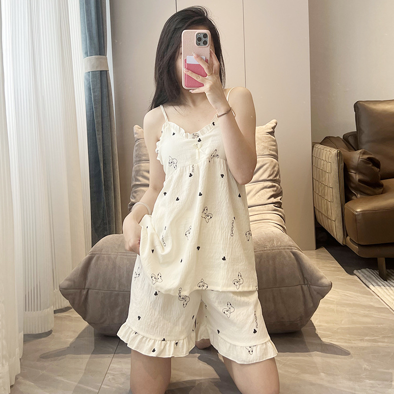 여름 새로운 구름 면 파자마 여성용 슬링 반바지 풀 오버 투피스 세트 가슴 패드 달콤한 캐주얼 홈 의류