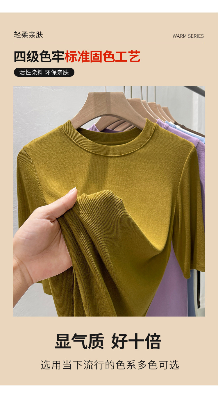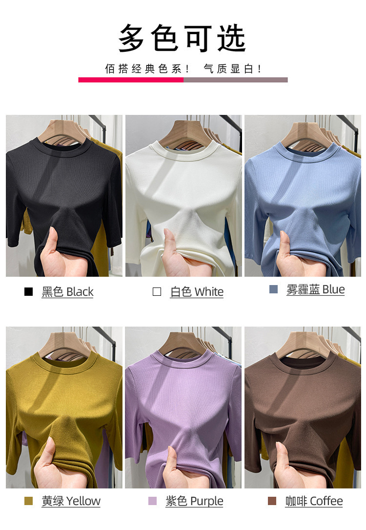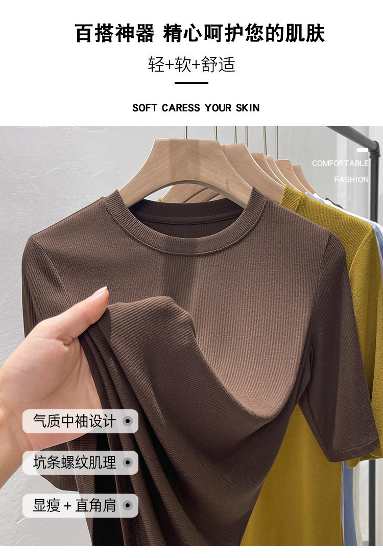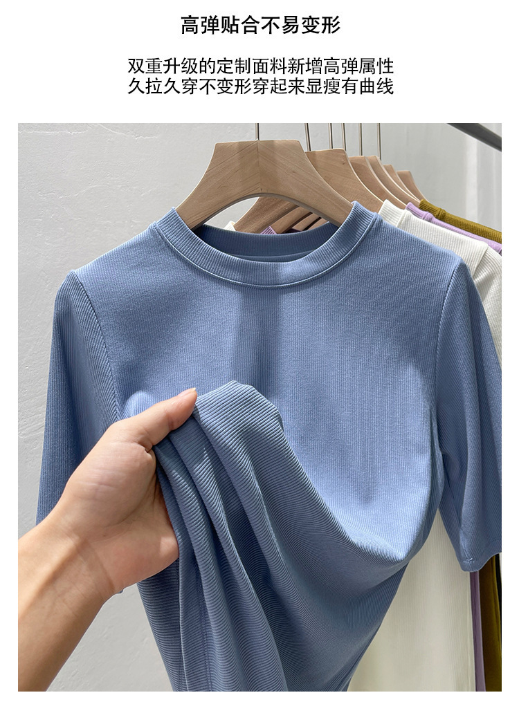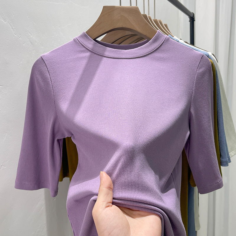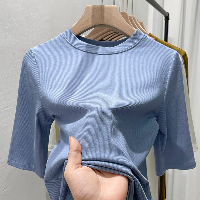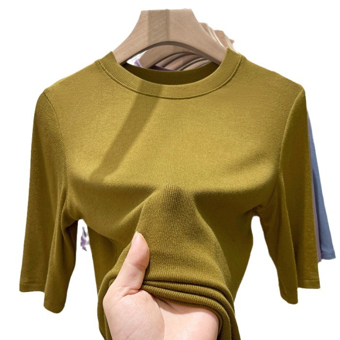 여름 여성 아이스 실크 스레드 패션 슬림 핏 솔리드 컬러 반소매 베이스 셔츠 낮은 라운드 넥 올 매치 탑