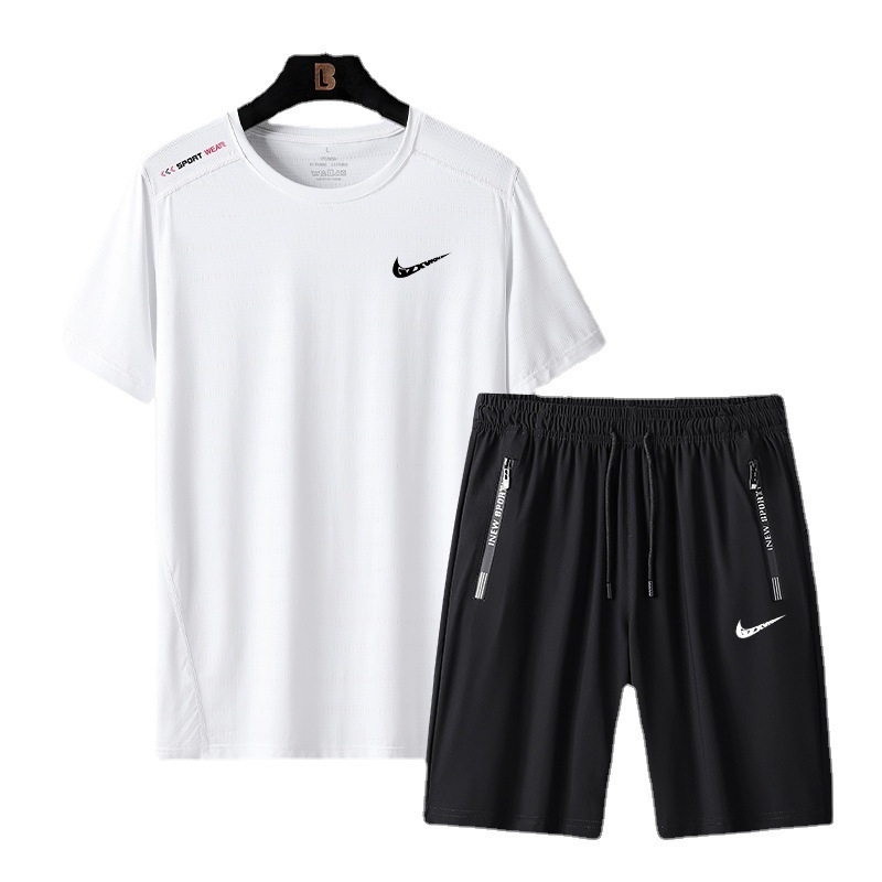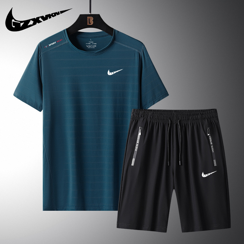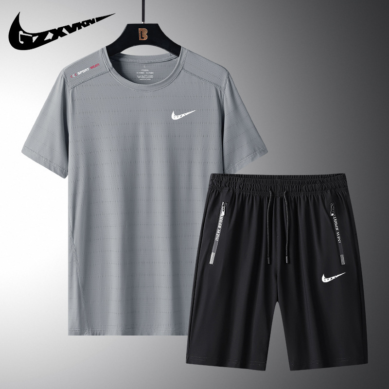 브랜드 여름 뉴 세트 남성용 아이스 실크 얇은 스포츠 캐주얼 반팔 빠른 건조 티셔츠/반바지 세트 투피스 세트