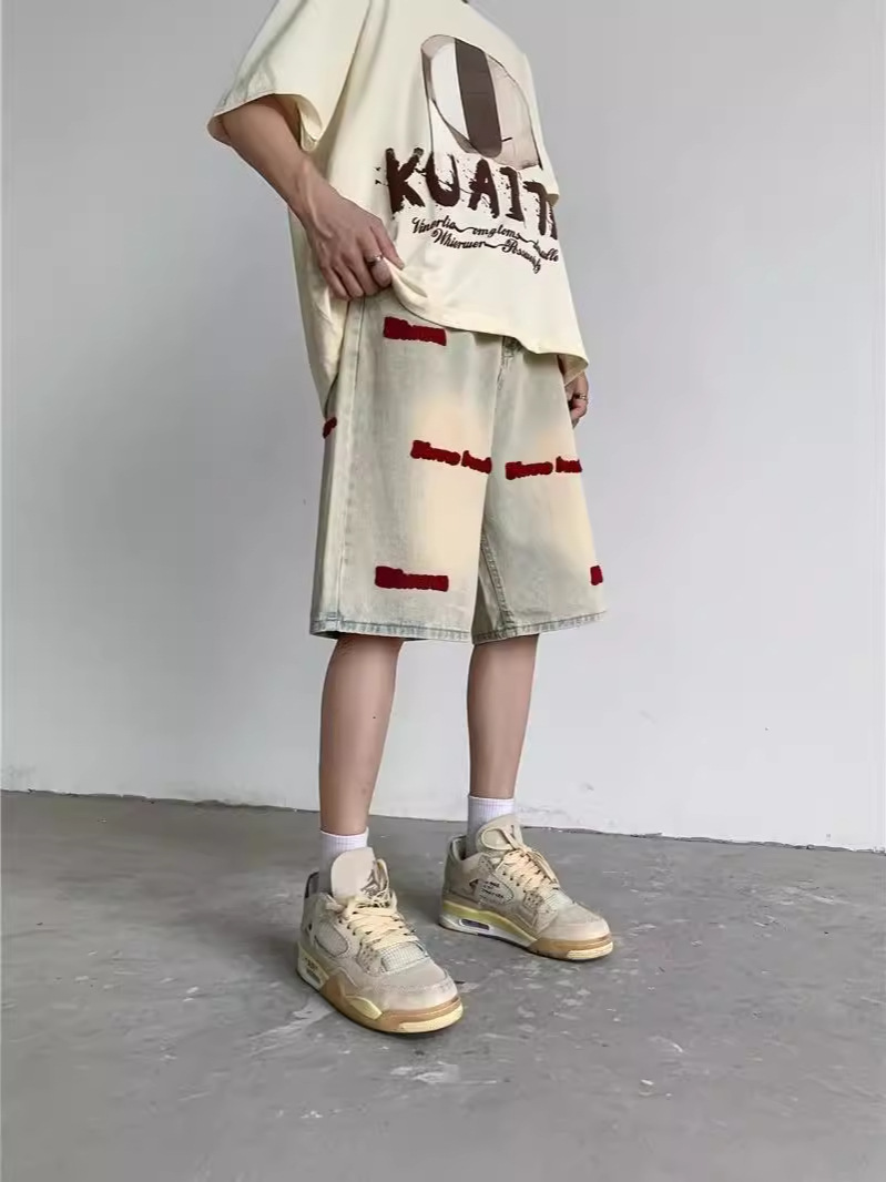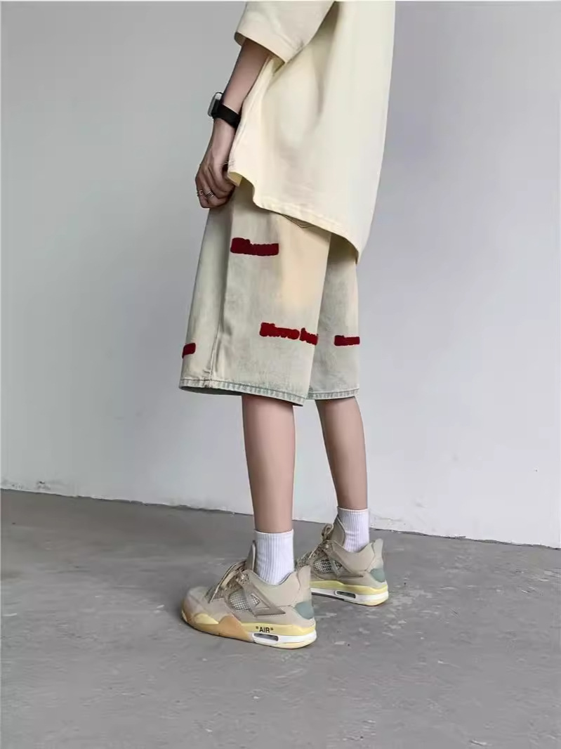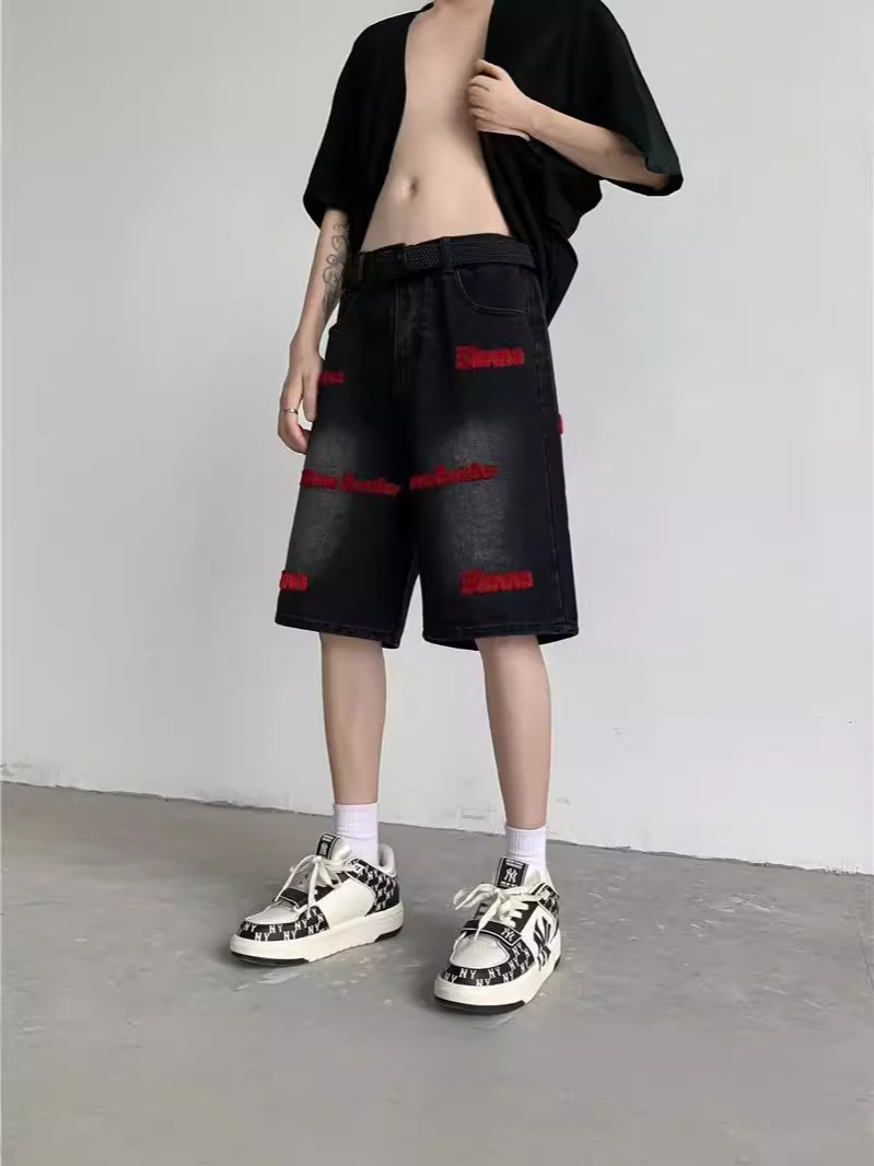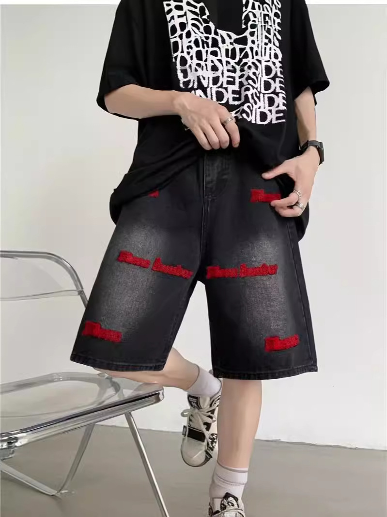 미국 스타일의 하이 스트리트 자수 데님 중형 바지 작은 스트레이트 반바지 2024 바지 잘 생긴 디자인 센스 남성