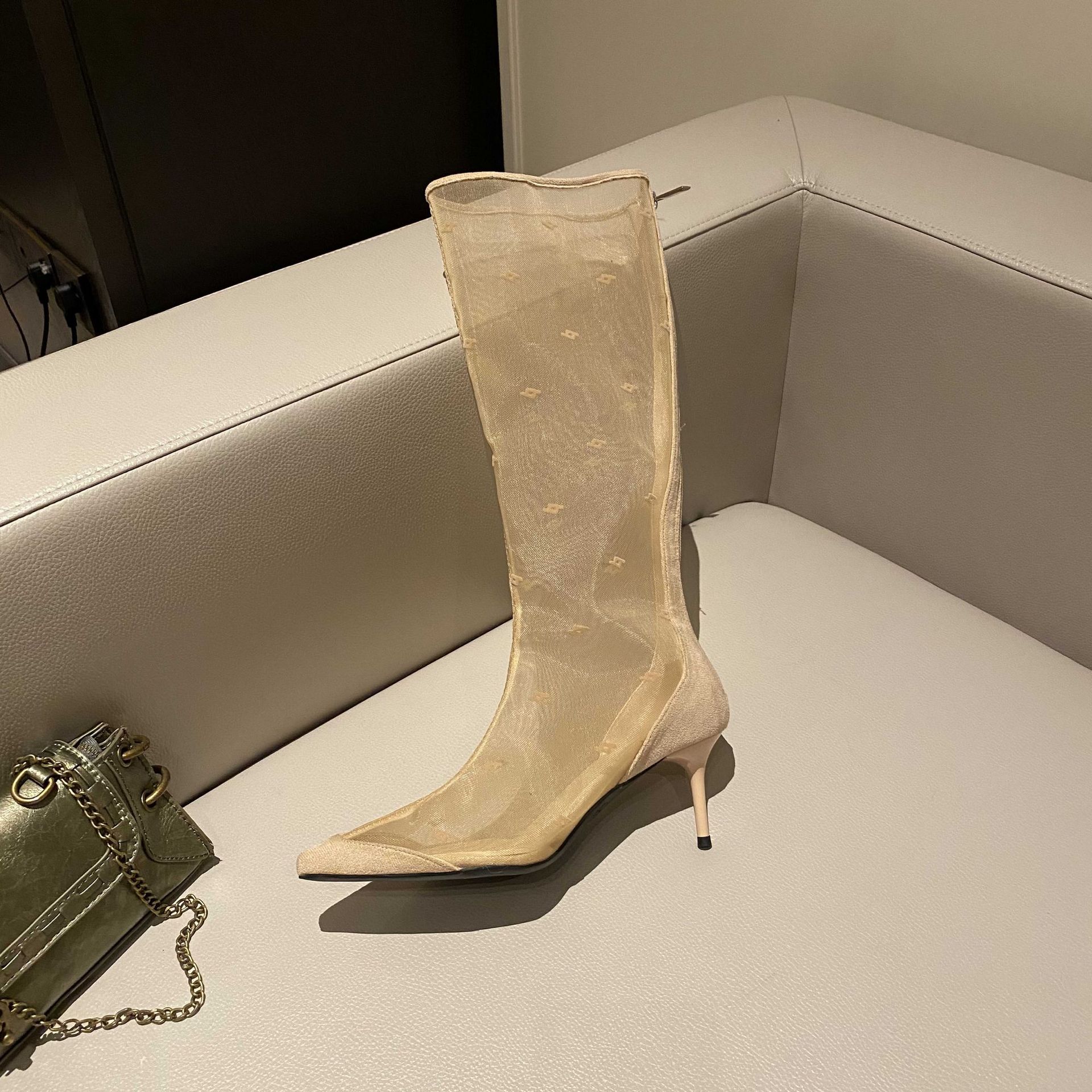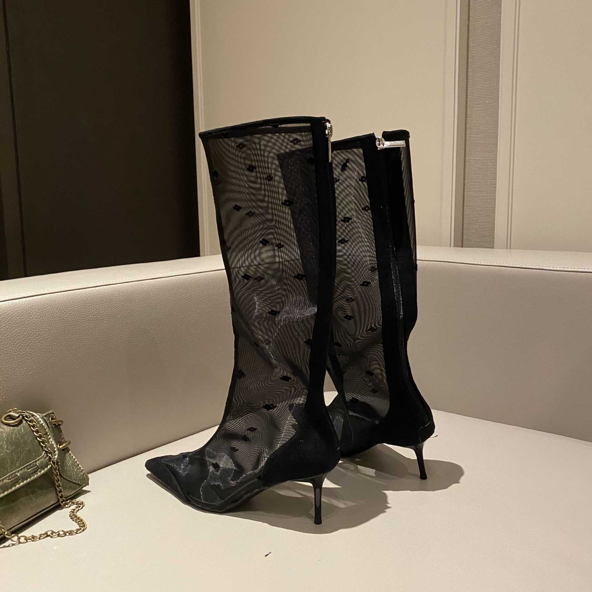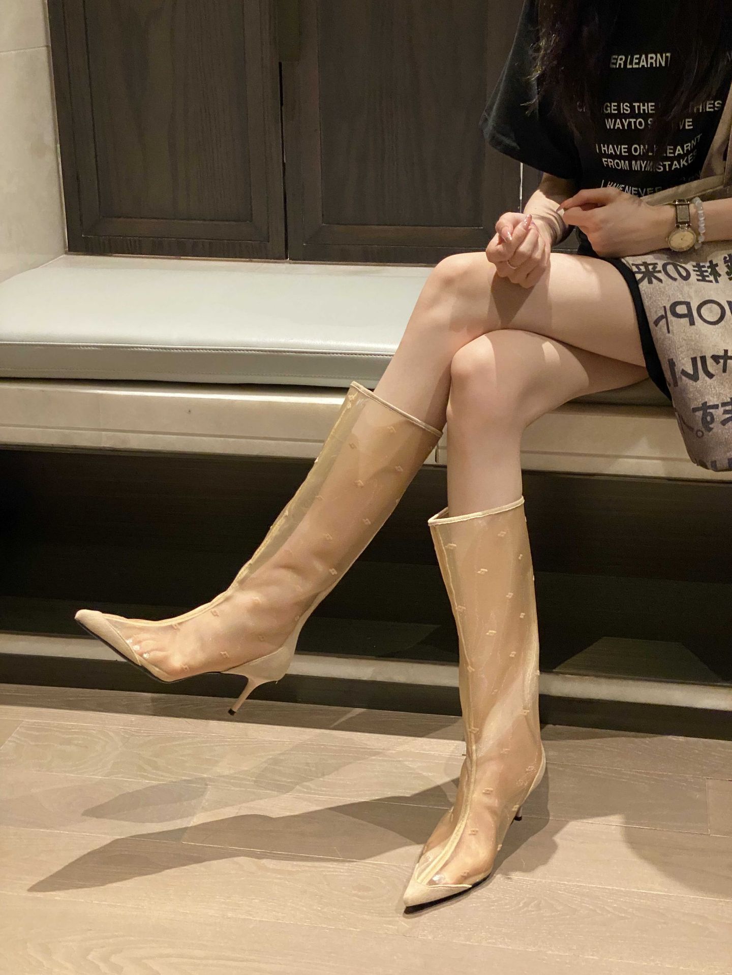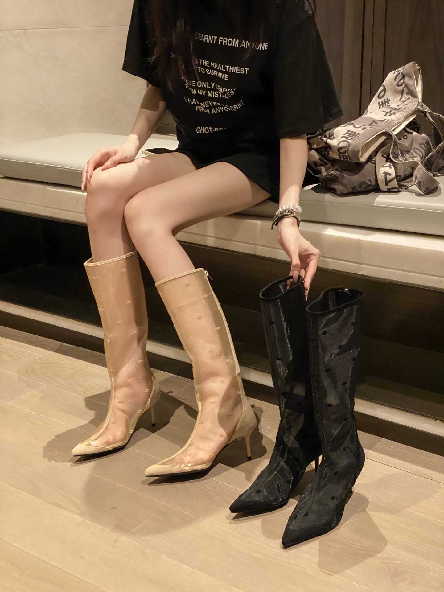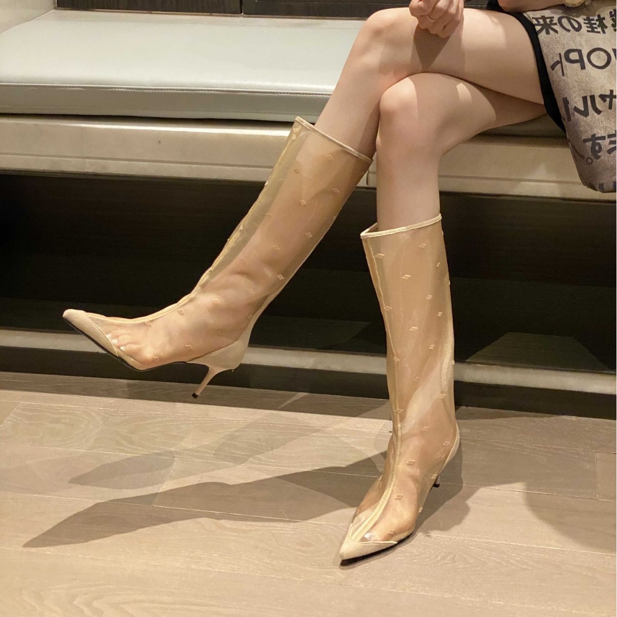 한국 스타일 세련된 투명 메쉬 롱 부츠 여성 2024 년 여름 새 백 지퍼 통기성 얇은 힐 하이힐 부츠