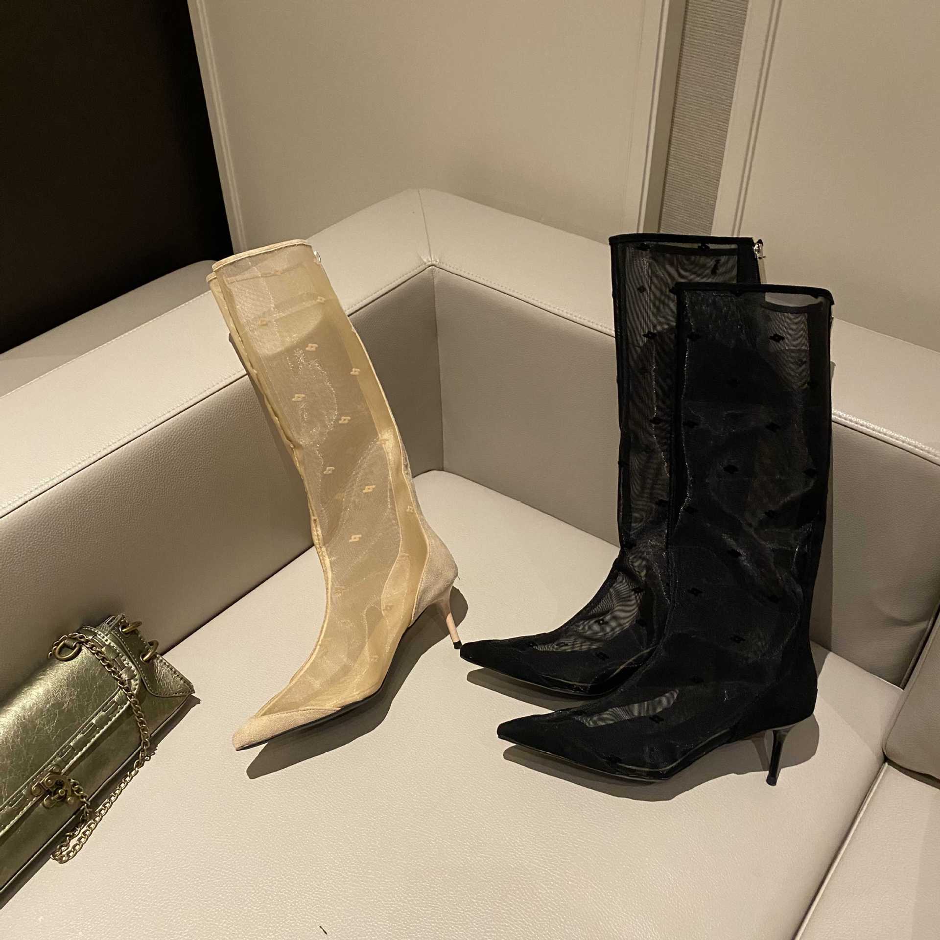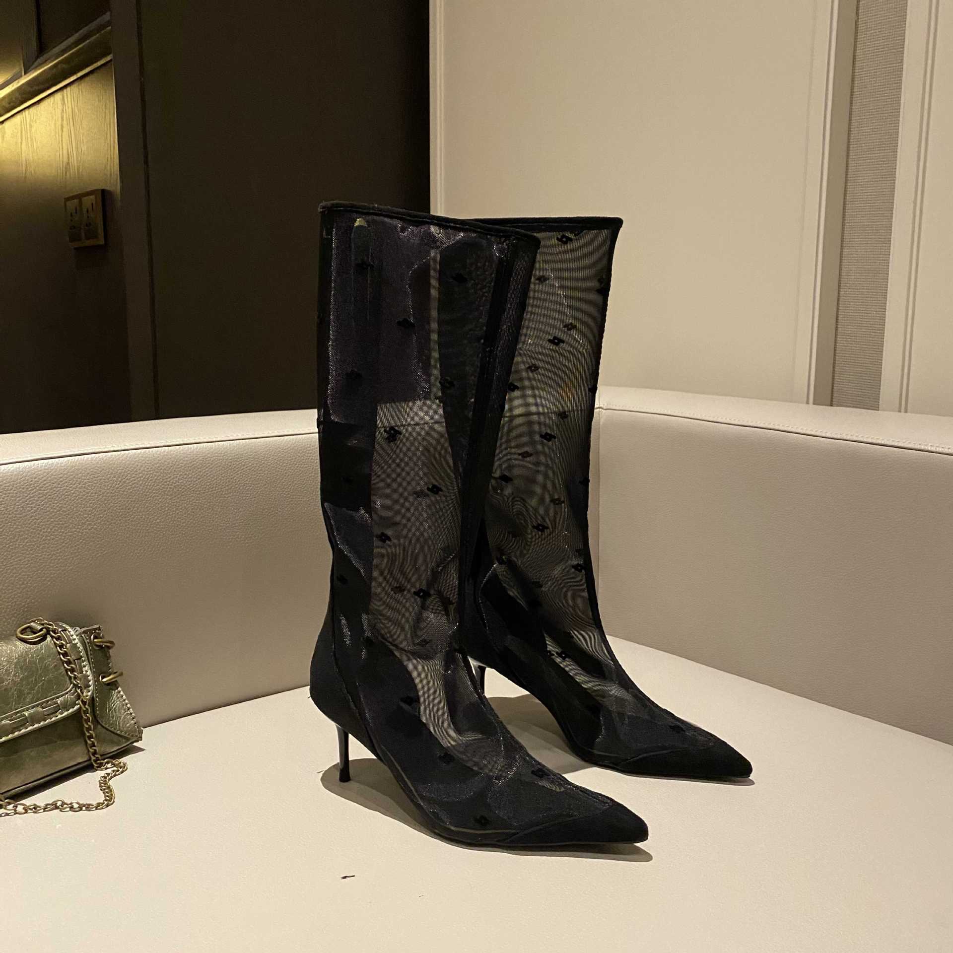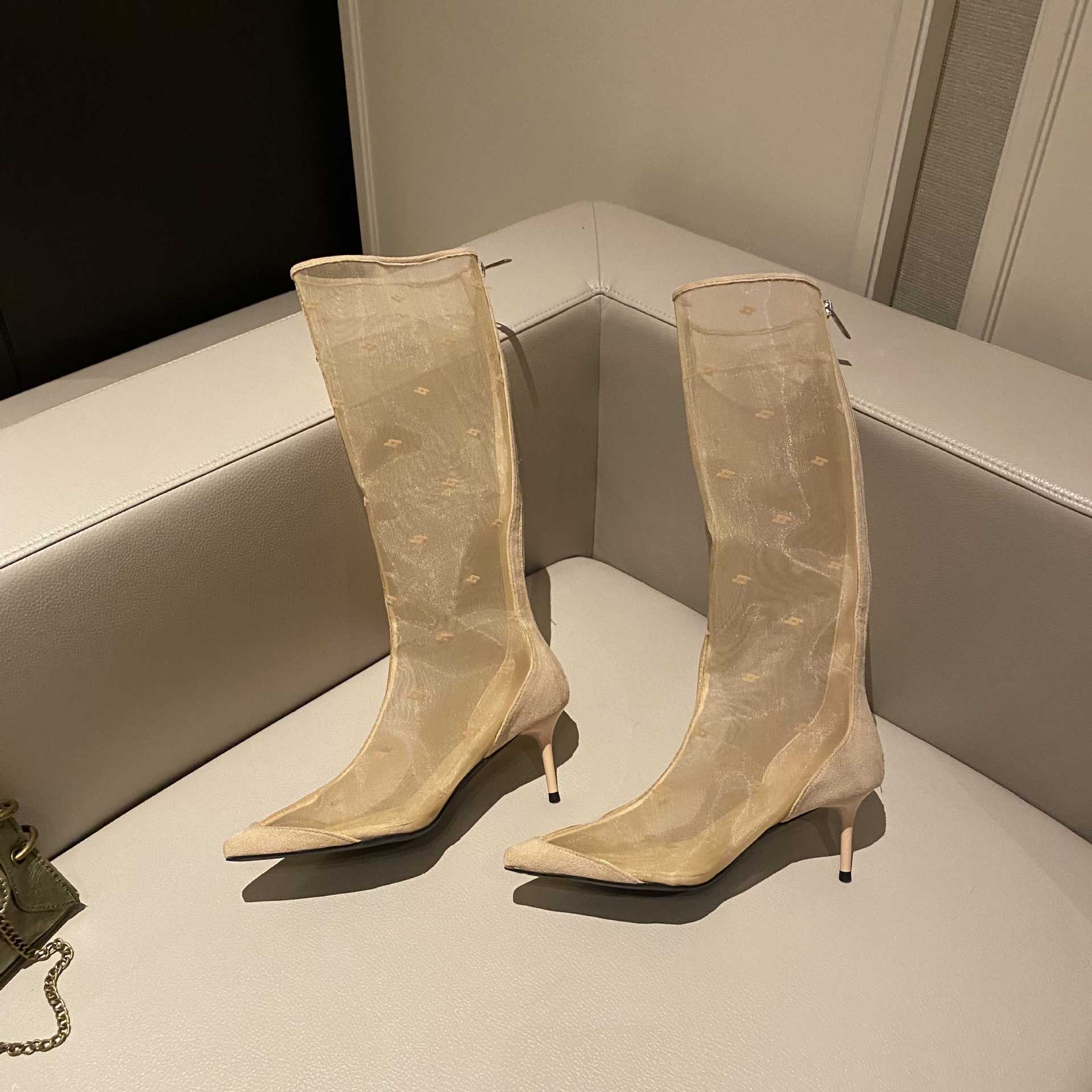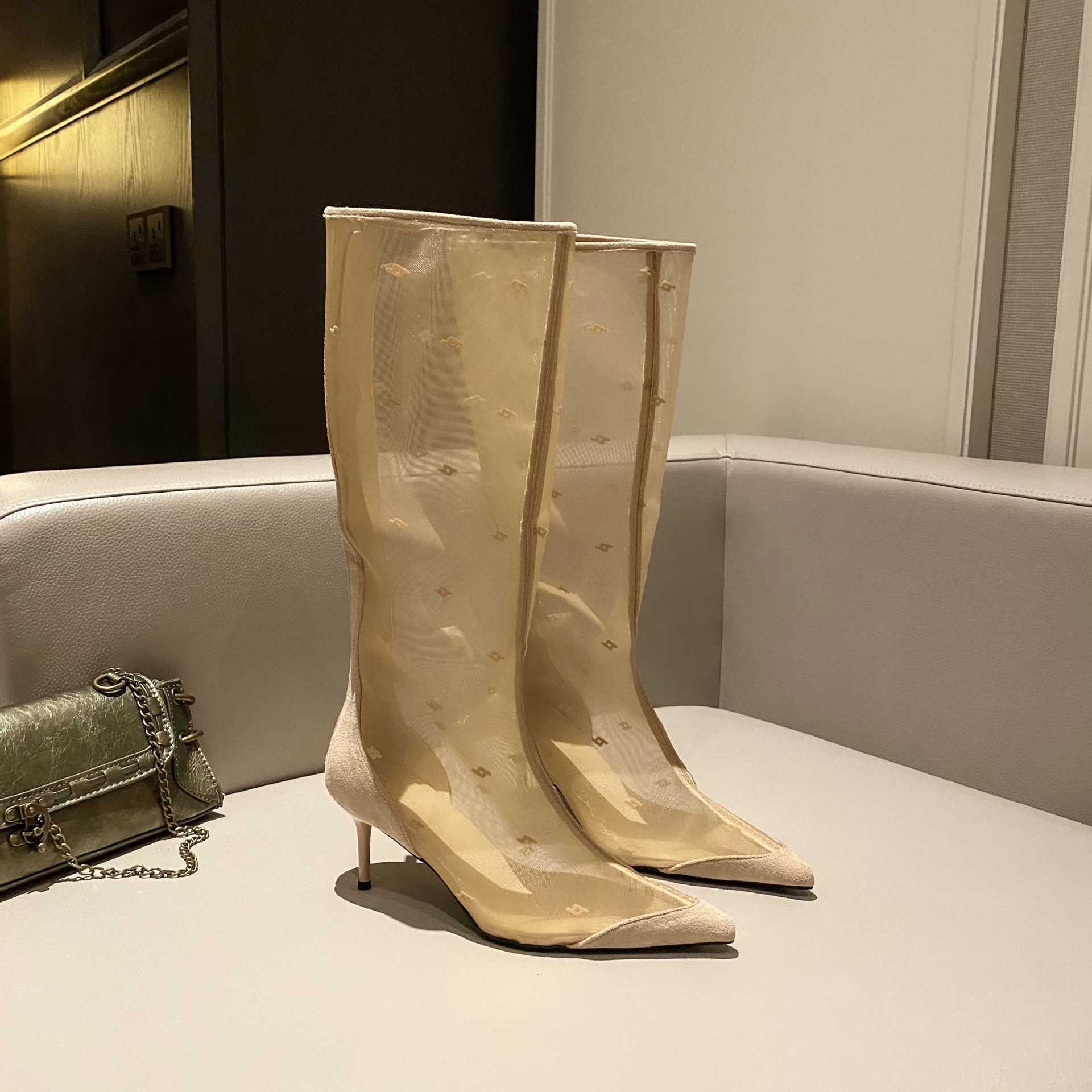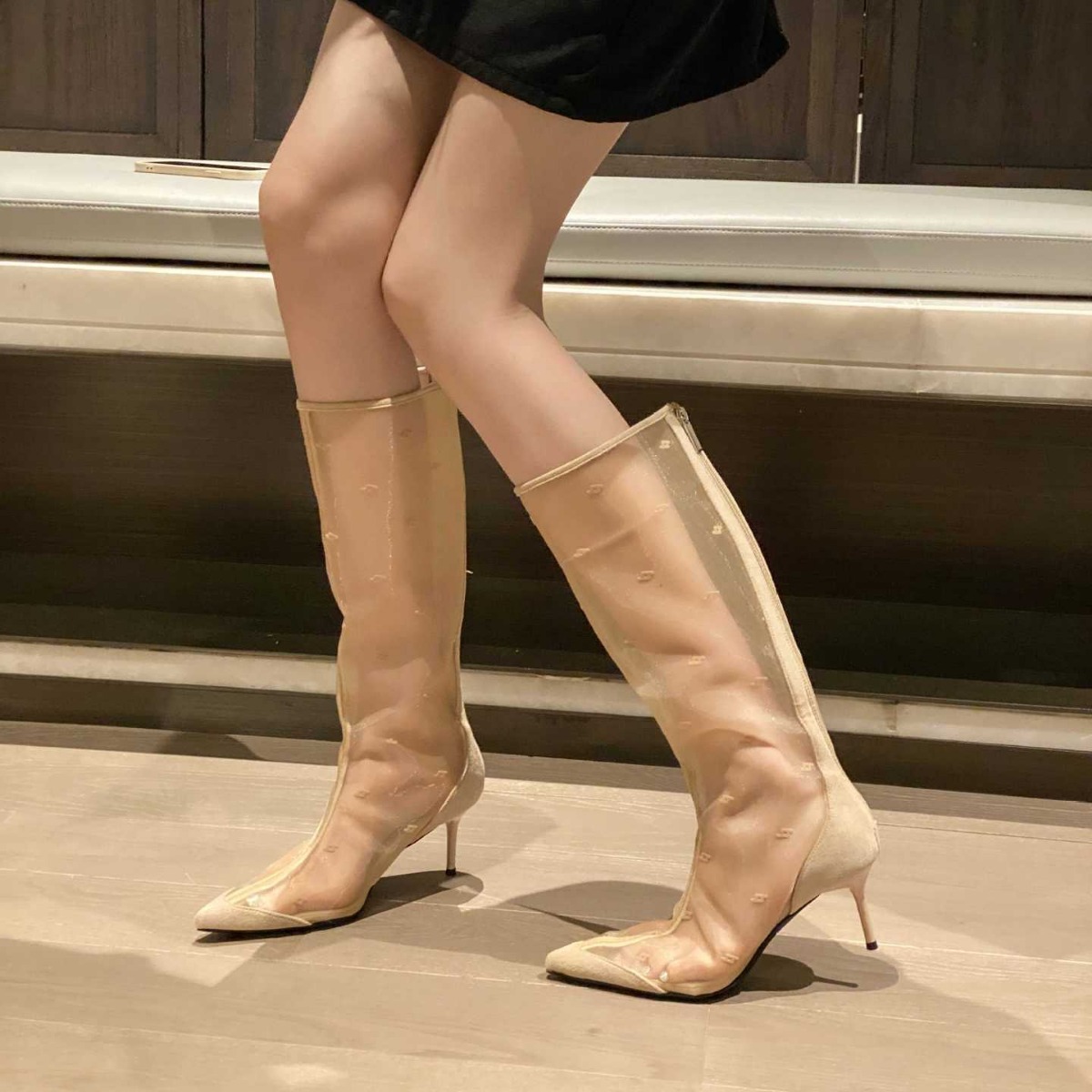 한국 스타일 세련된 투명 메쉬 롱 부츠 여성 2024 년 여름 새 백 지퍼 통기성 얇은 힐 하이힐 부츠