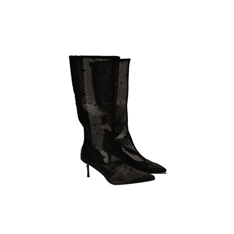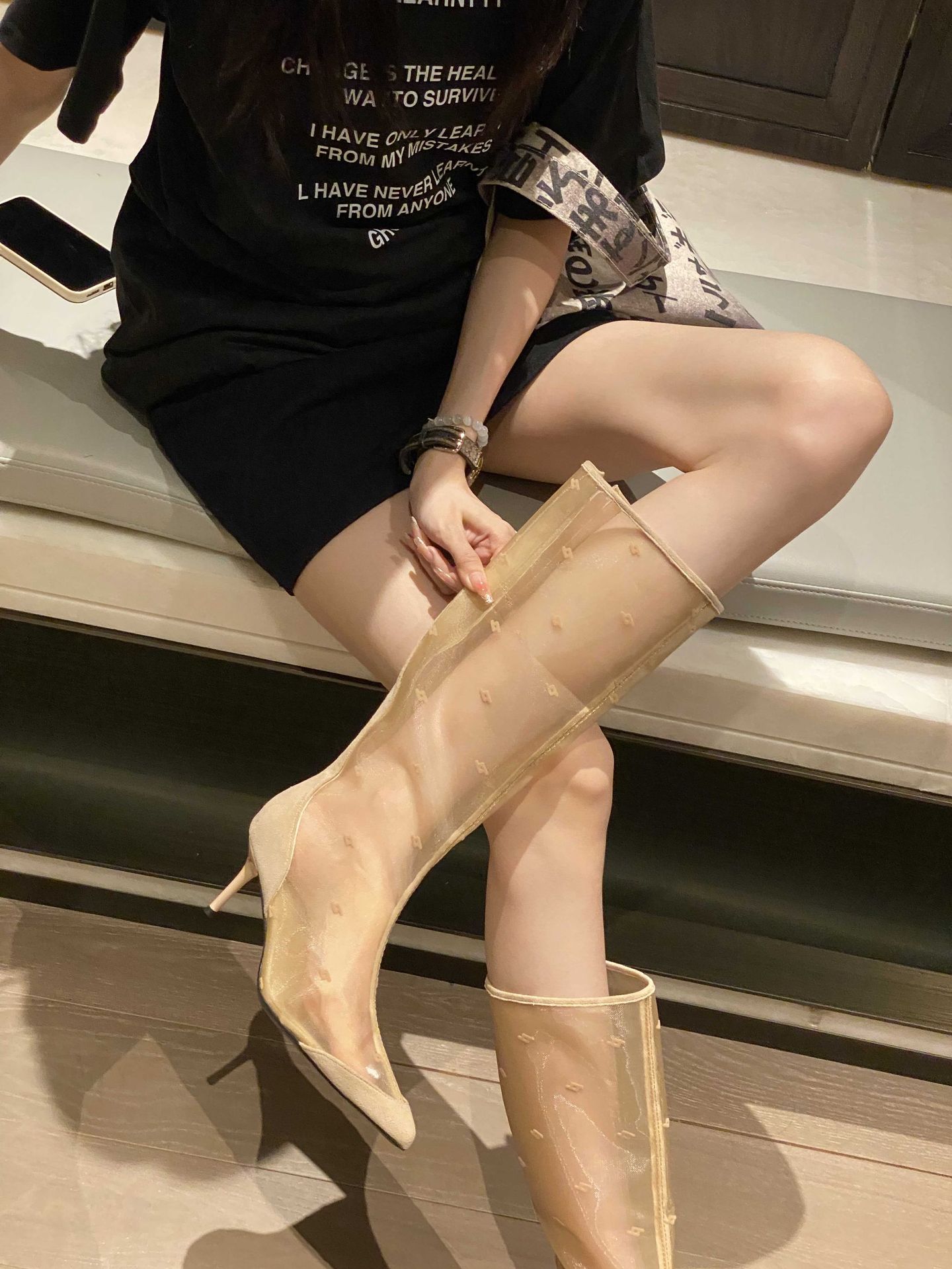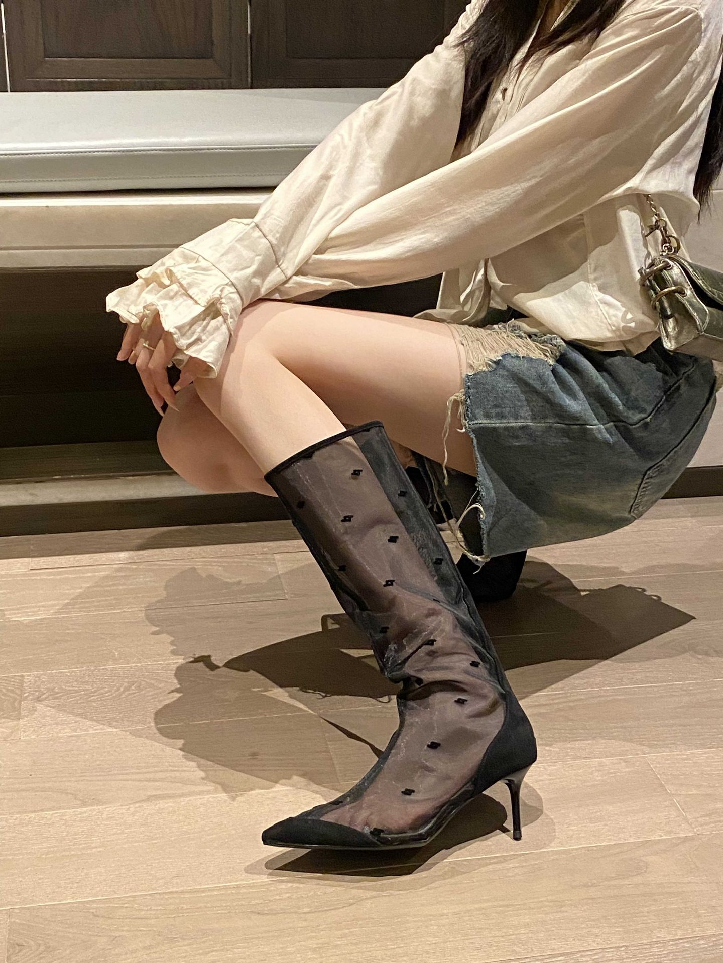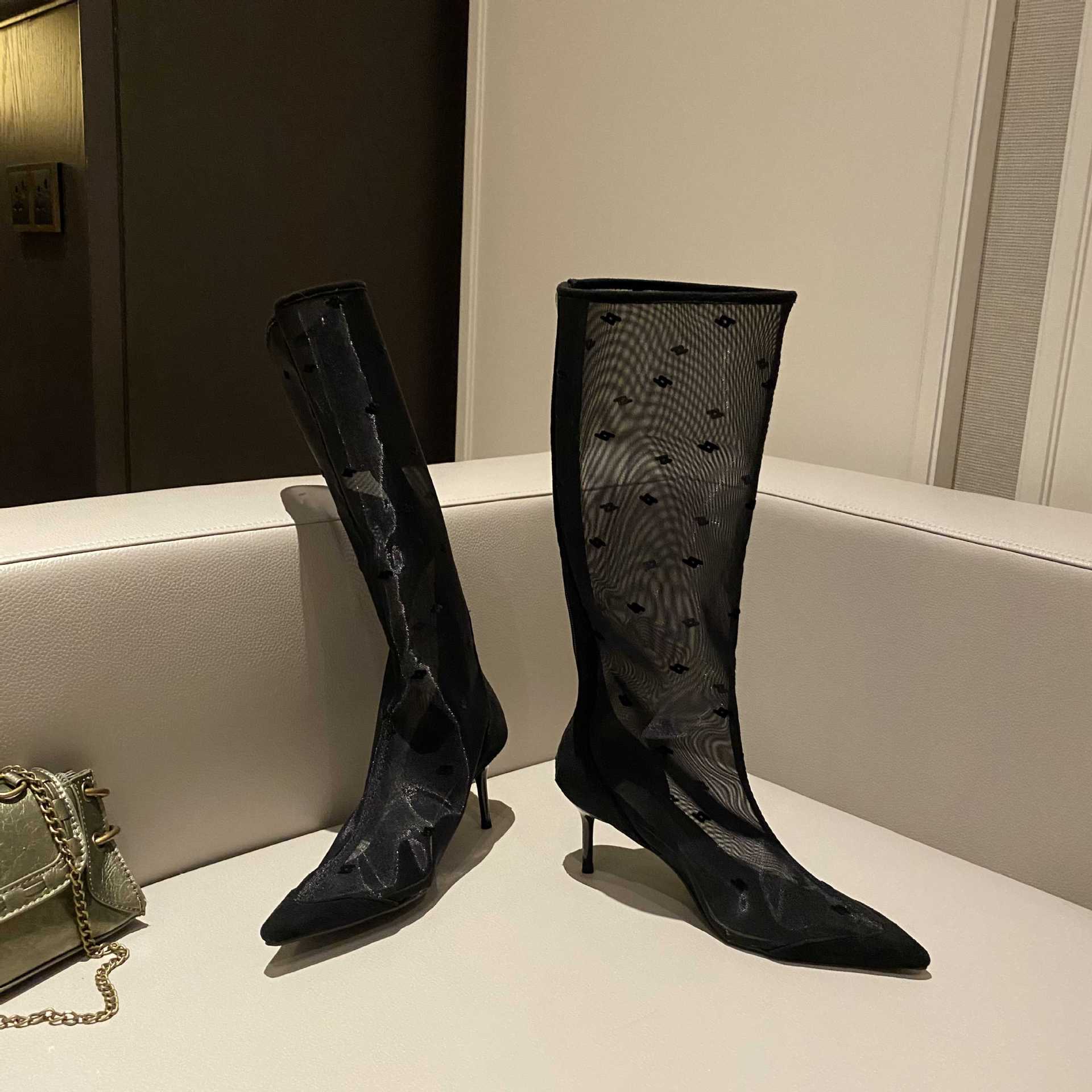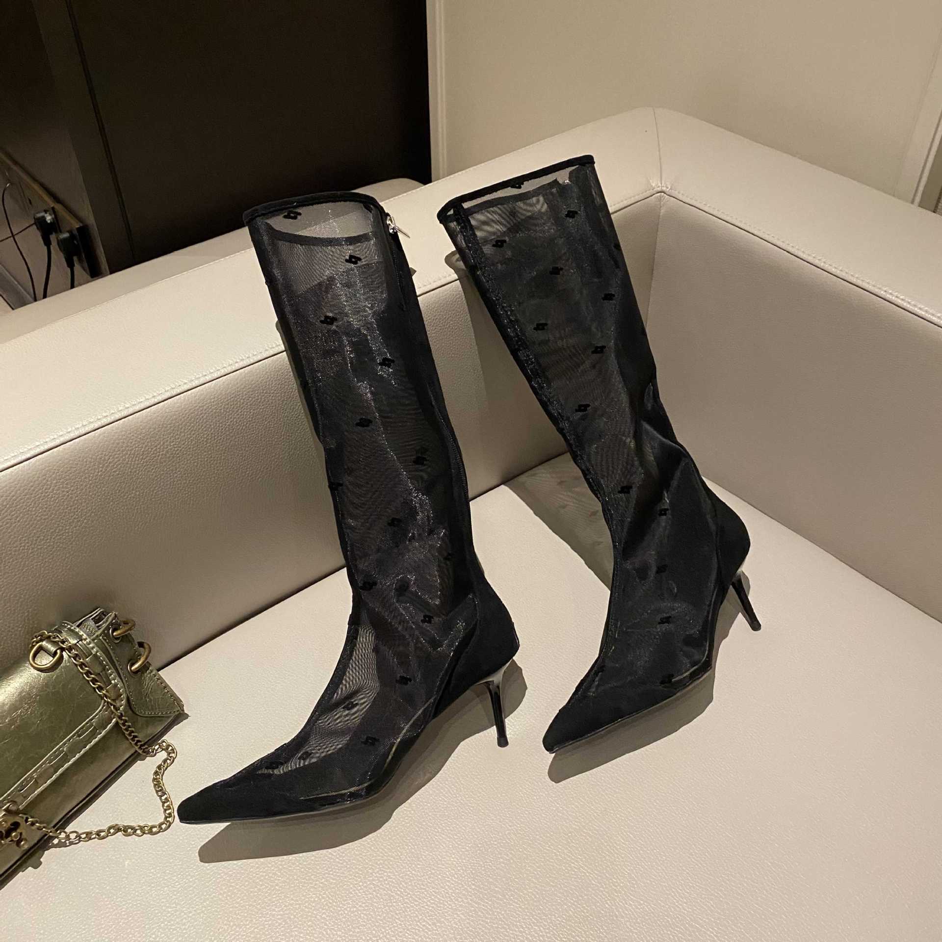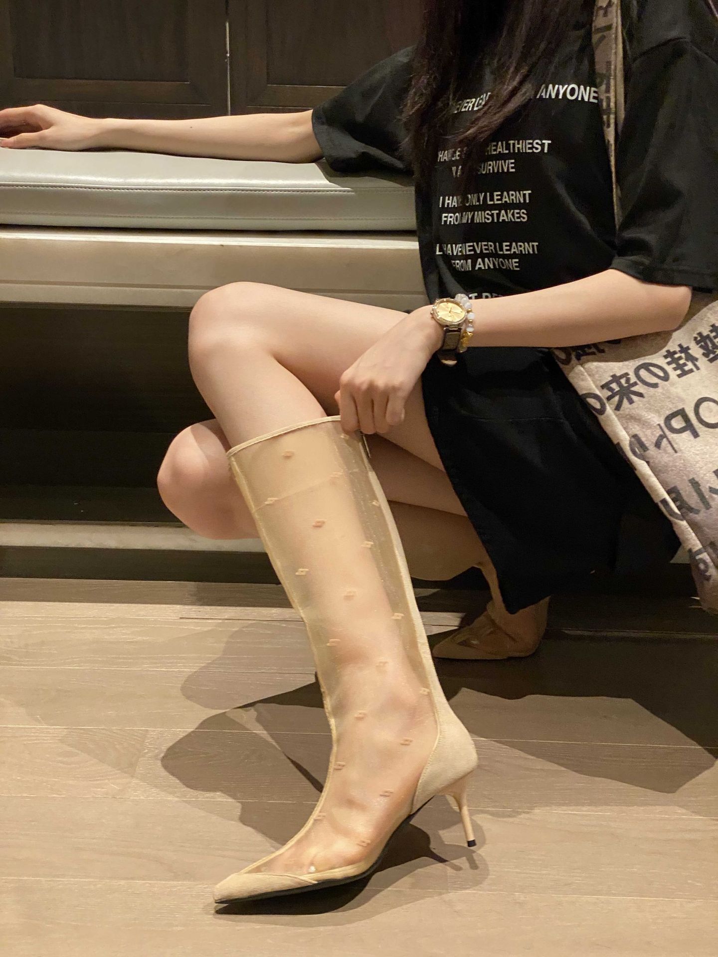 한국 스타일 세련된 투명 메쉬 롱 부츠 여성 2024 년 여름 새 백 지퍼 통기성 얇은 힐 하이힐 부츠