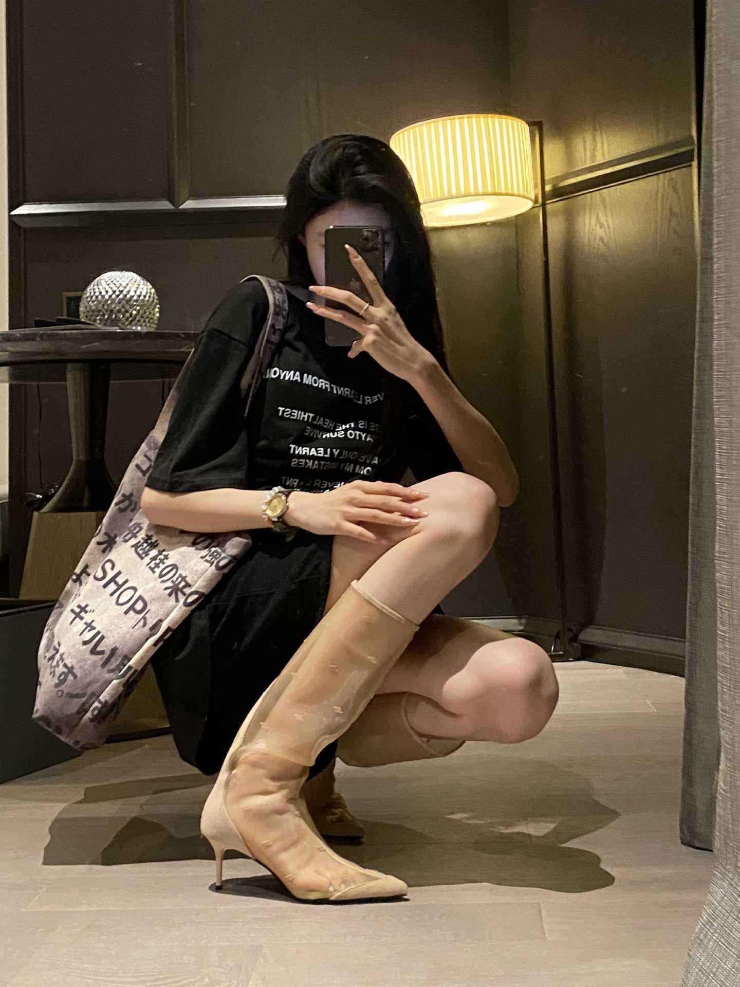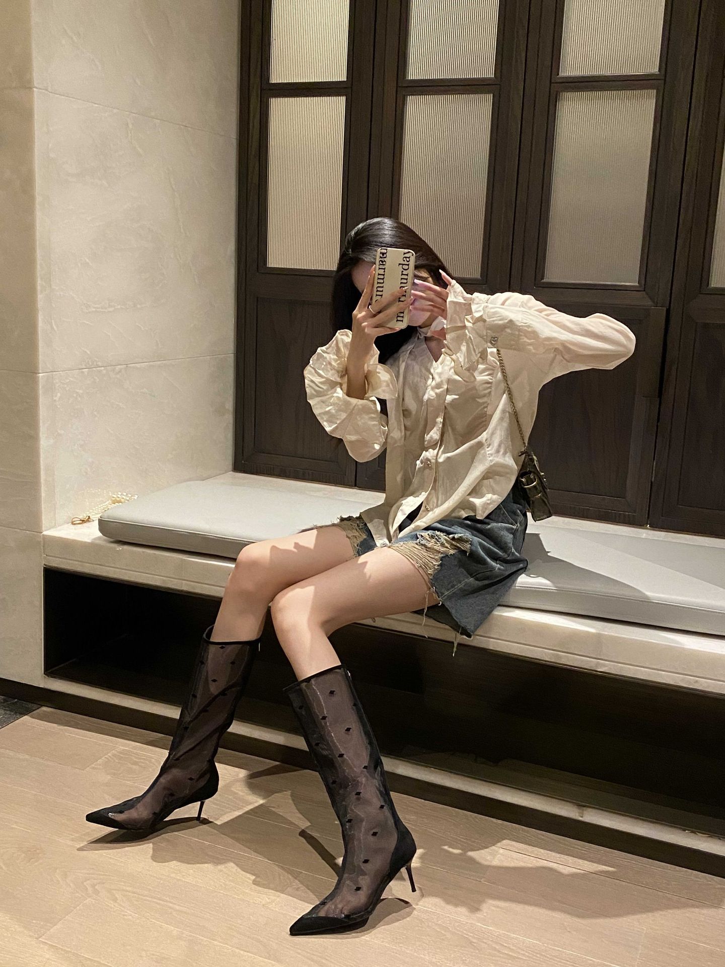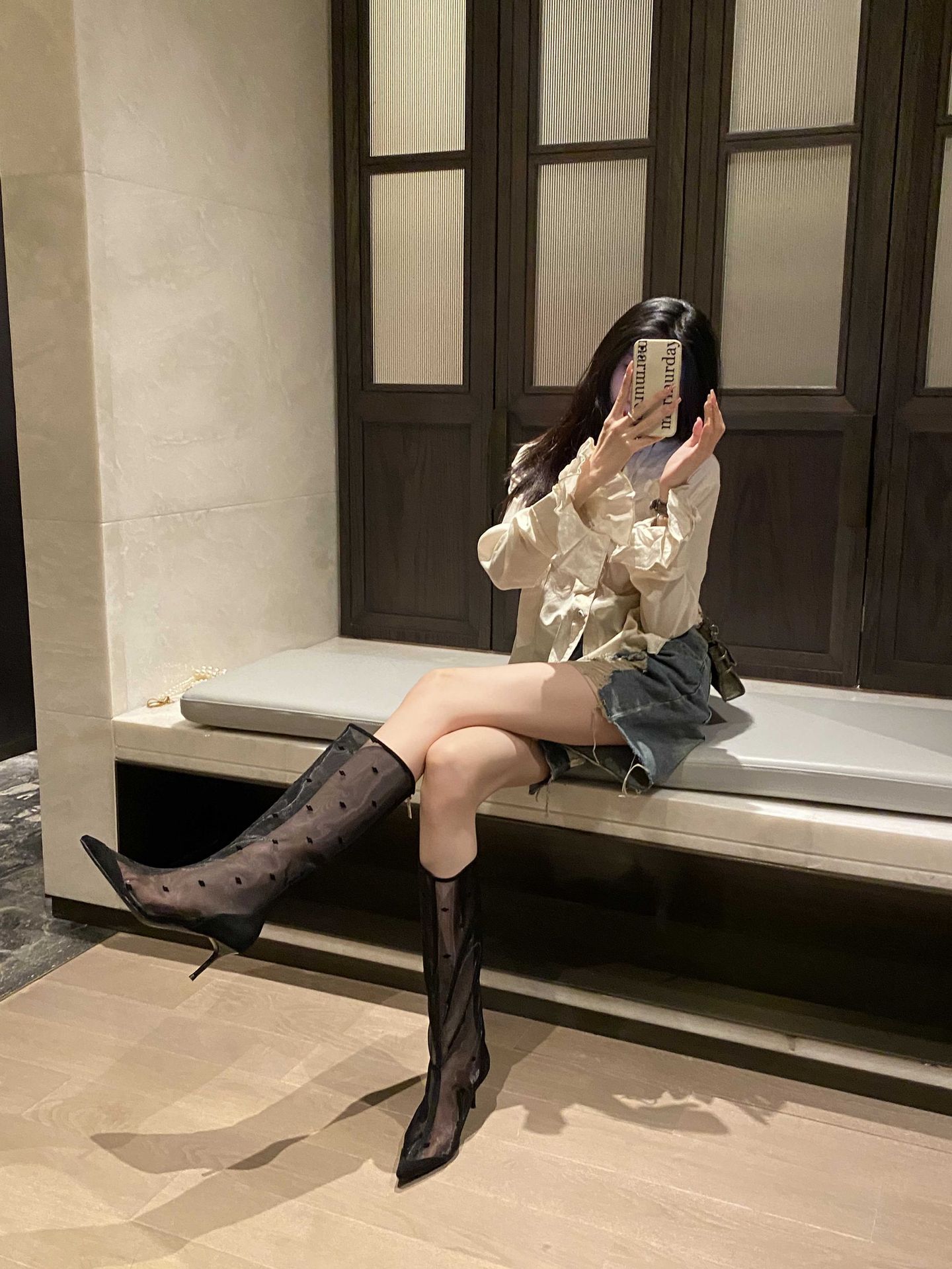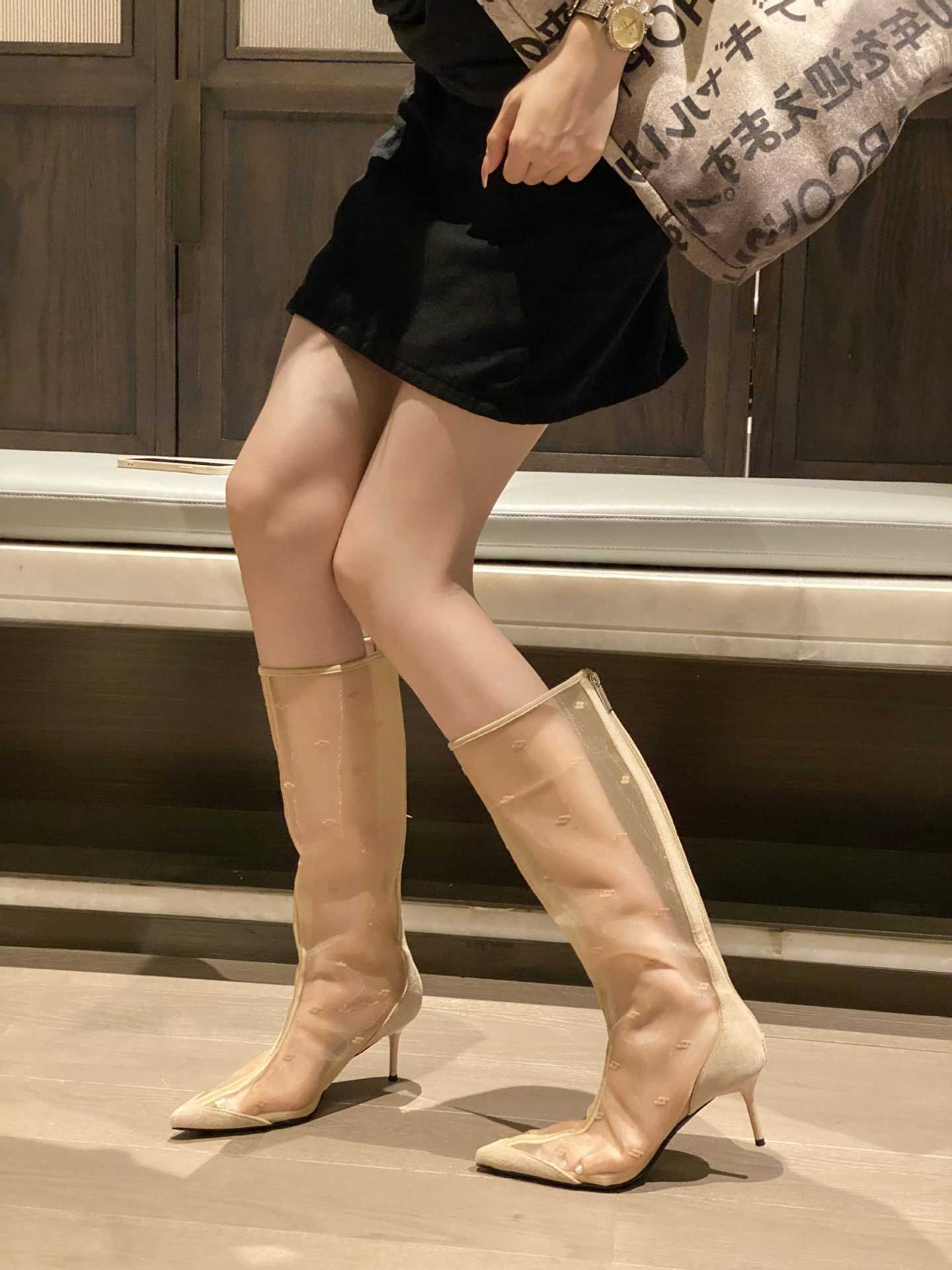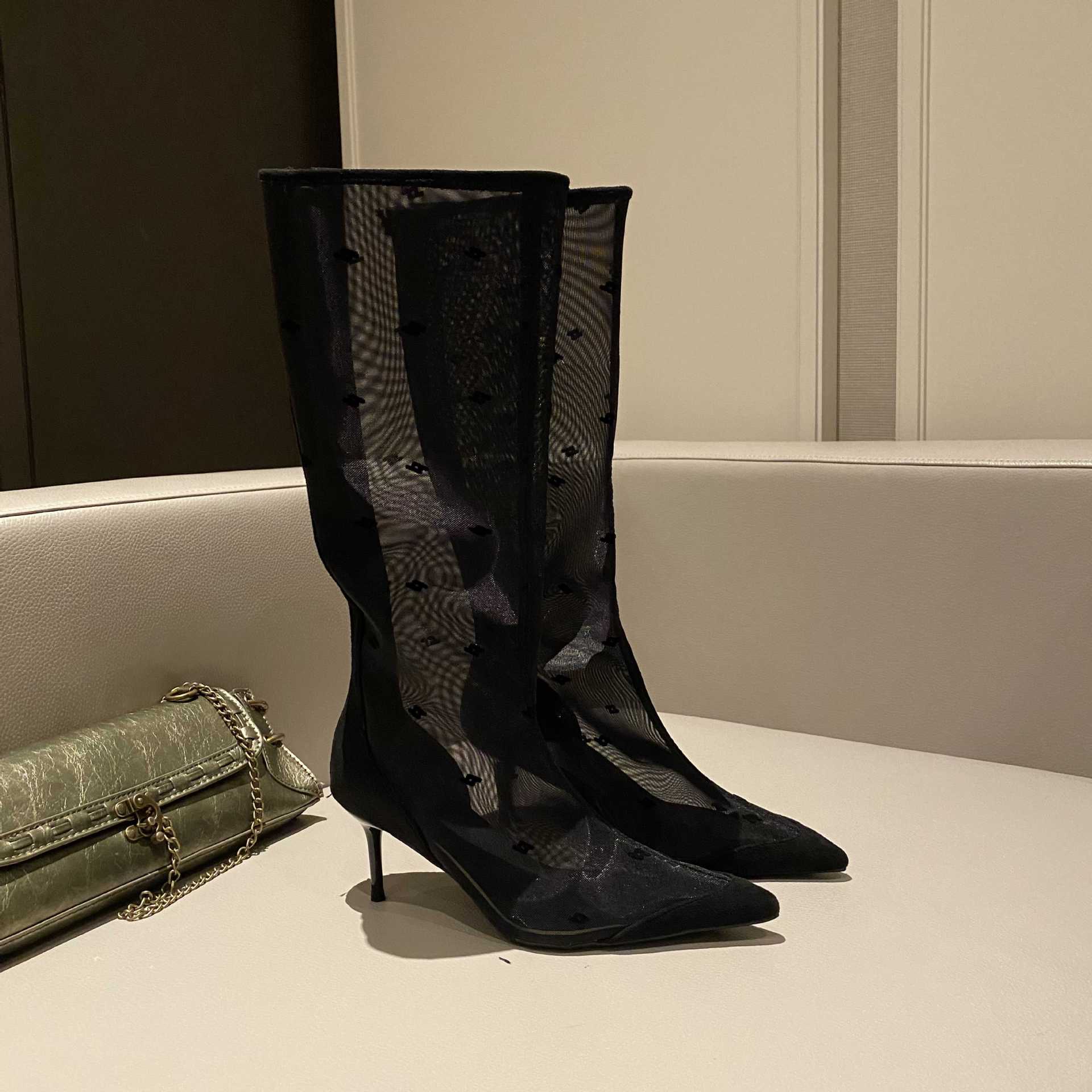 한국 스타일 세련된 투명 메쉬 롱 부츠 여성 2024 년 여름 새 백 지퍼 통기성 얇은 힐 하이힐 부츠