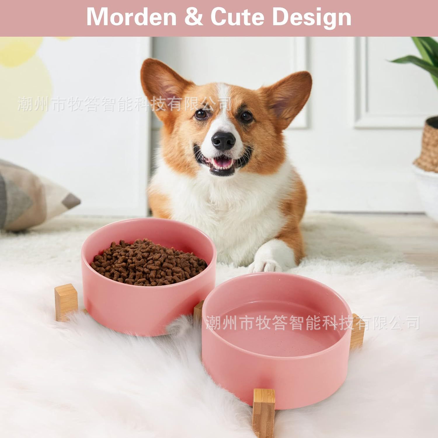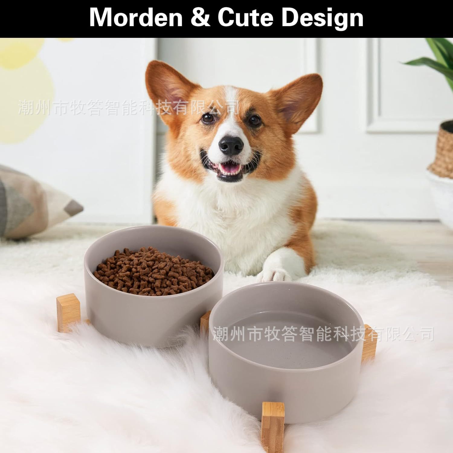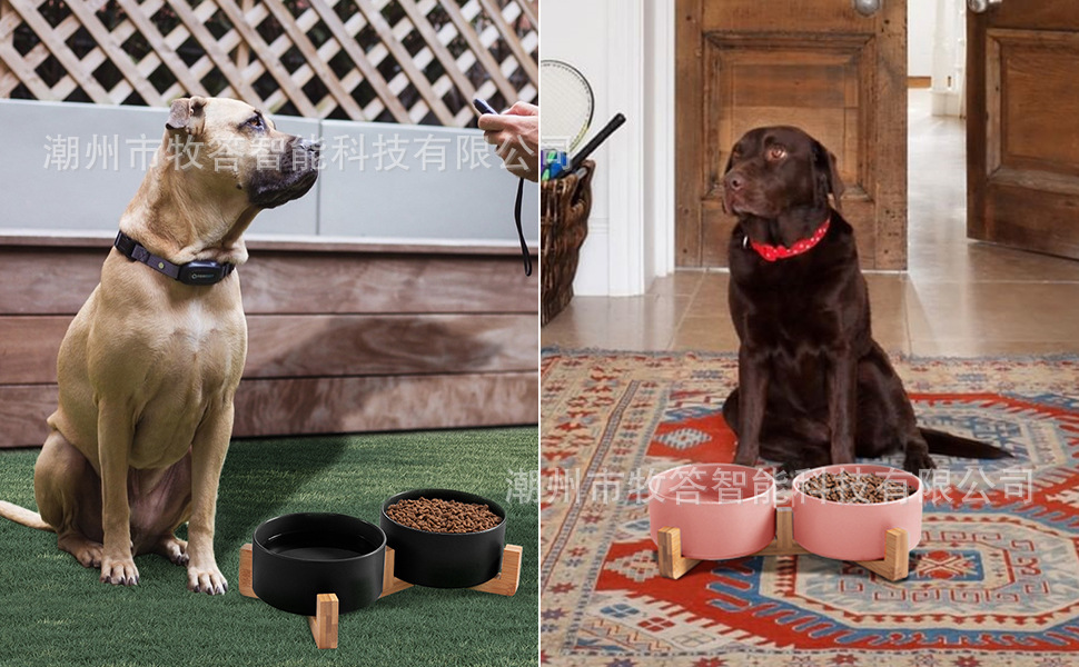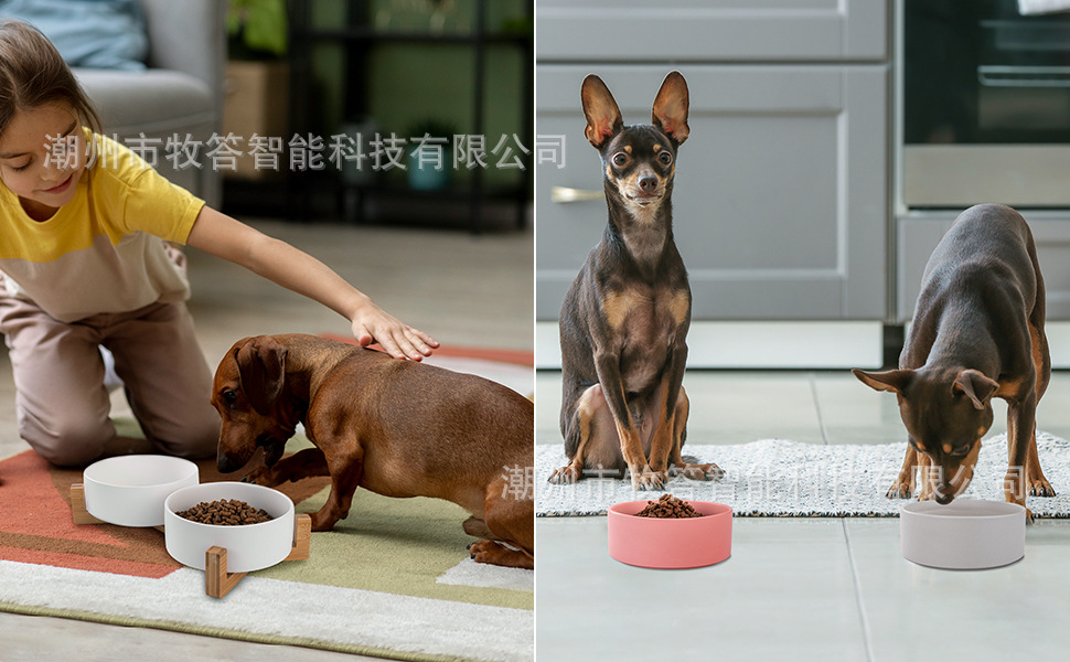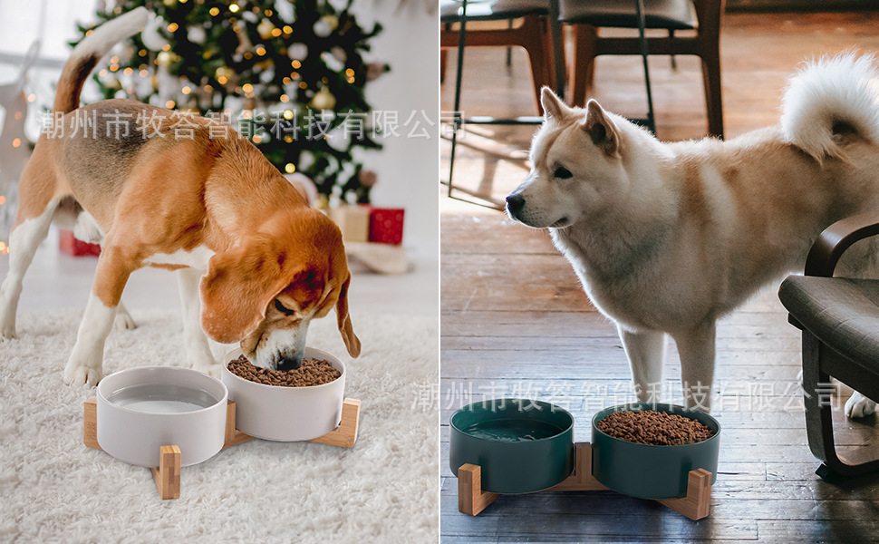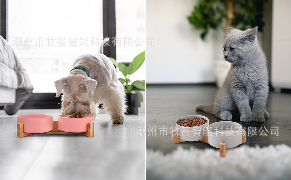 【现代简约设计】 - 可爱的狗狗猫碗,带木质支架设计,与家居装饰相匹配。 这些看起来像地板上的装饰品。