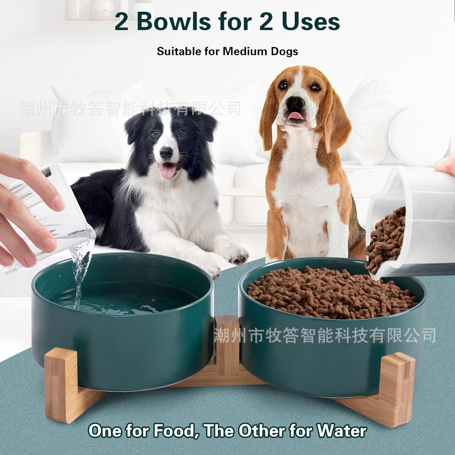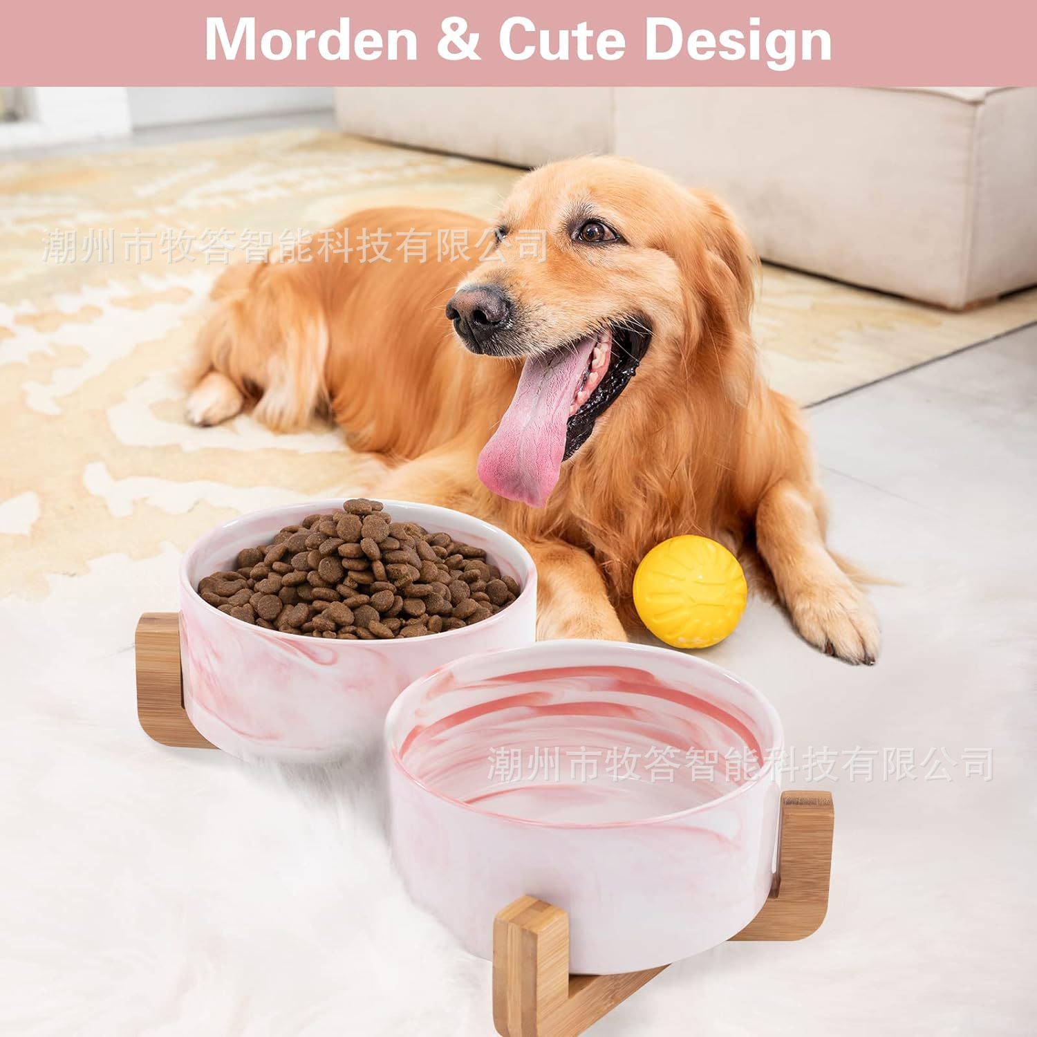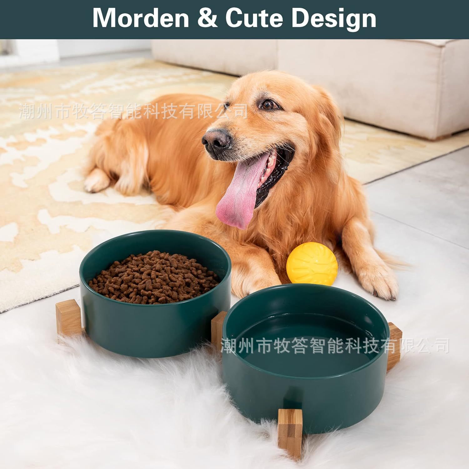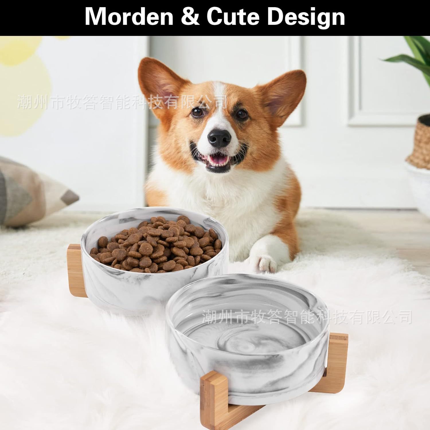 【现代简约设计】 - 可爱的狗狗猫碗,带木质支架设计,与家居装饰相匹配。 这些看起来像地板上的装饰品。
