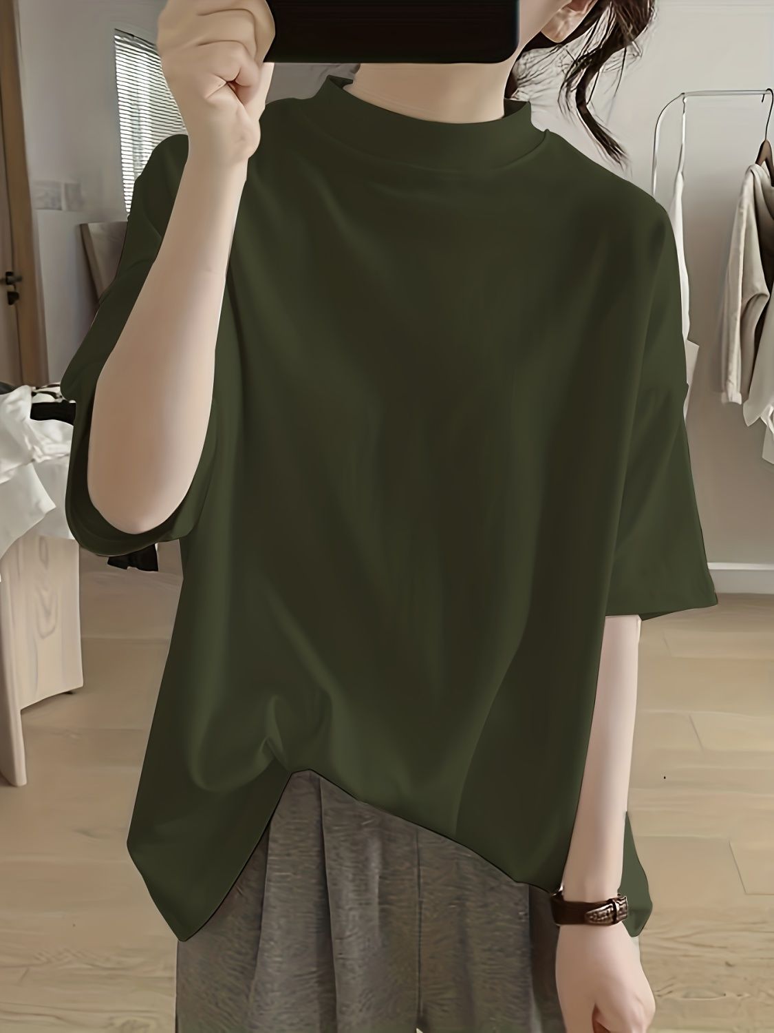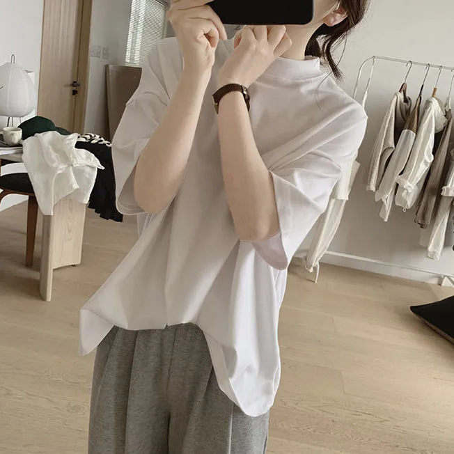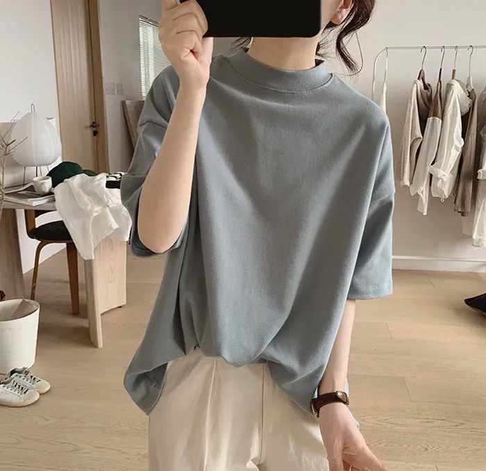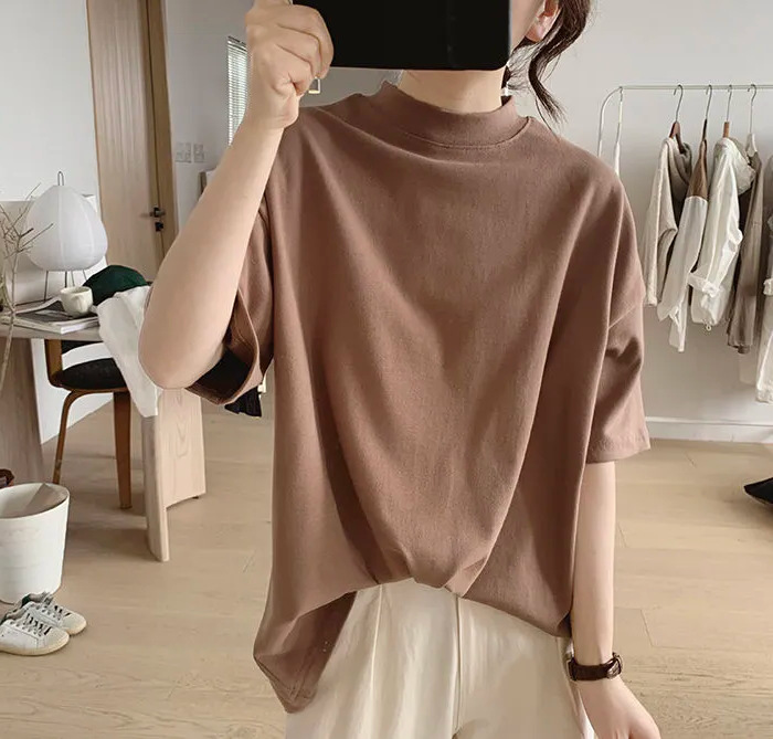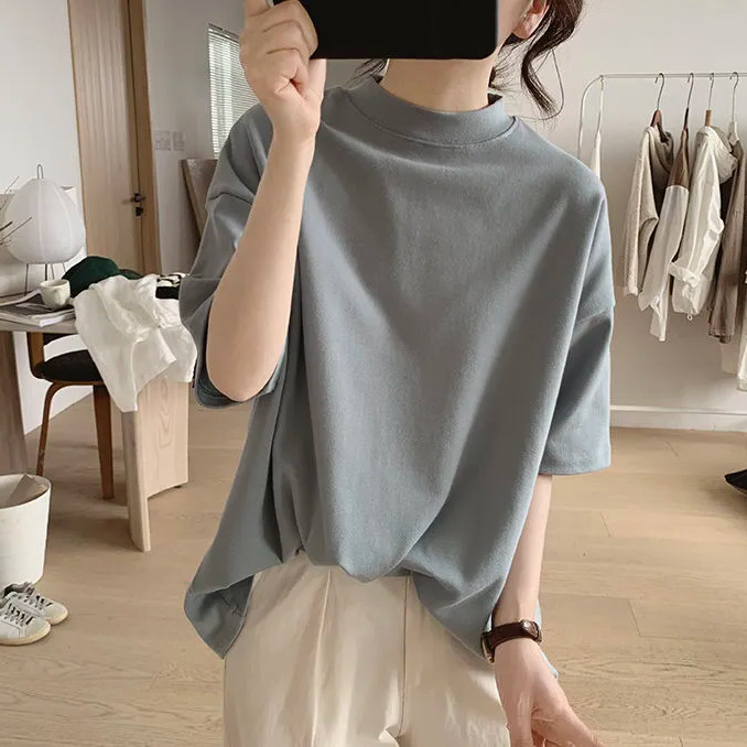 반 높이 칼라 티셔츠 여성의 봄과 여름 새로운 느슨한 슬리밍 한국 스타일 간단한 반소매 연령 감소 면 기본 탑