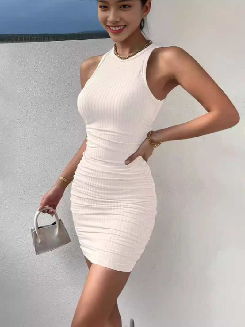 유럽과 미국 스타일의 민소매 크루 넥 주름 스트레치 슬림 엉덩이 조끼 스커트 아마존 소원 휴가 원피스
