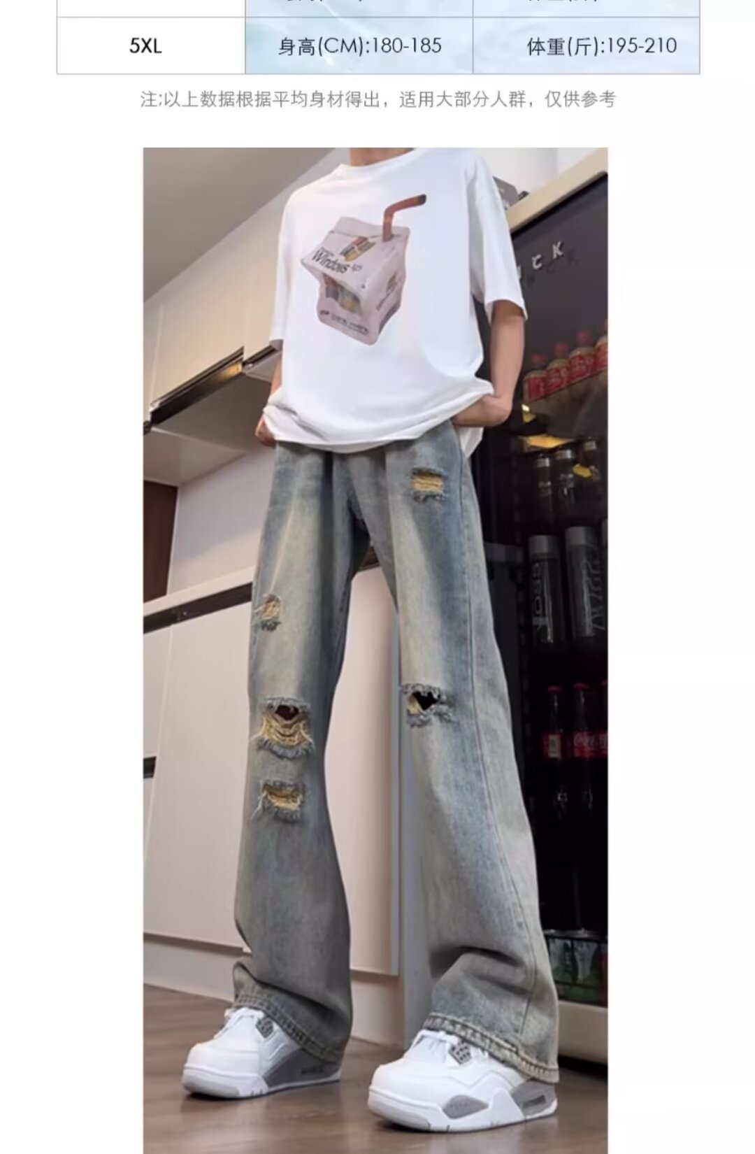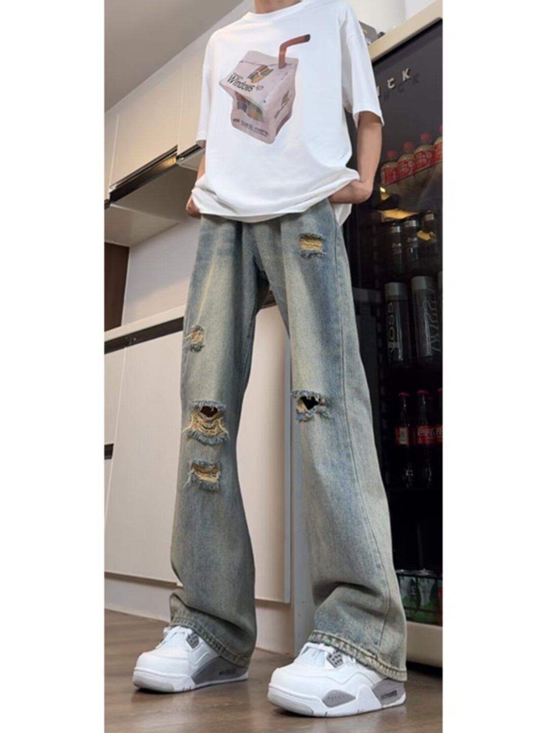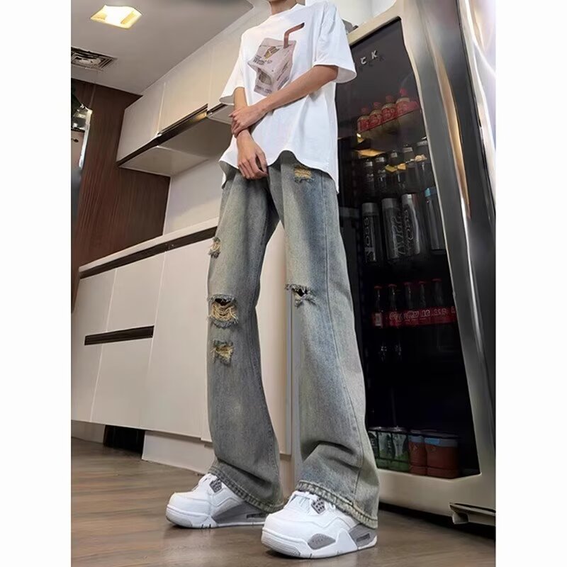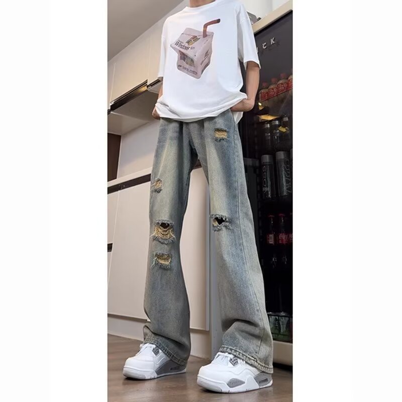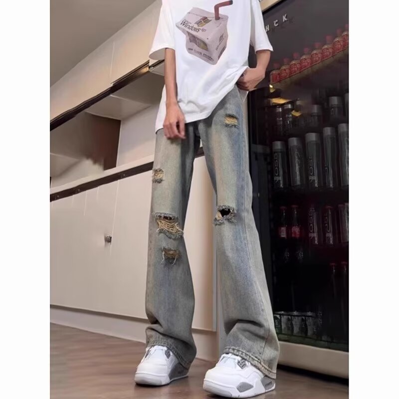 남성용 데미지 진, 남성용 레트로 홍콩 스타일 가을 바지, 아메리칸 하이 스트리트 패션 브랜드, 루즈핏 마이크로 플레어 팬츠 남성복