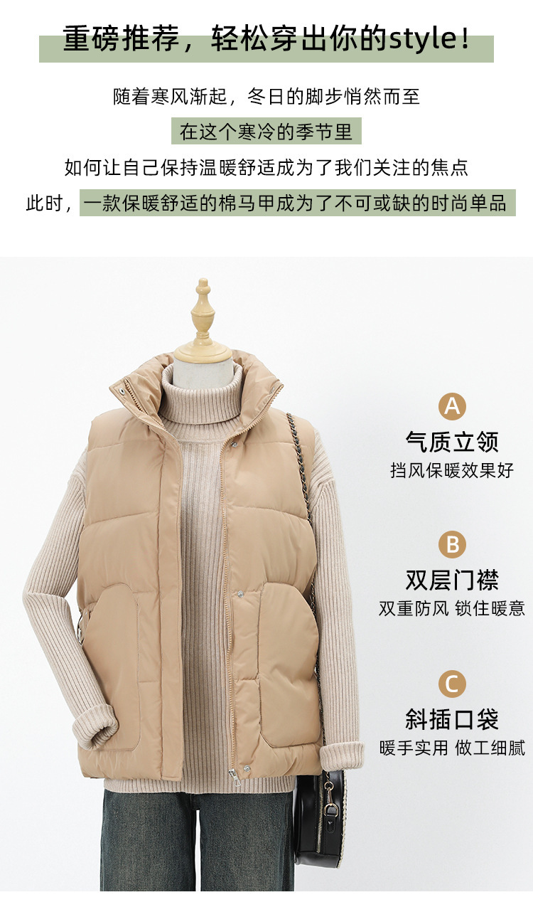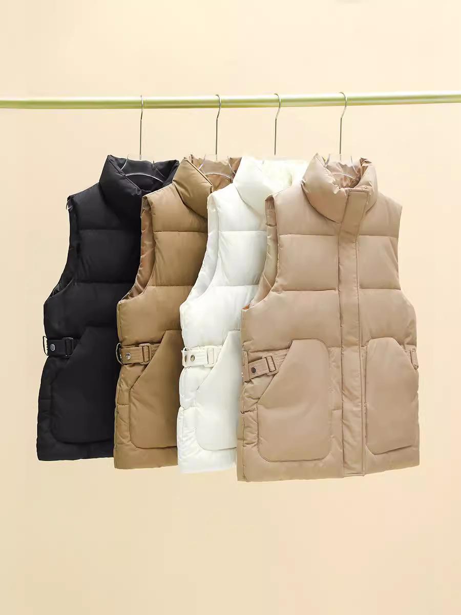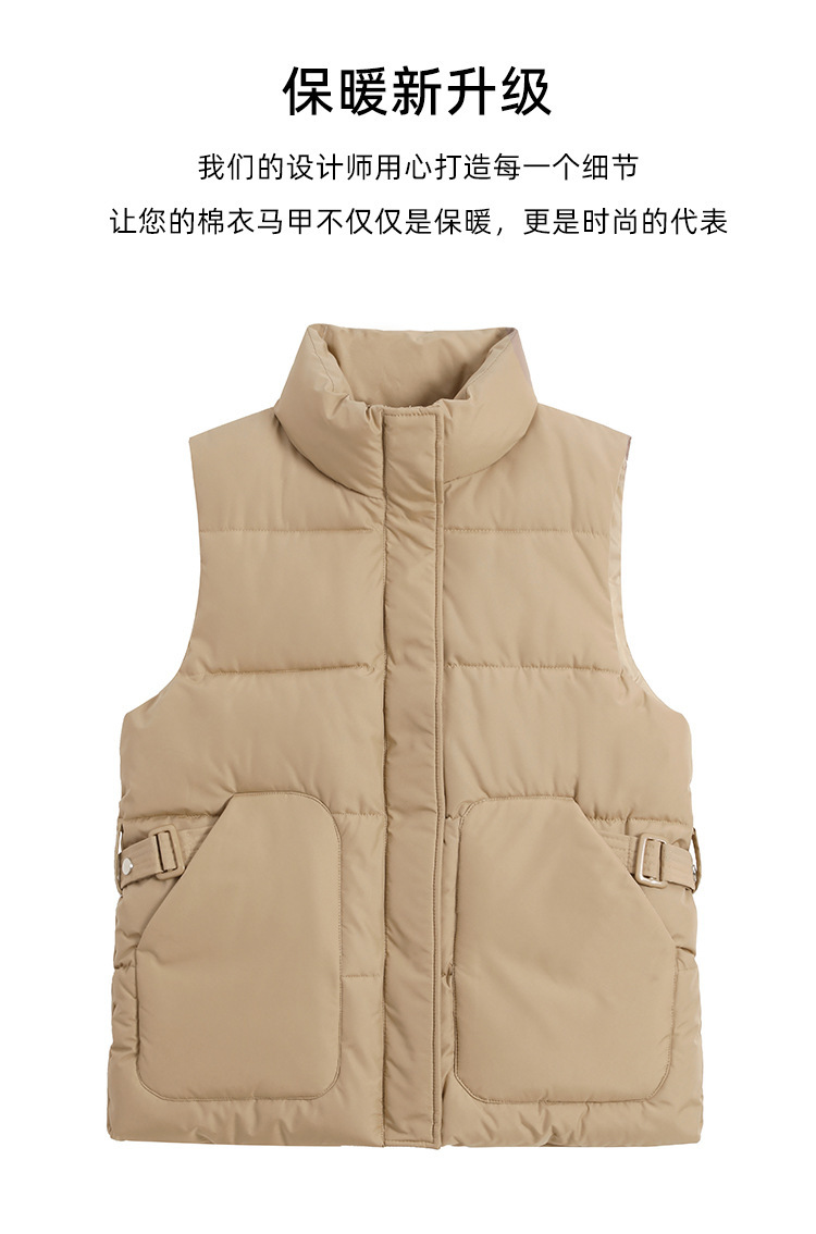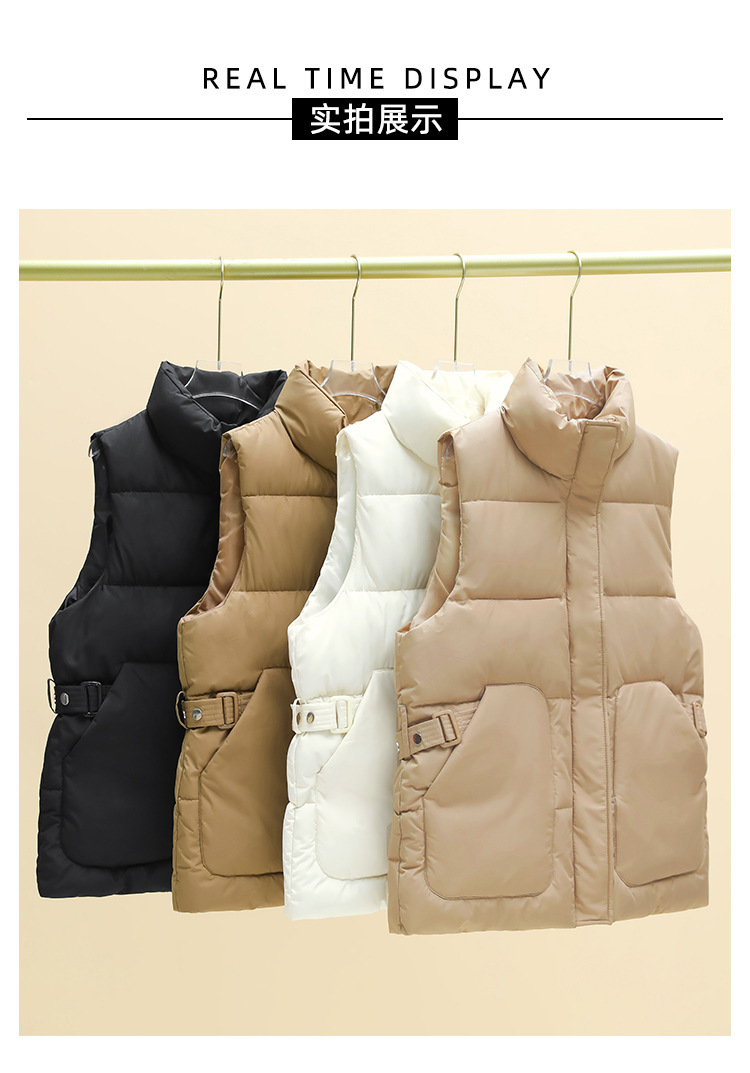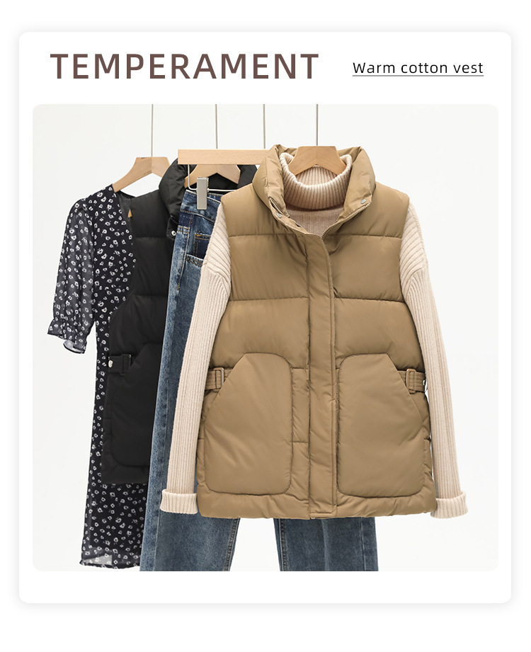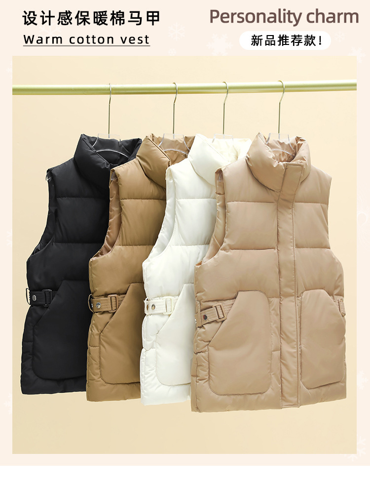 2025년 신상 여성용 다운 코튼 조끼, 슬림하고 세련된 패션 트렌드, 스탠드 칼라 조끼, 허리 조임, 다용도 민소매 조끼