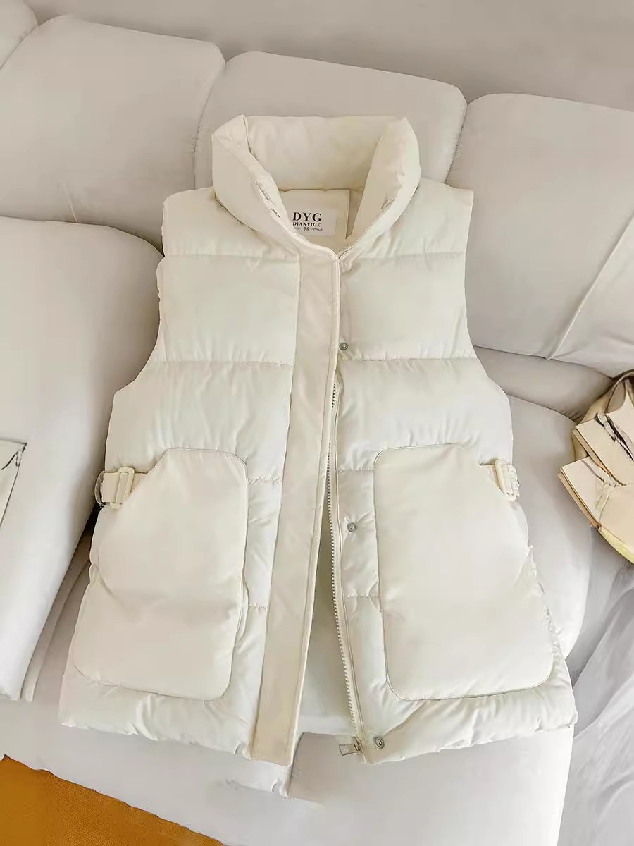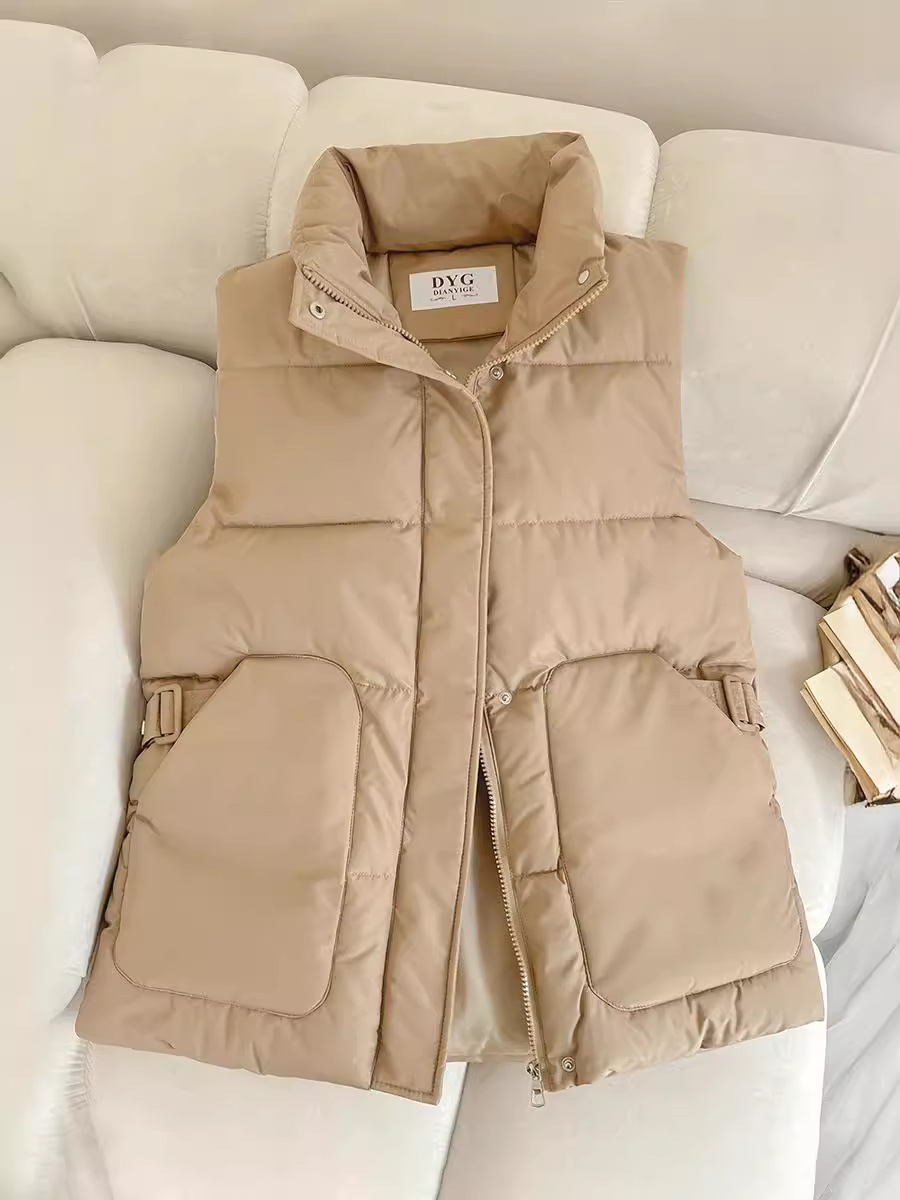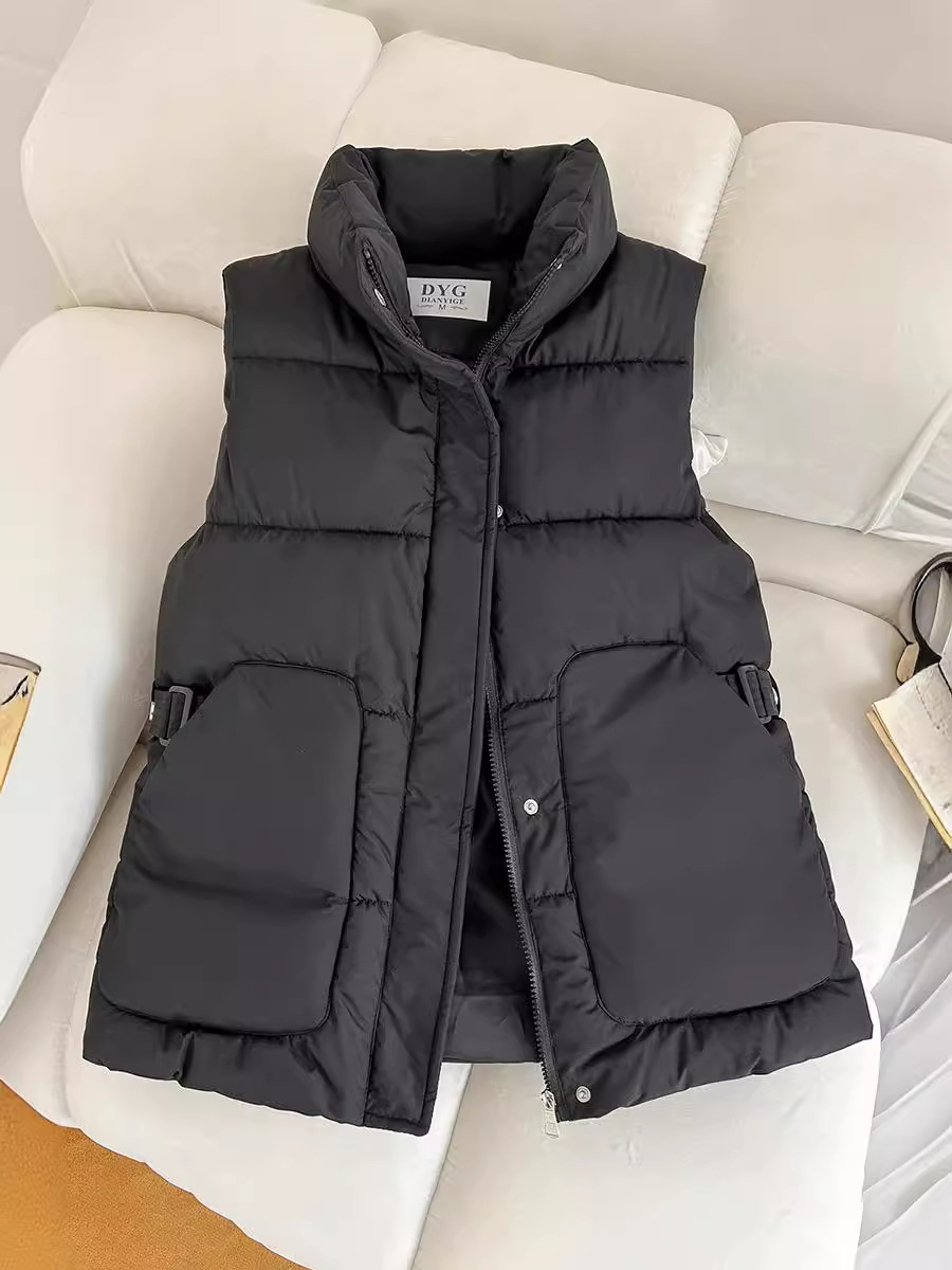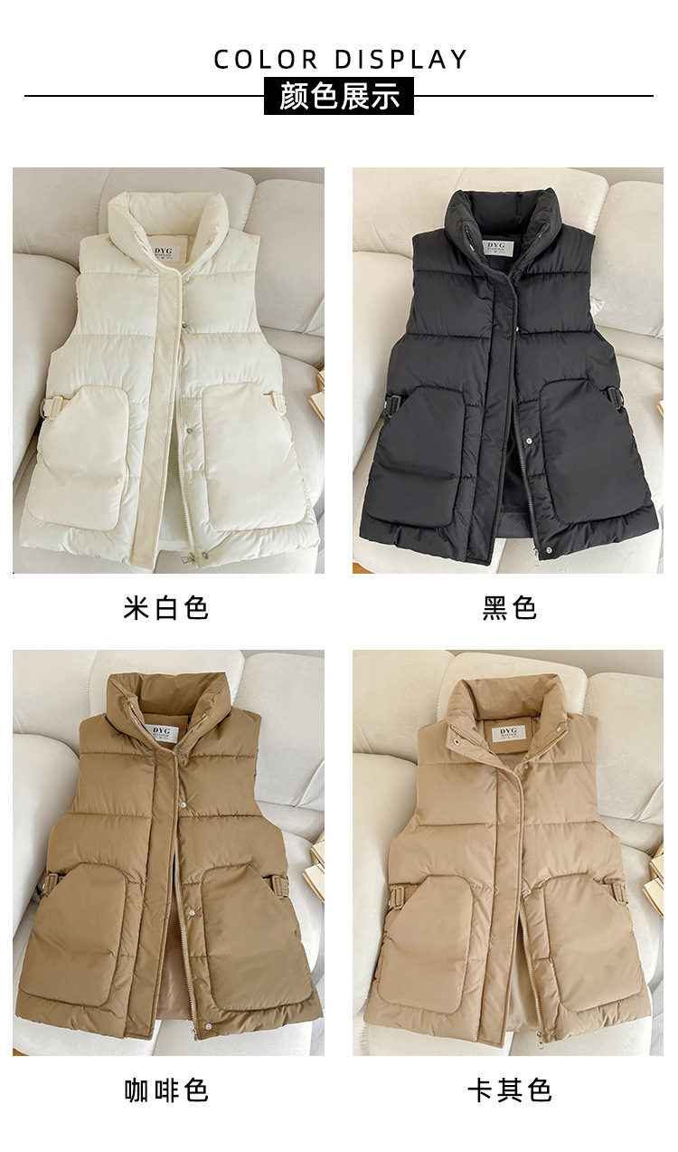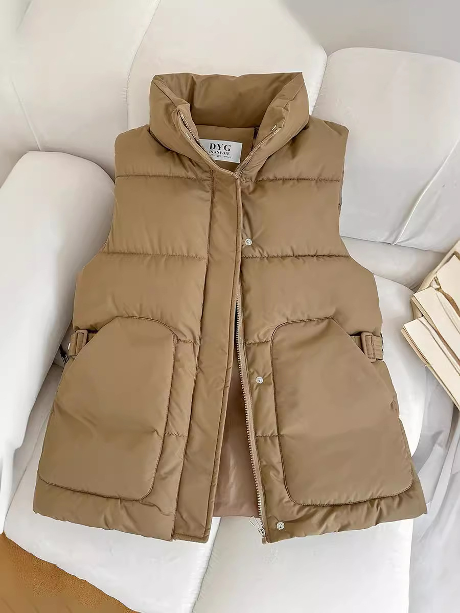2025년 신상 여성용 다운 코튼 조끼, 슬림하고 세련된 패션 트렌드, 스탠드 칼라 조끼, 허리 조임, 다용도 민소매 조끼