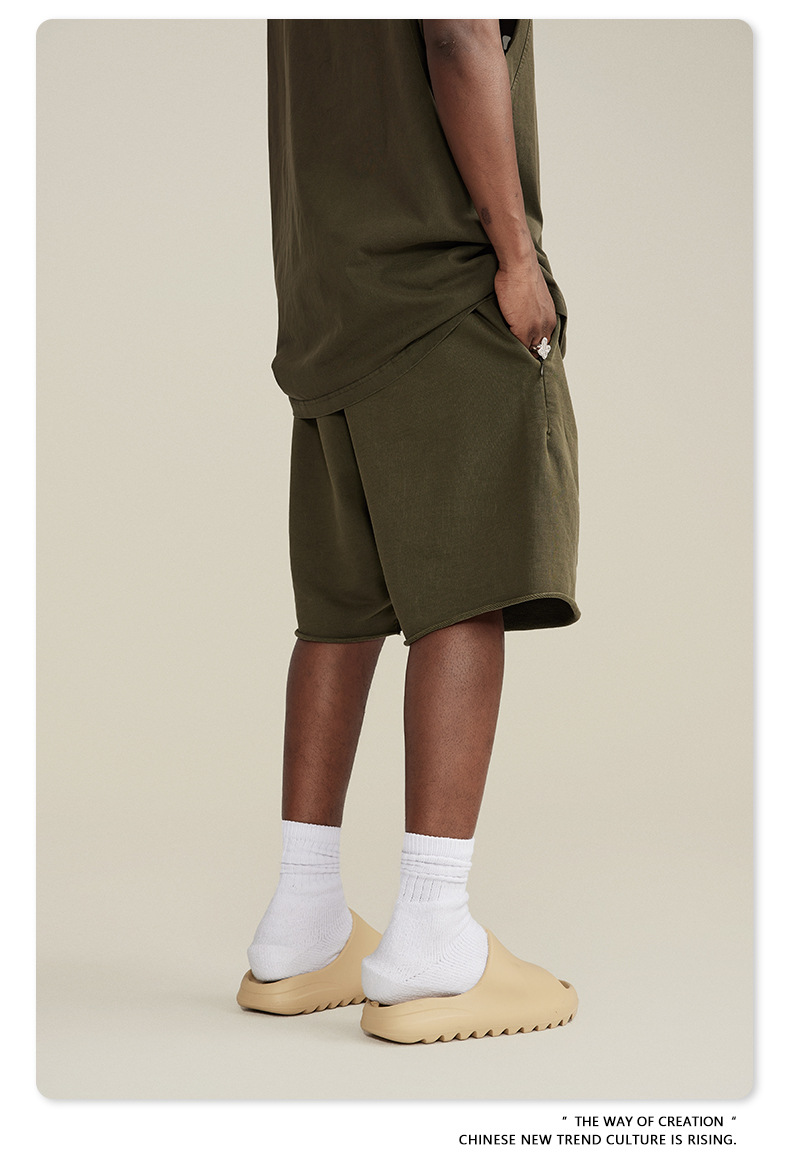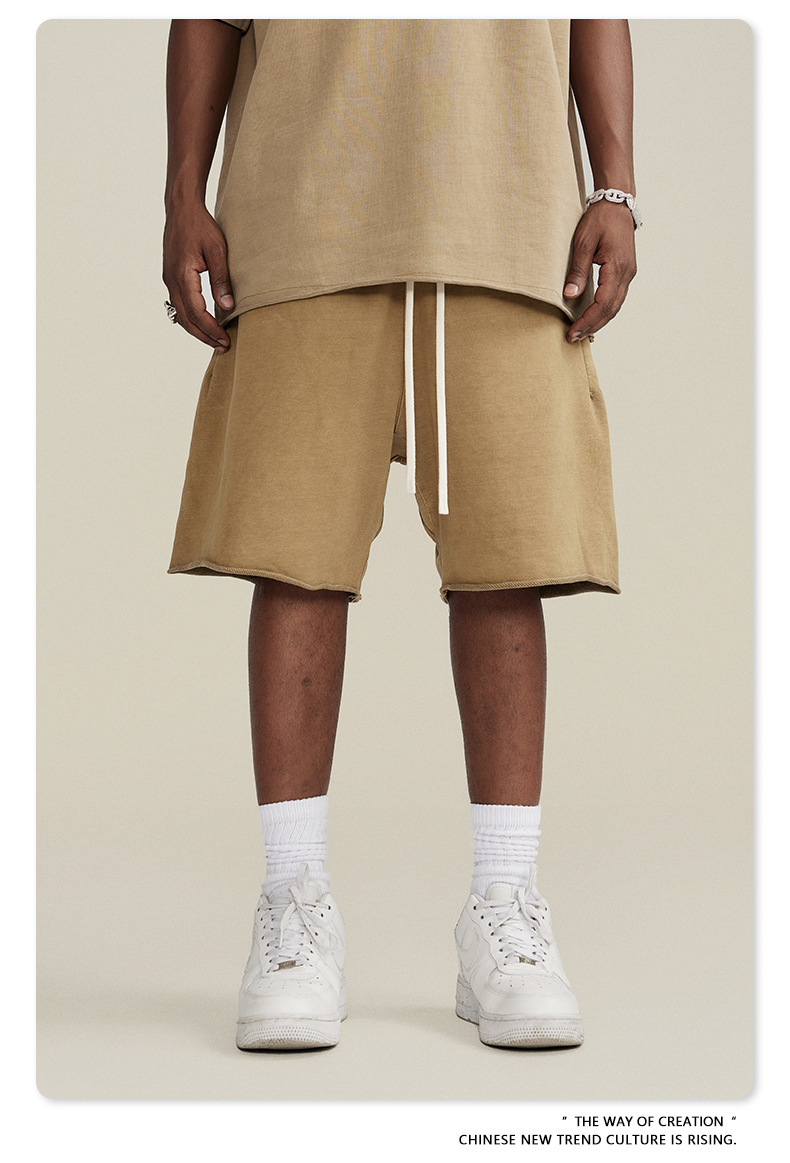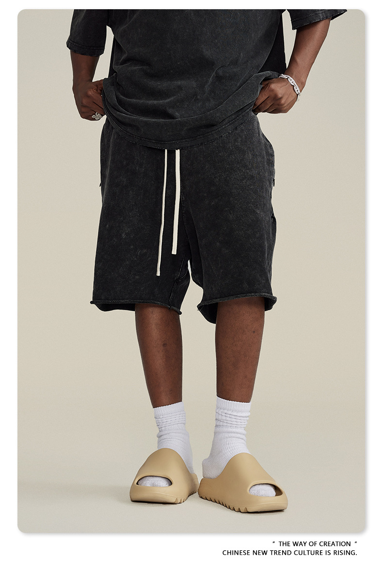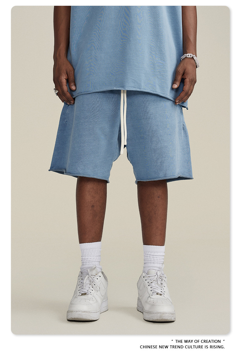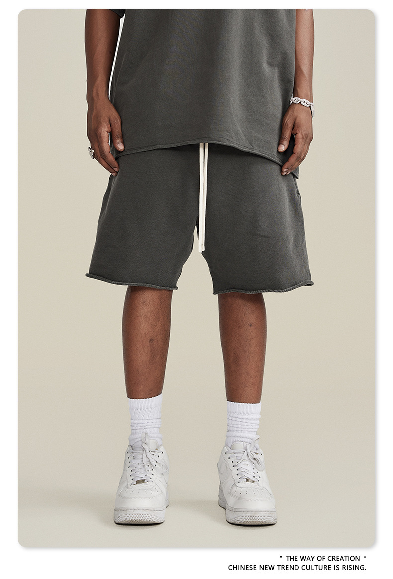 남성용 여름 복고풍 스타일 스포츠 반바지 410G 피트니스 트레이닝 솔리드 컬러 루즈 에지 헤비 워시 디스트레스드 5부 바지