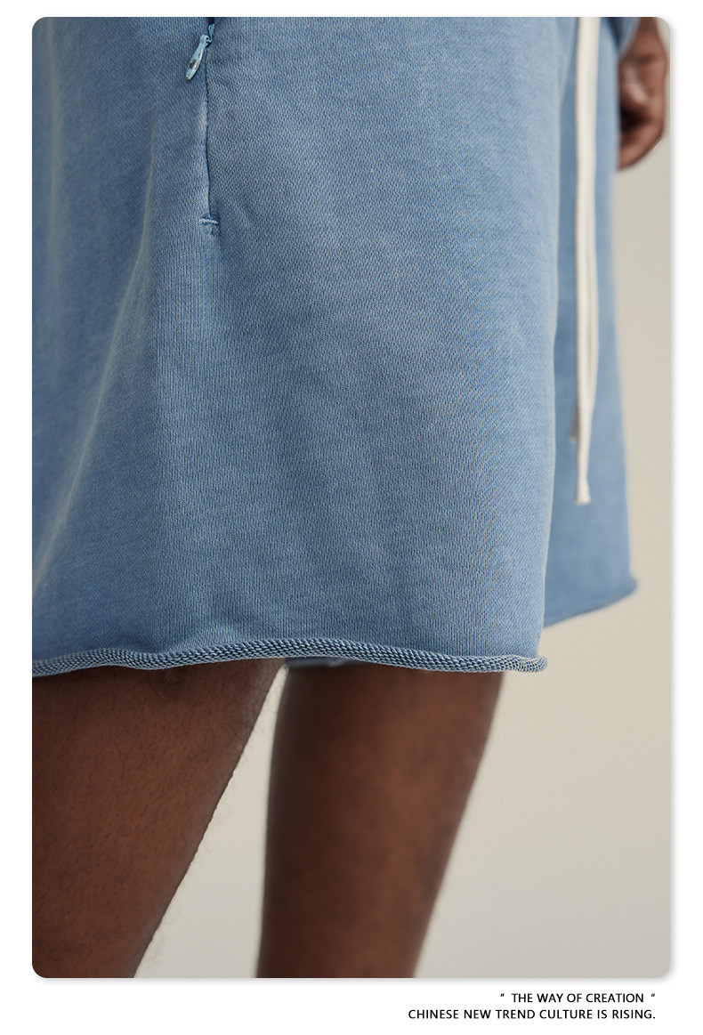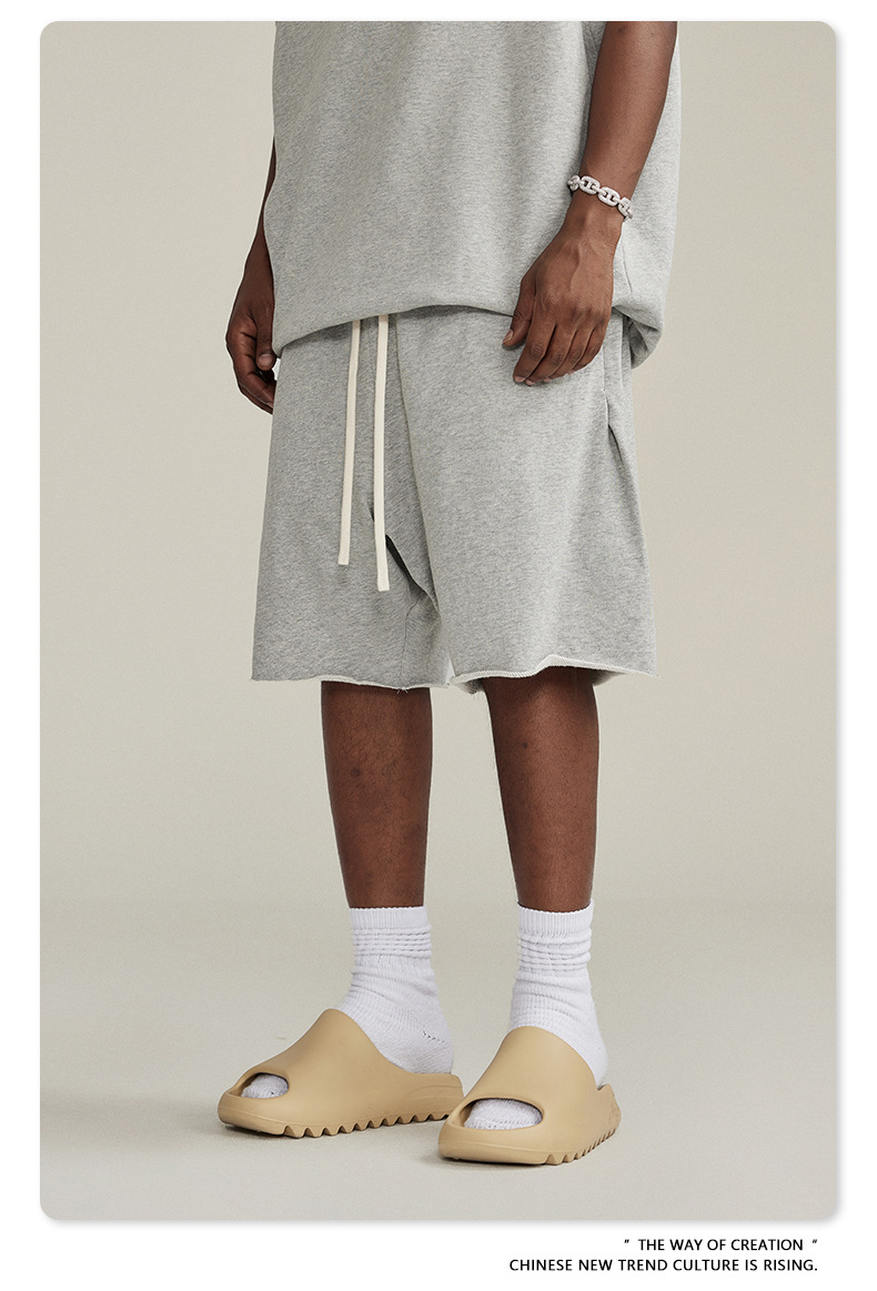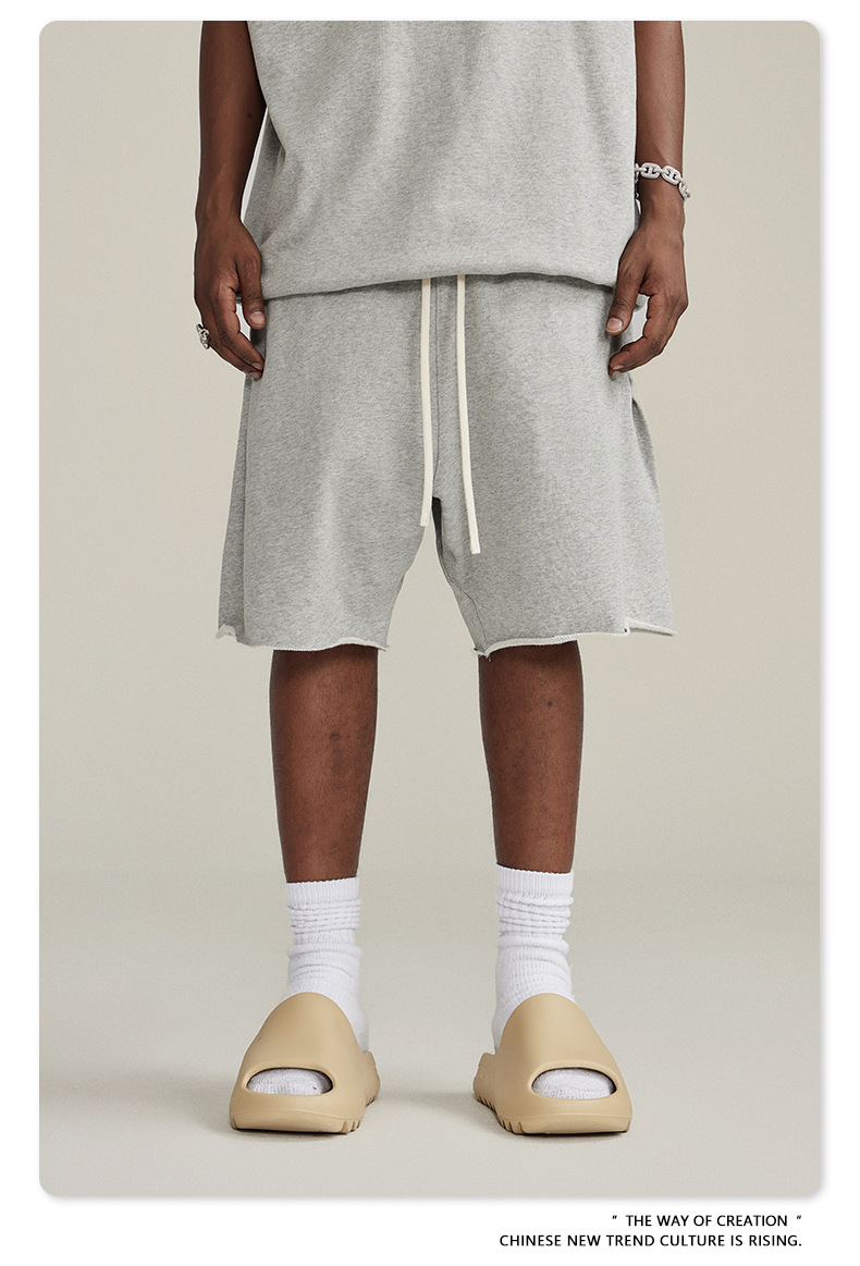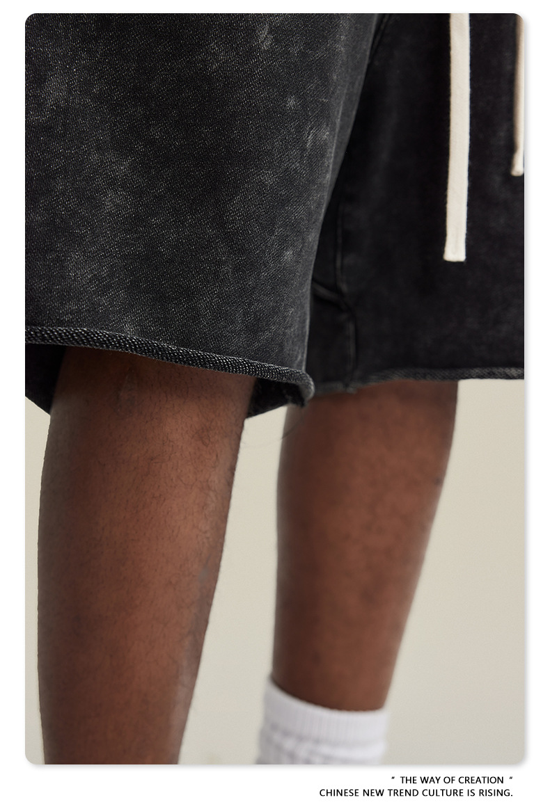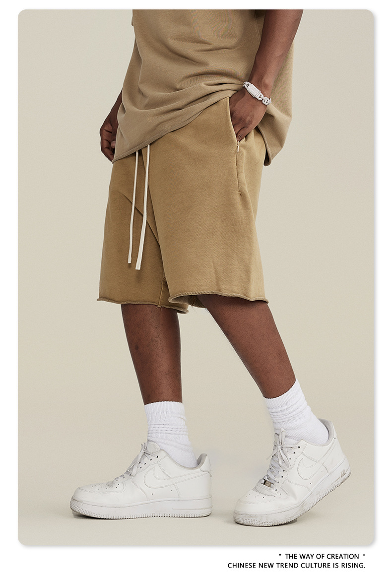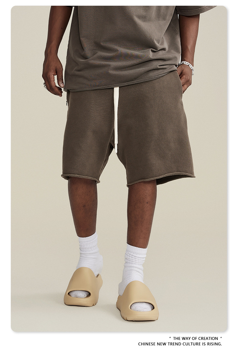 남성용 여름 복고풍 스타일 스포츠 반바지 410G 피트니스 트레이닝 솔리드 컬러 루즈 에지 헤비 워시 디스트레스드 5부 바지