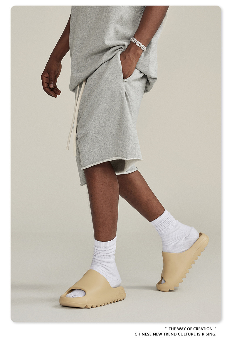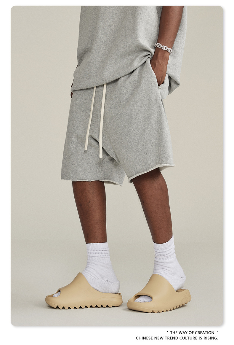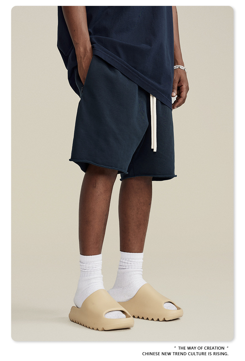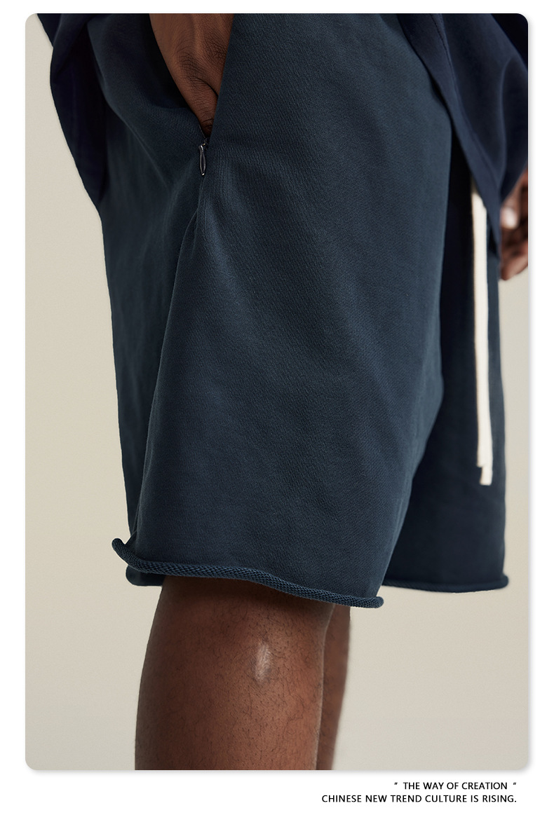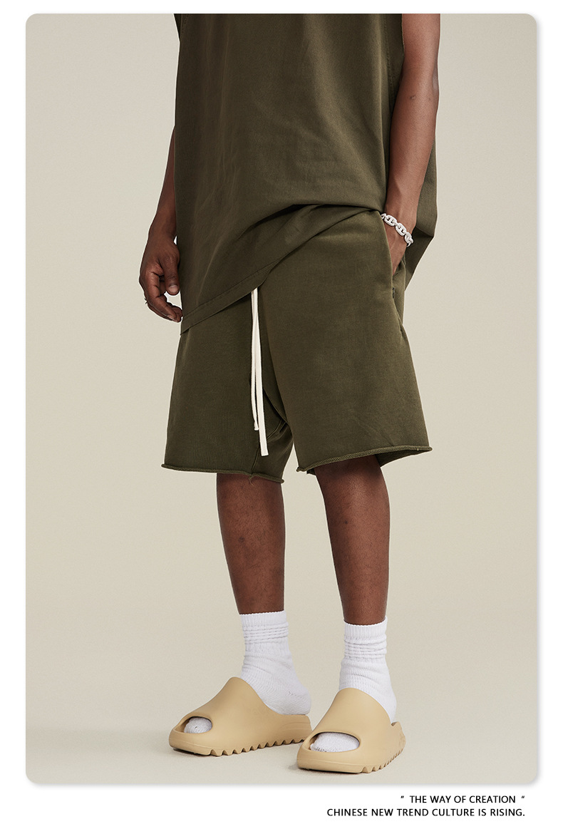 남성용 여름 복고풍 스타일 스포츠 반바지 410G 피트니스 트레이닝 솔리드 컬러 루즈 에지 헤비 워시 디스트레스드 5부 바지