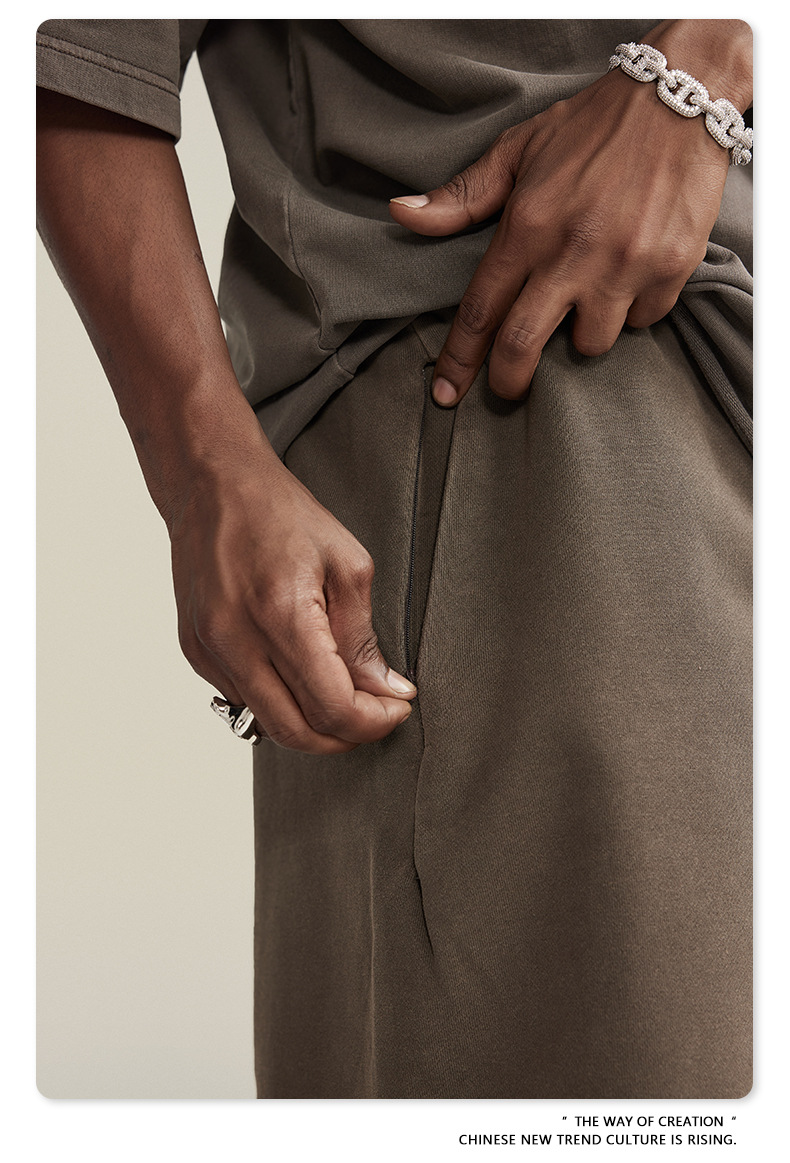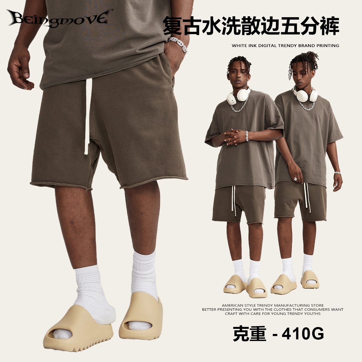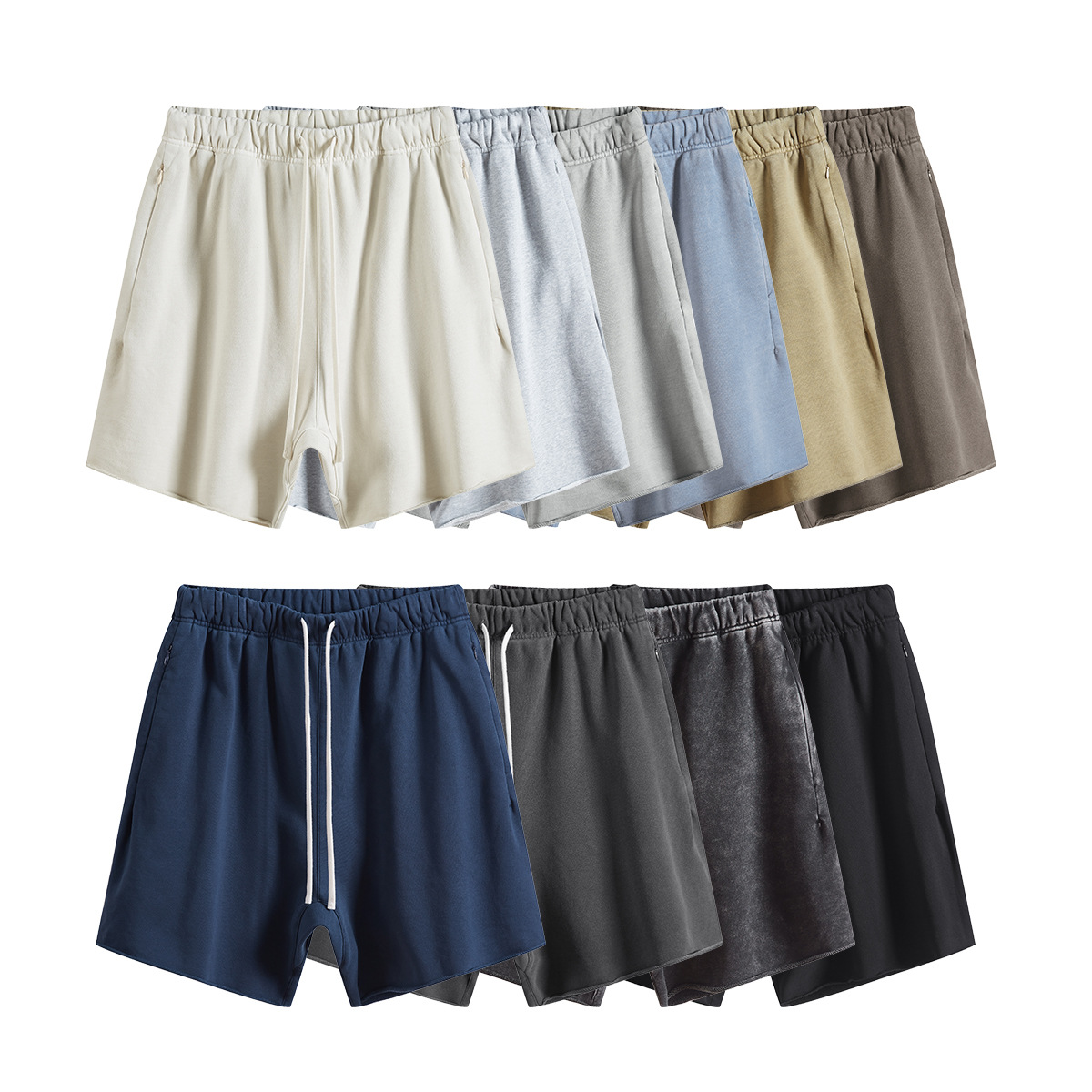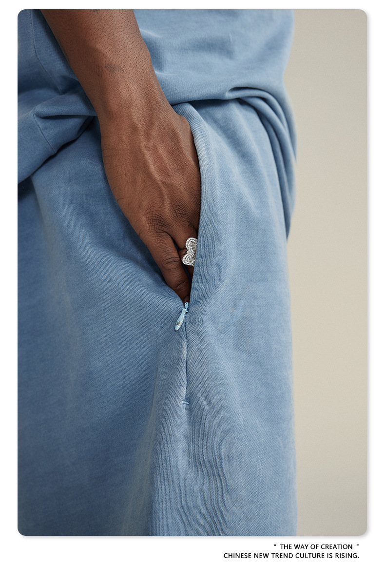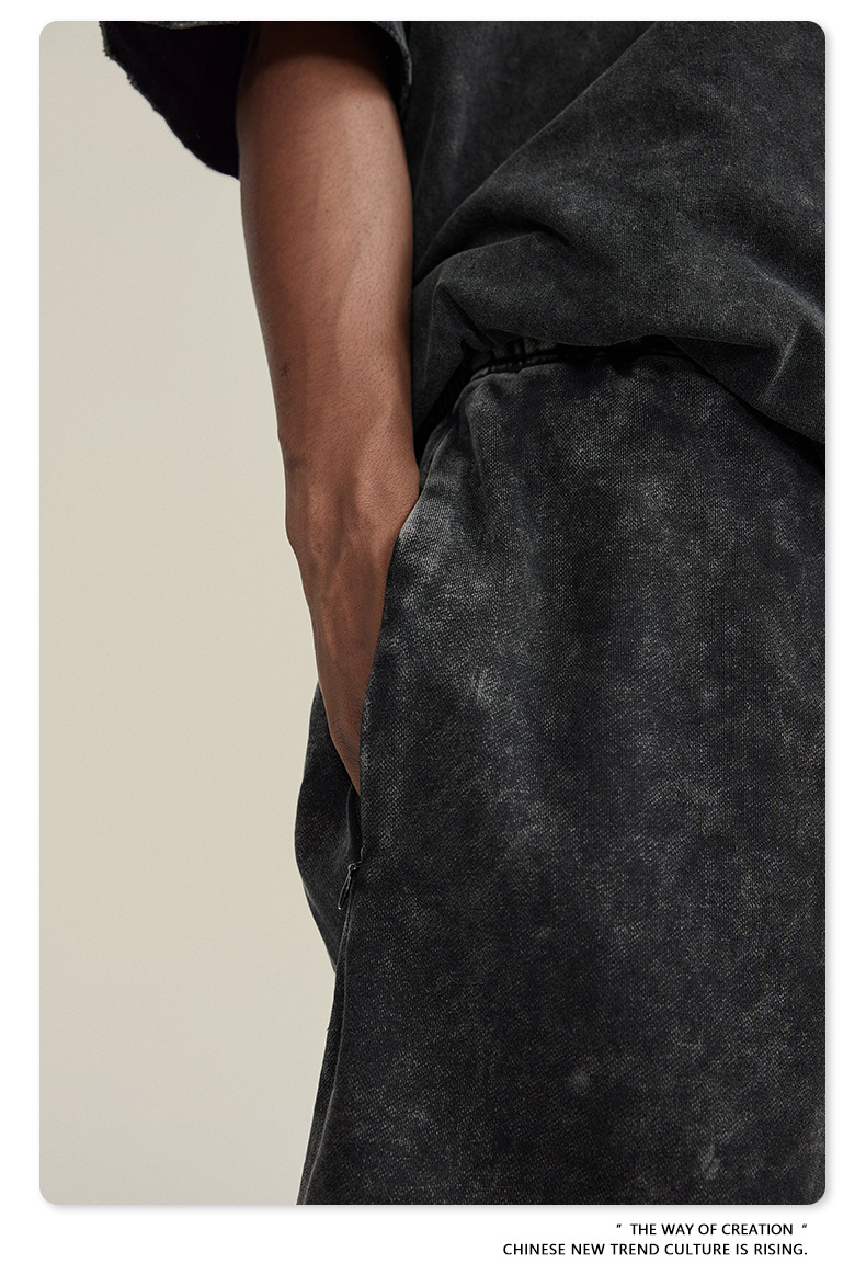 남성용 여름 복고풍 스타일 스포츠 반바지 410G 피트니스 트레이닝 솔리드 컬러 루즈 에지 헤비 워시 디스트레스드 5부 바지