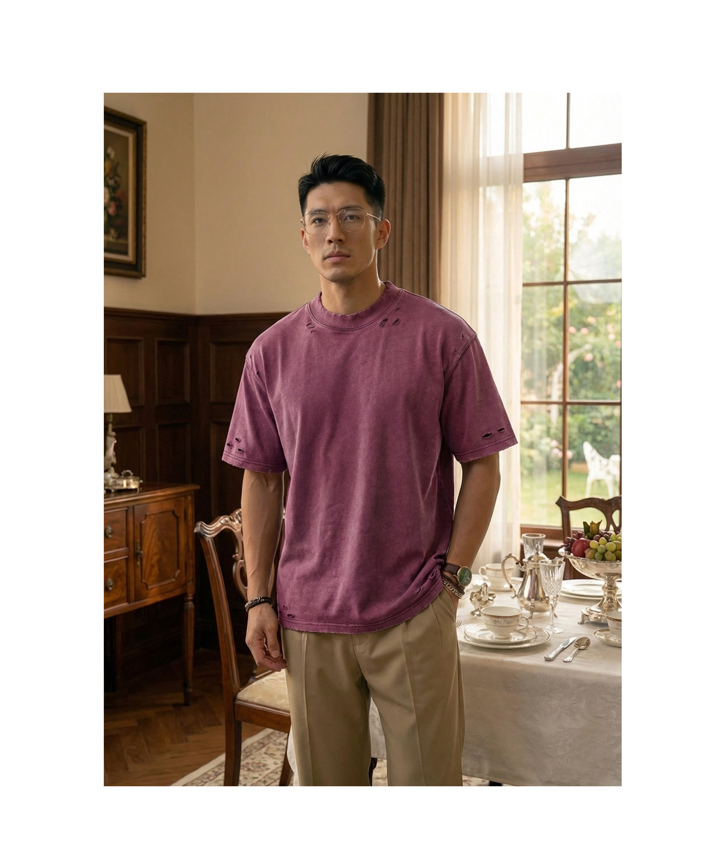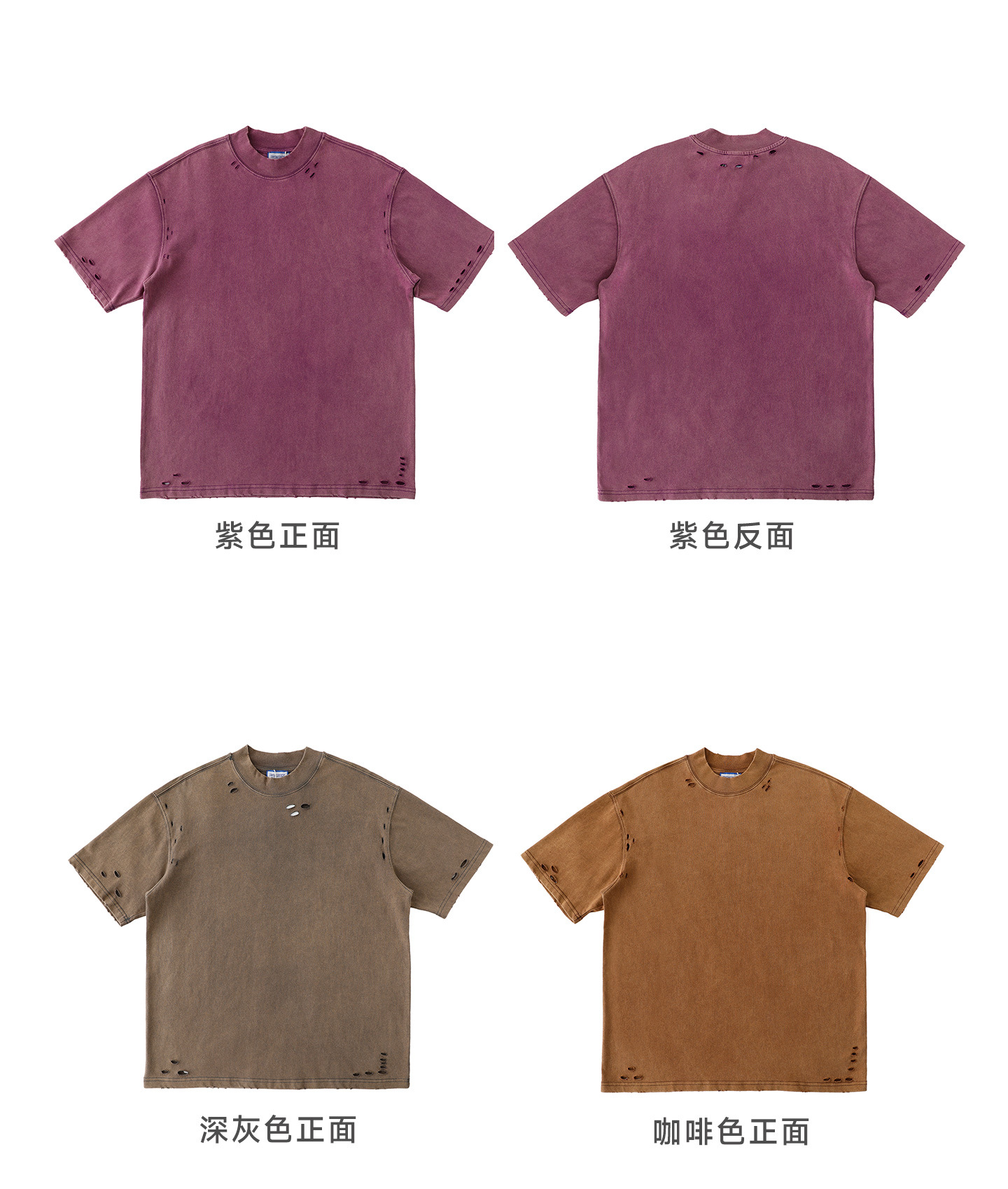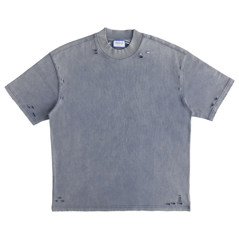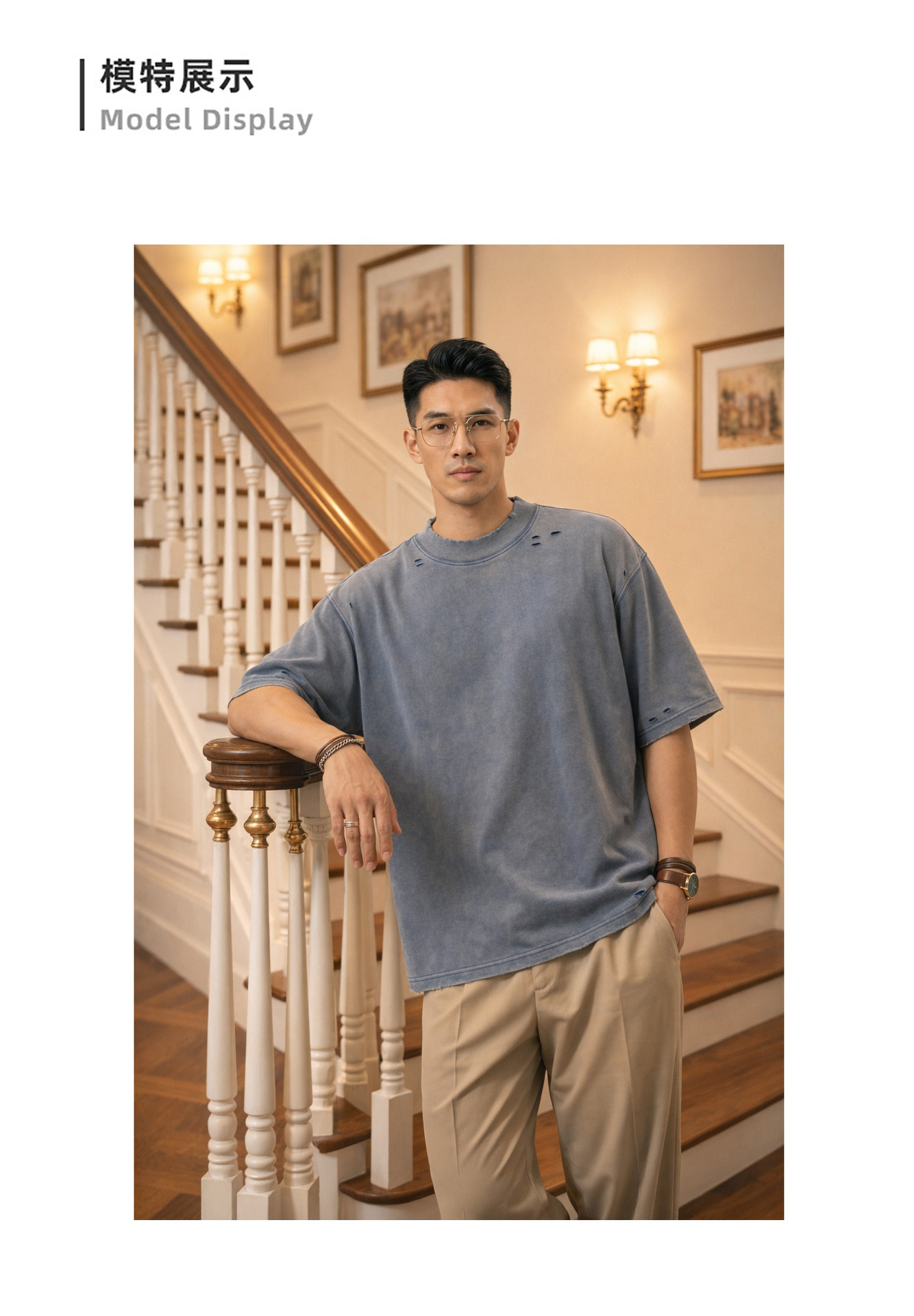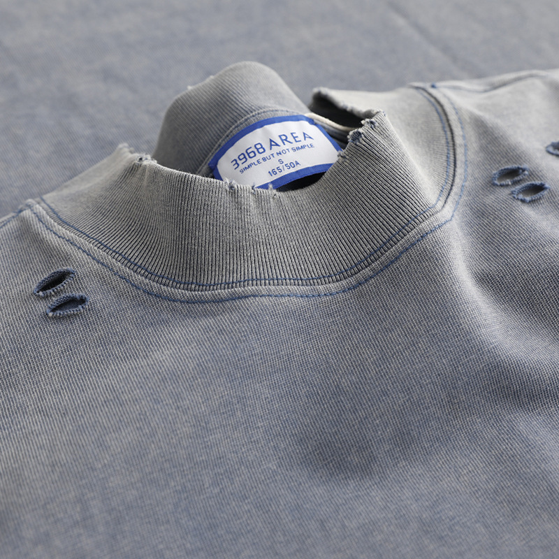 미국 스타일의 작은 목 씻은 오래된 반팔 티셔츠 남성용 하이 스트리트 트렌디 브랜드 립 작은 높은 목 향이 나는 루즈 탑