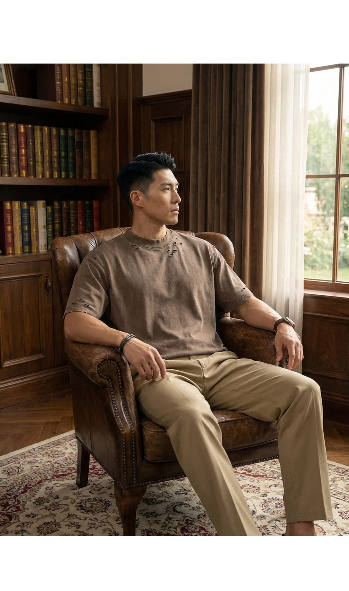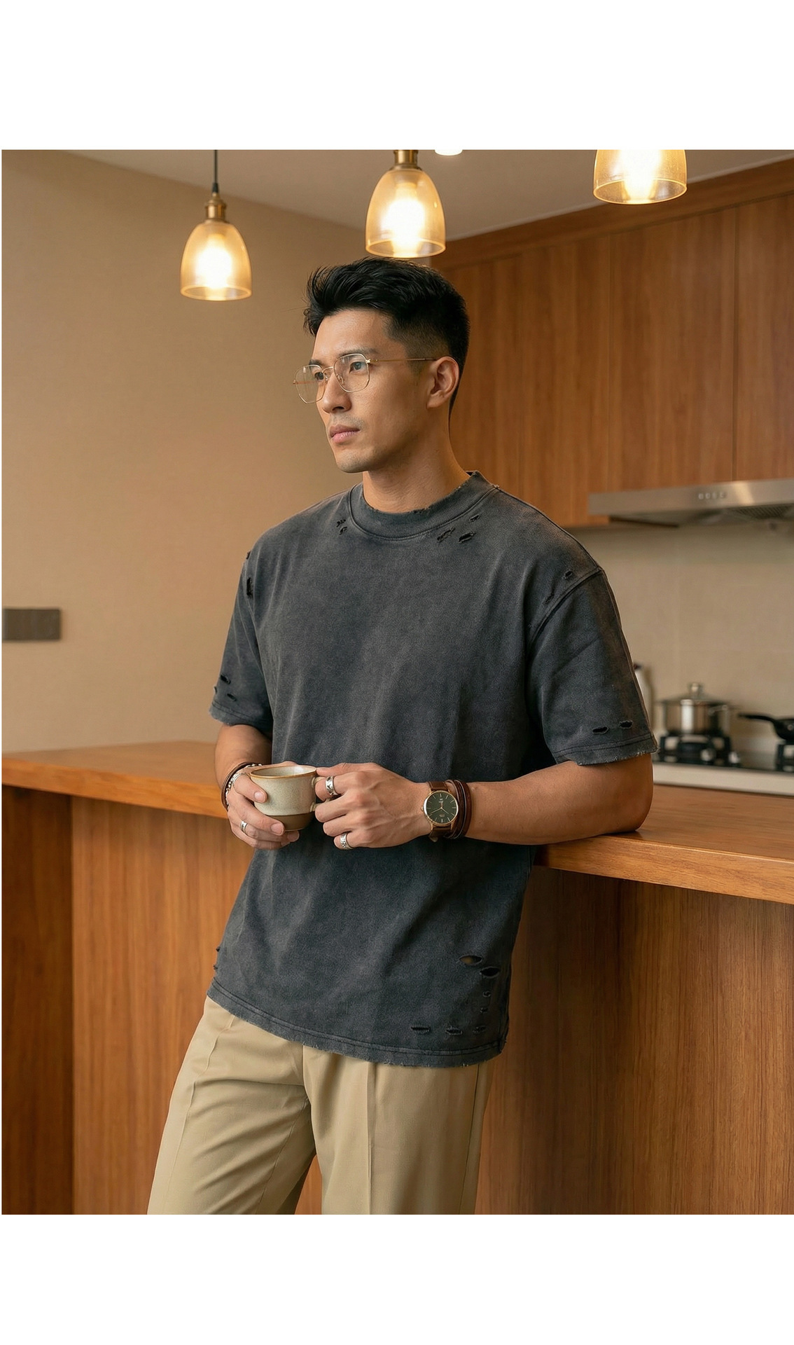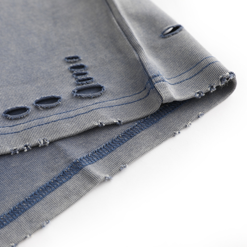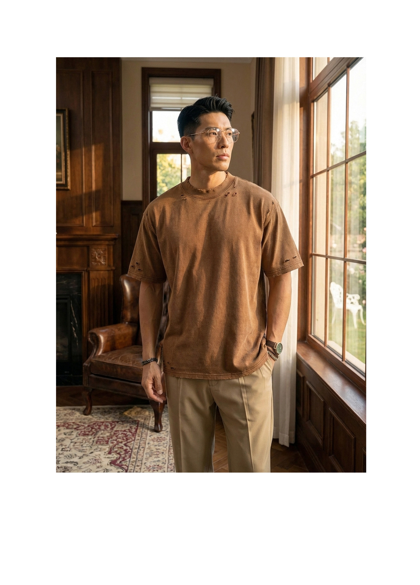 미국 스타일의 작은 목 씻은 오래된 반팔 티셔츠 남성용 하이 스트리트 트렌디 브랜드 립 작은 높은 목 향이 나는 루즈 탑