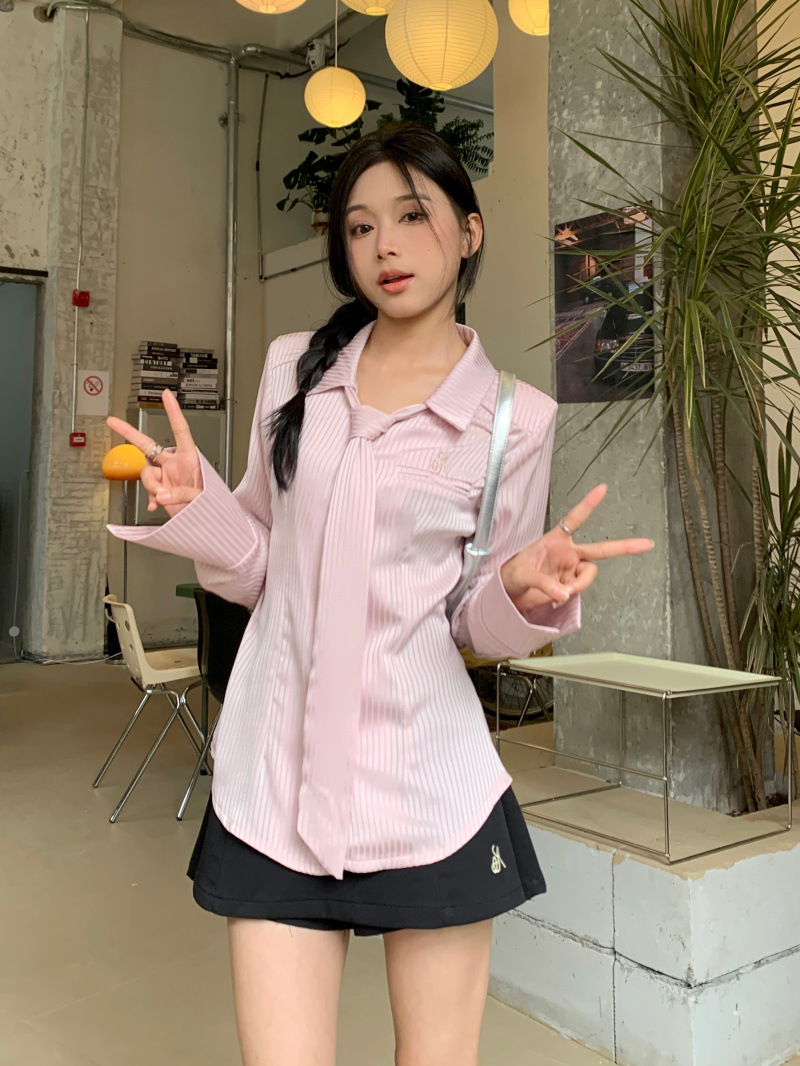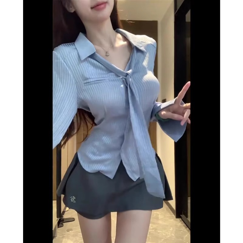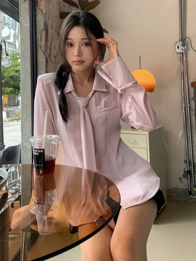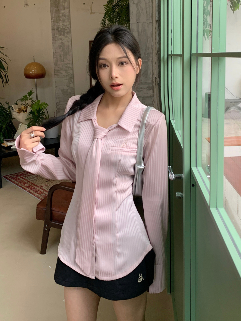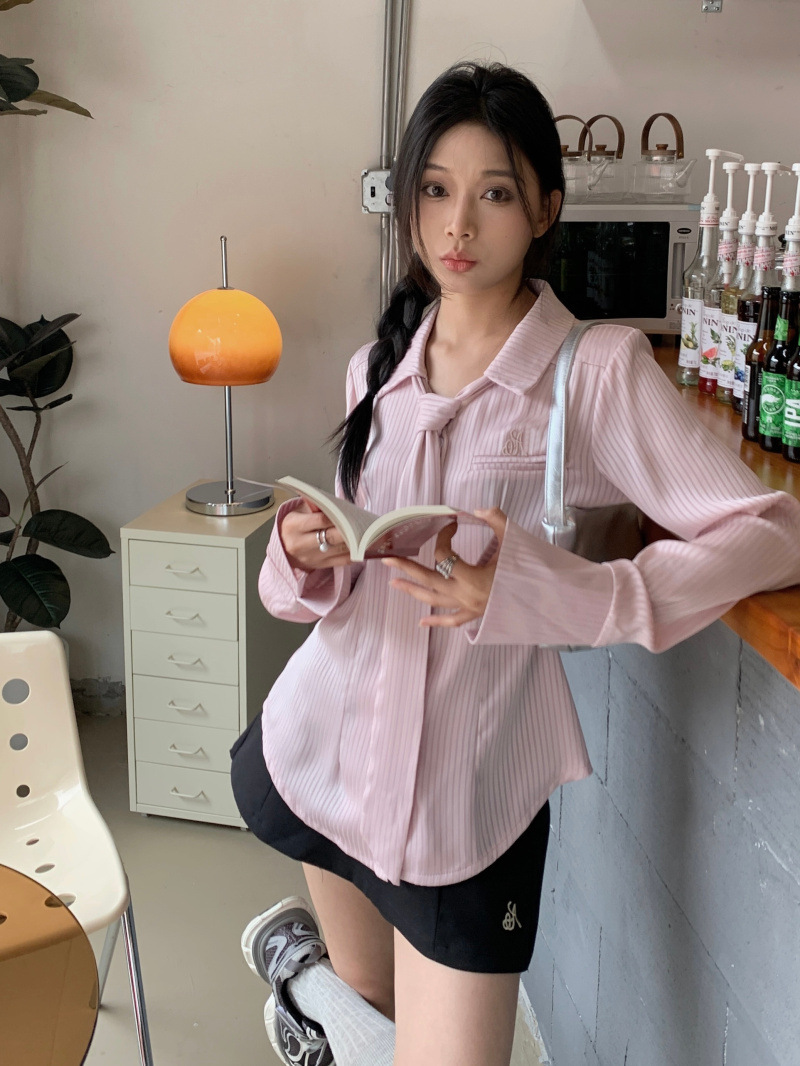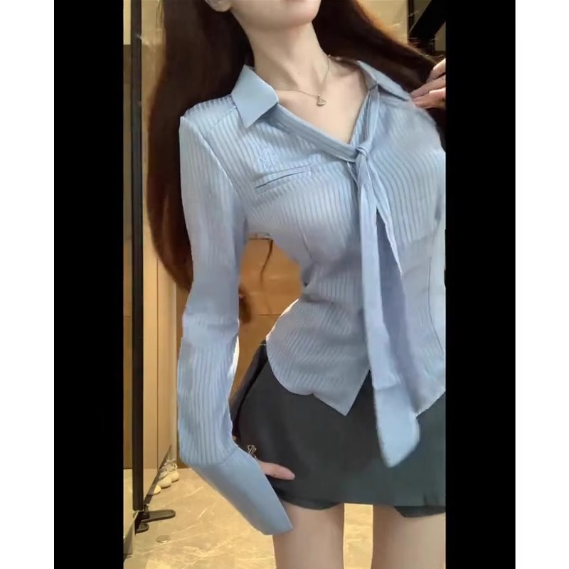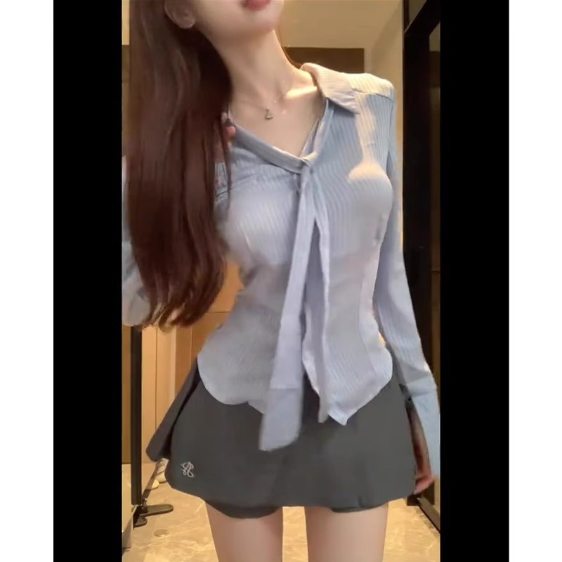 올해 인기있는 아름다운 여성 여름 소금 라인 라이트 요리 스타일 패션 스트라이프 셔츠 긴소매 여성용 넥타이 탑 태양 보호 캐주얼