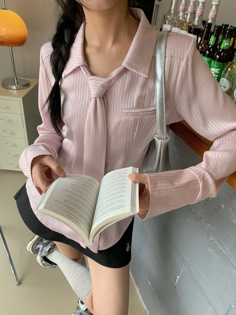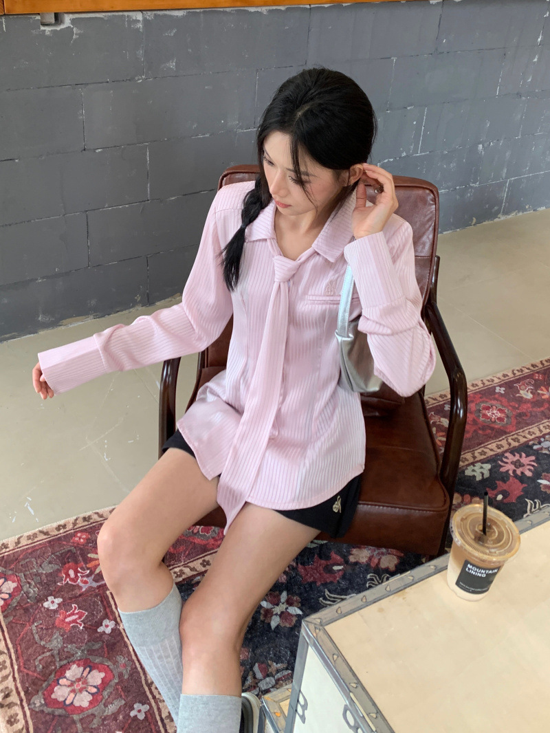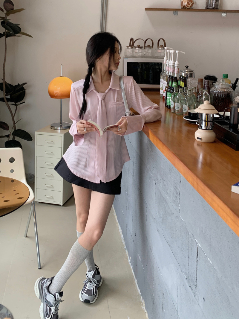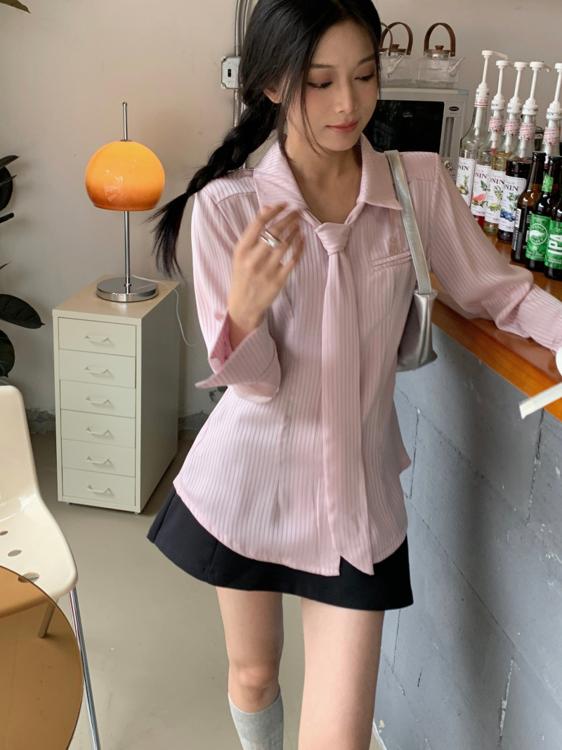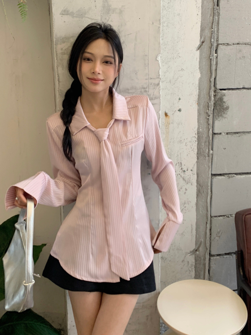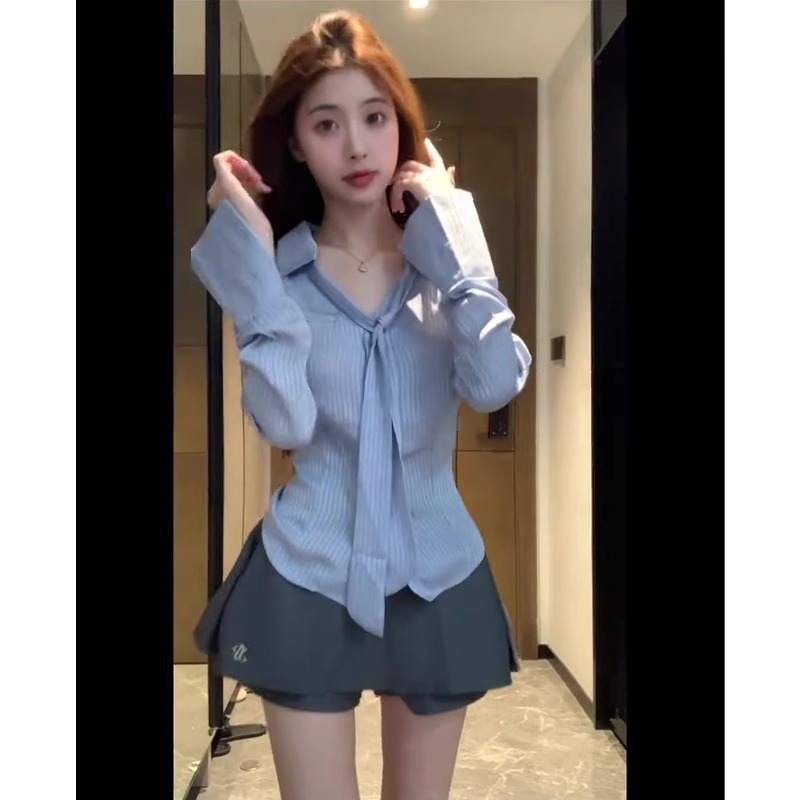 올해 인기있는 아름다운 여성 여름 소금 라인 라이트 요리 스타일 패션 스트라이프 셔츠 긴소매 여성용 넥타이 탑 태양 보호 캐주얼