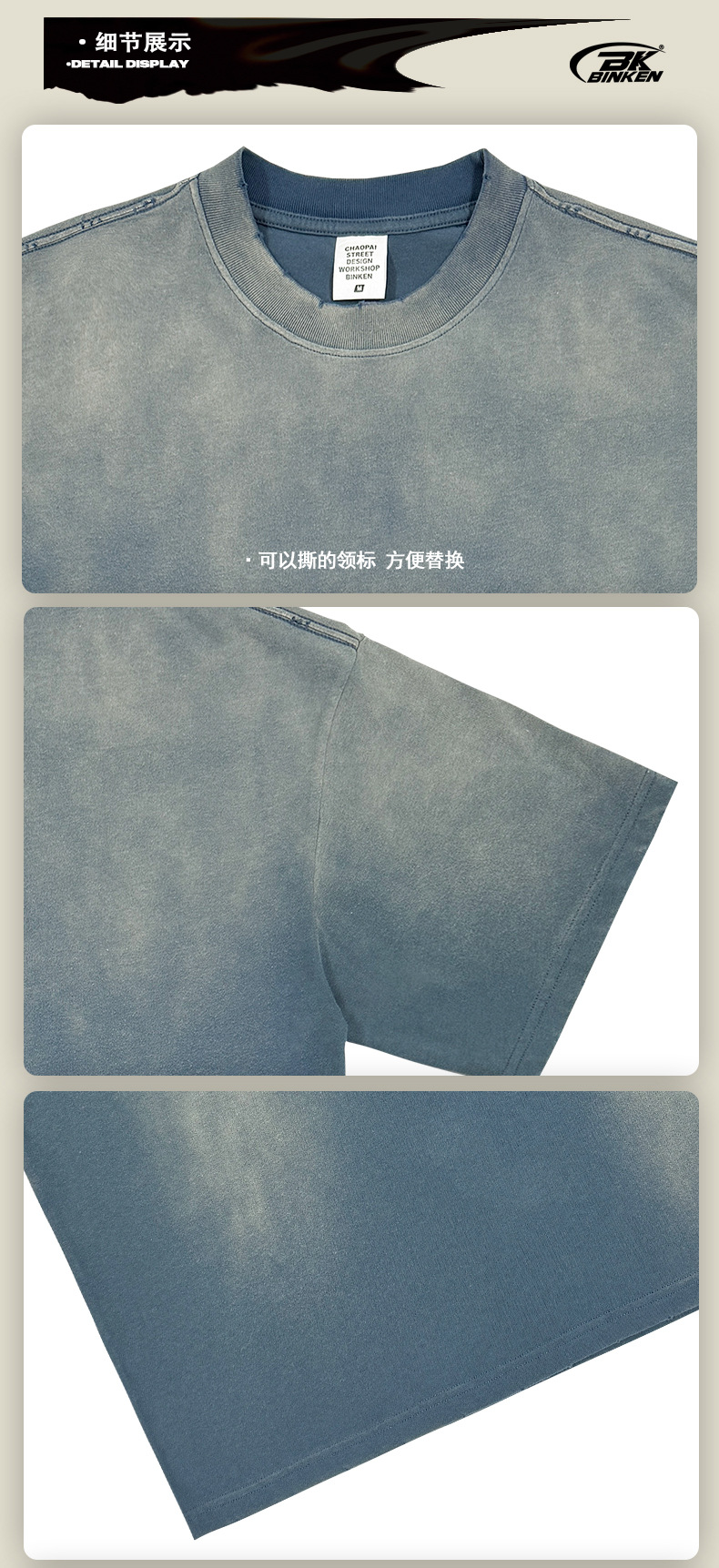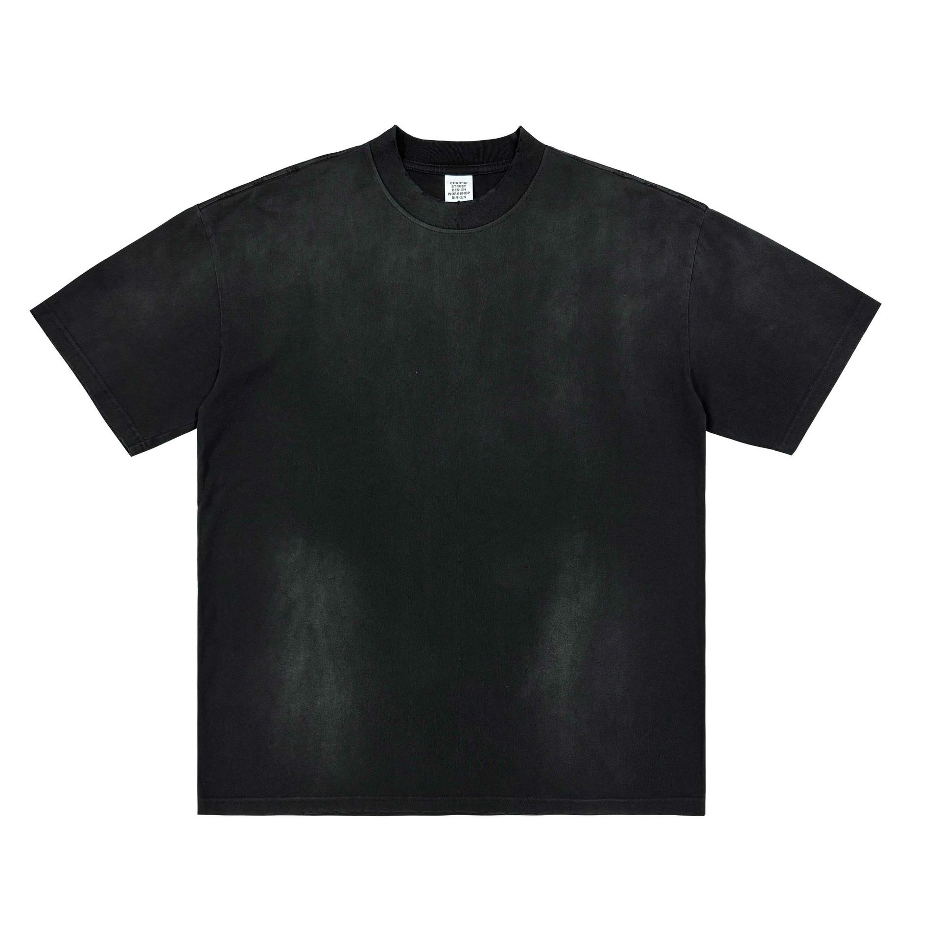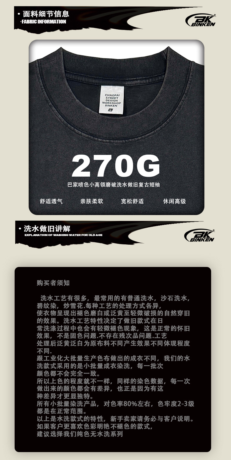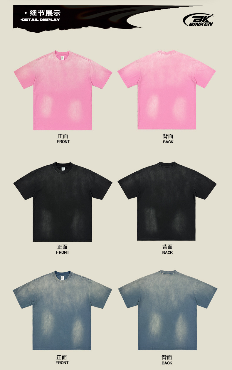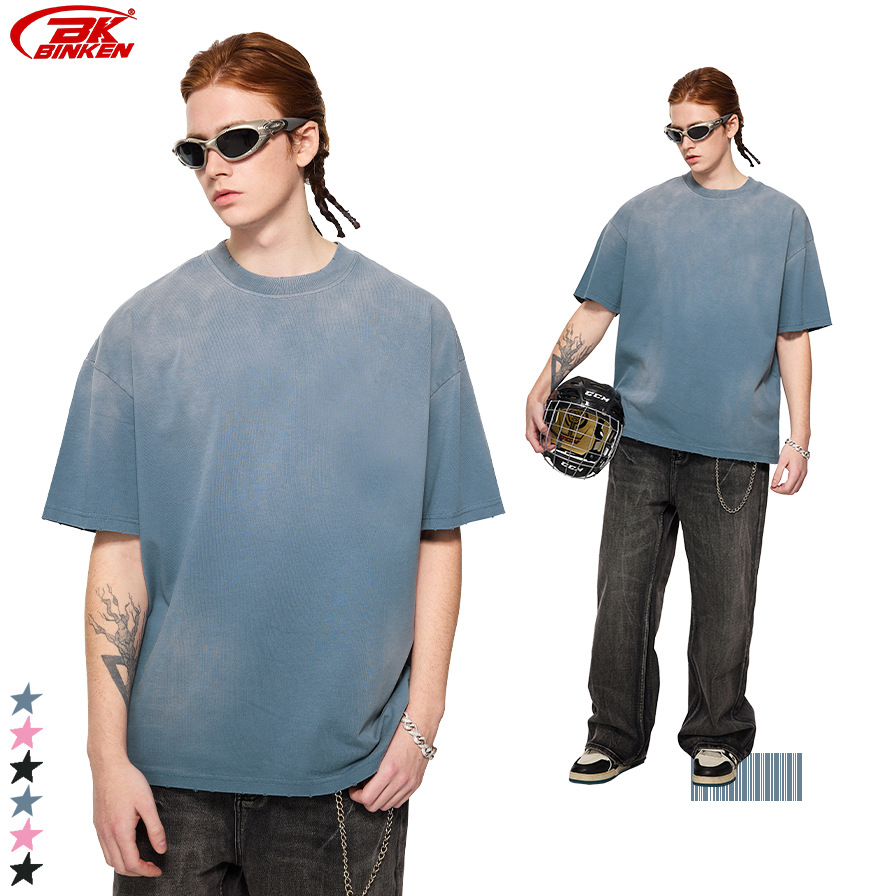 BK 남성복 270g 아메리칸 스타일 빈티지 워싱 데님 티셔츠 남성용 높은 목 라운드넥 루즈핏 트렌디 브랜드 남성 반팔 티셔츠