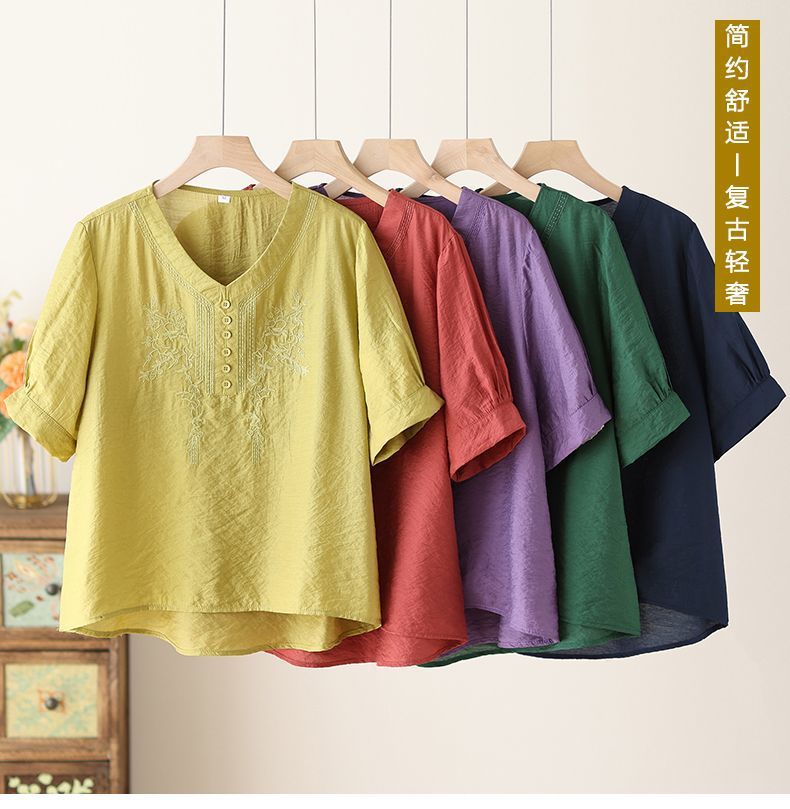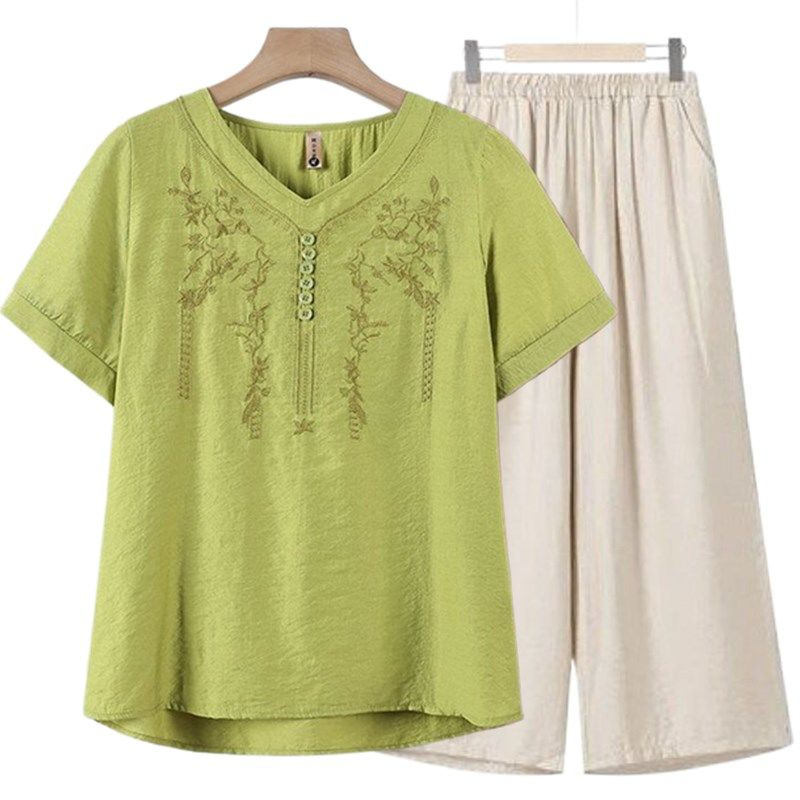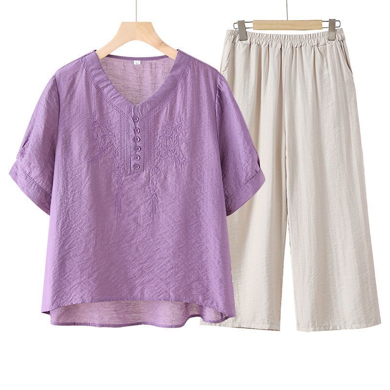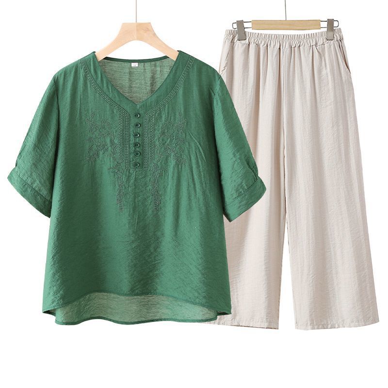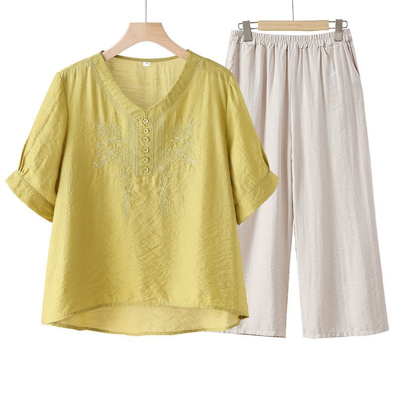 Gastrodia 세트 여성 자수 반팔 티셔츠 여성 여름 중년 서양식 어머니의 투피스 트렌디 팬츠 탑