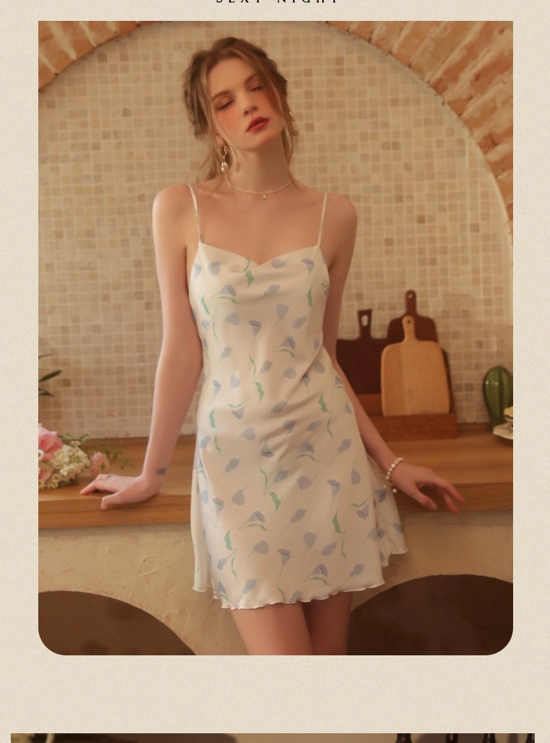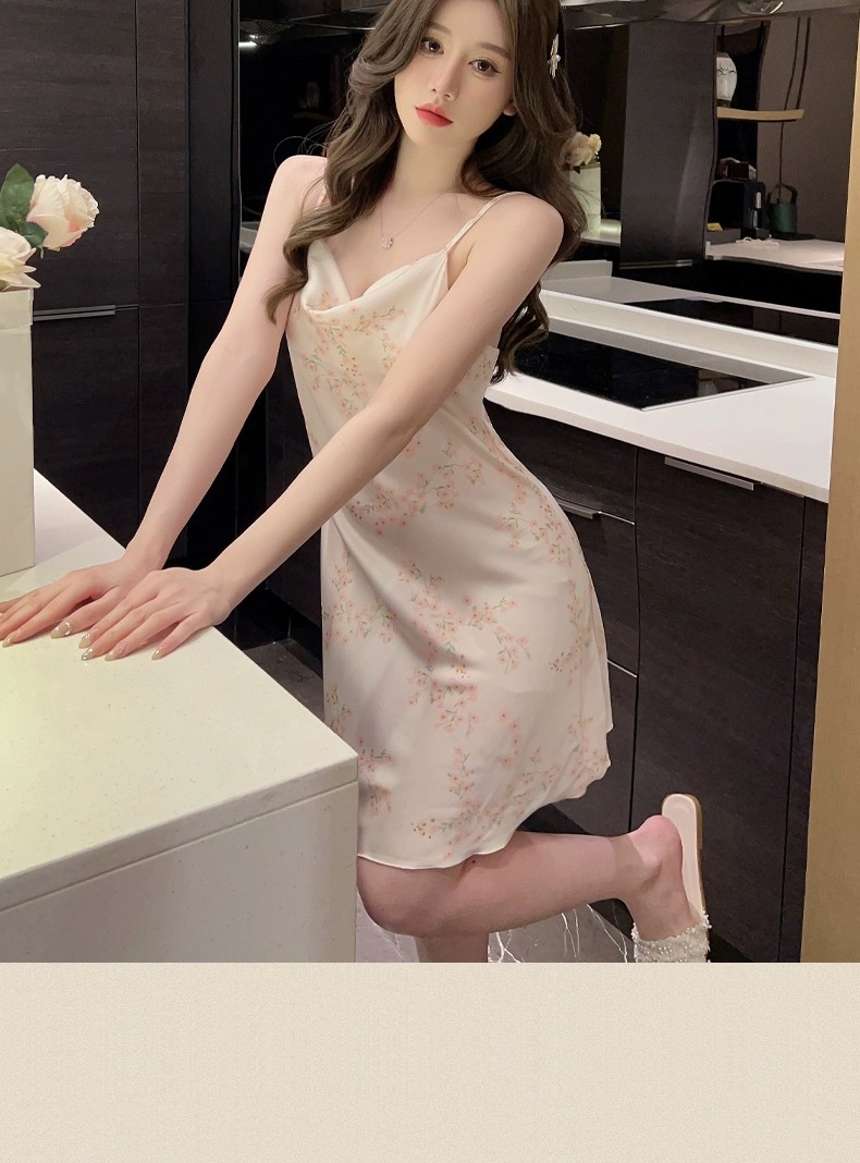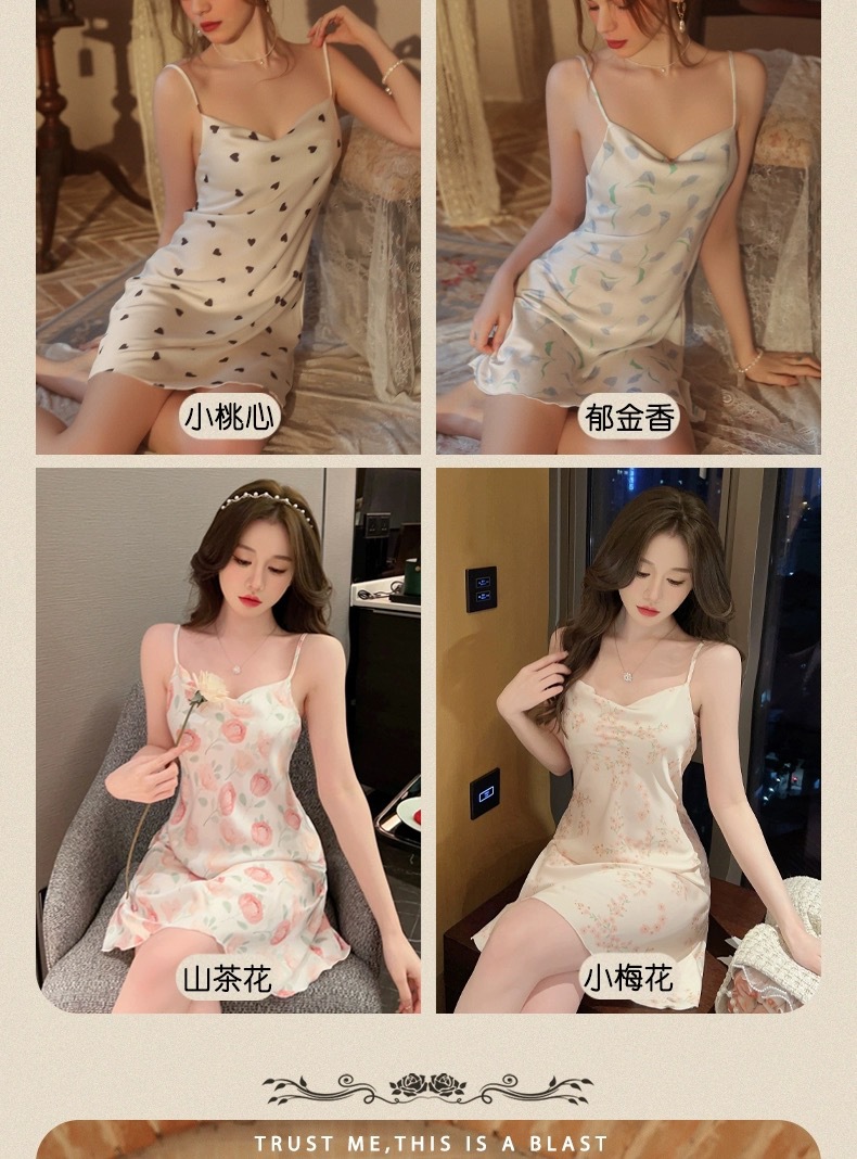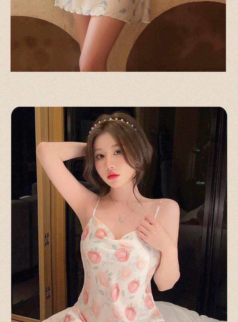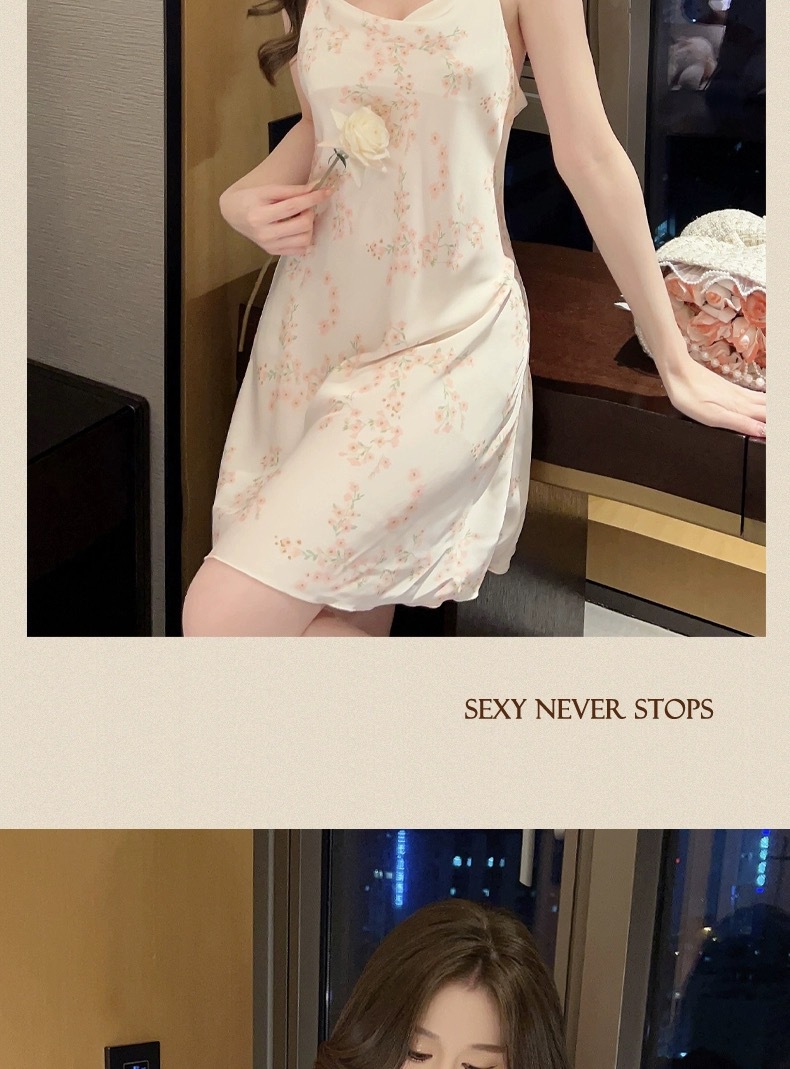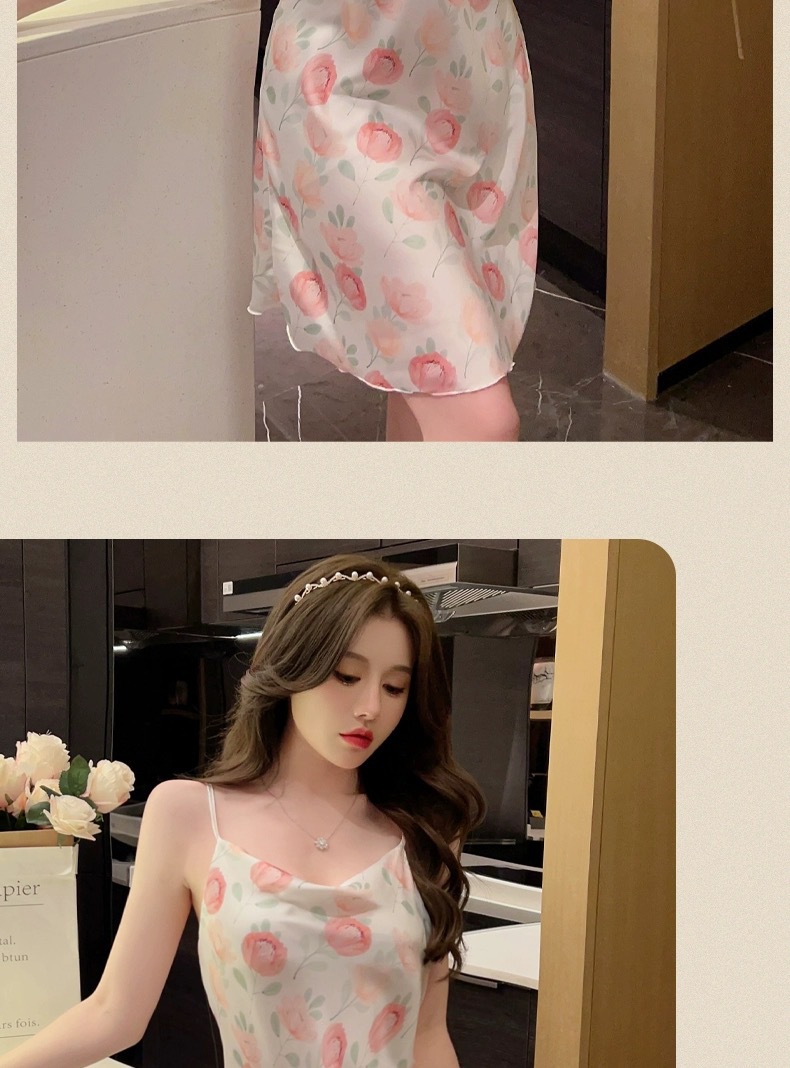 여성을위한 섹시한 잠옷 여름 2025 새로운 얼음 실크 하이 엔드 스윙 칼라 꽃 서스펜더 잠옷 홈웨어