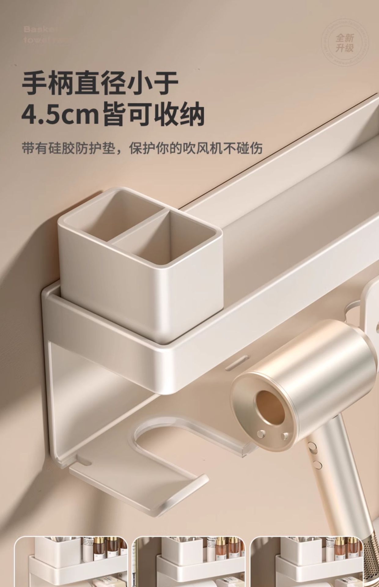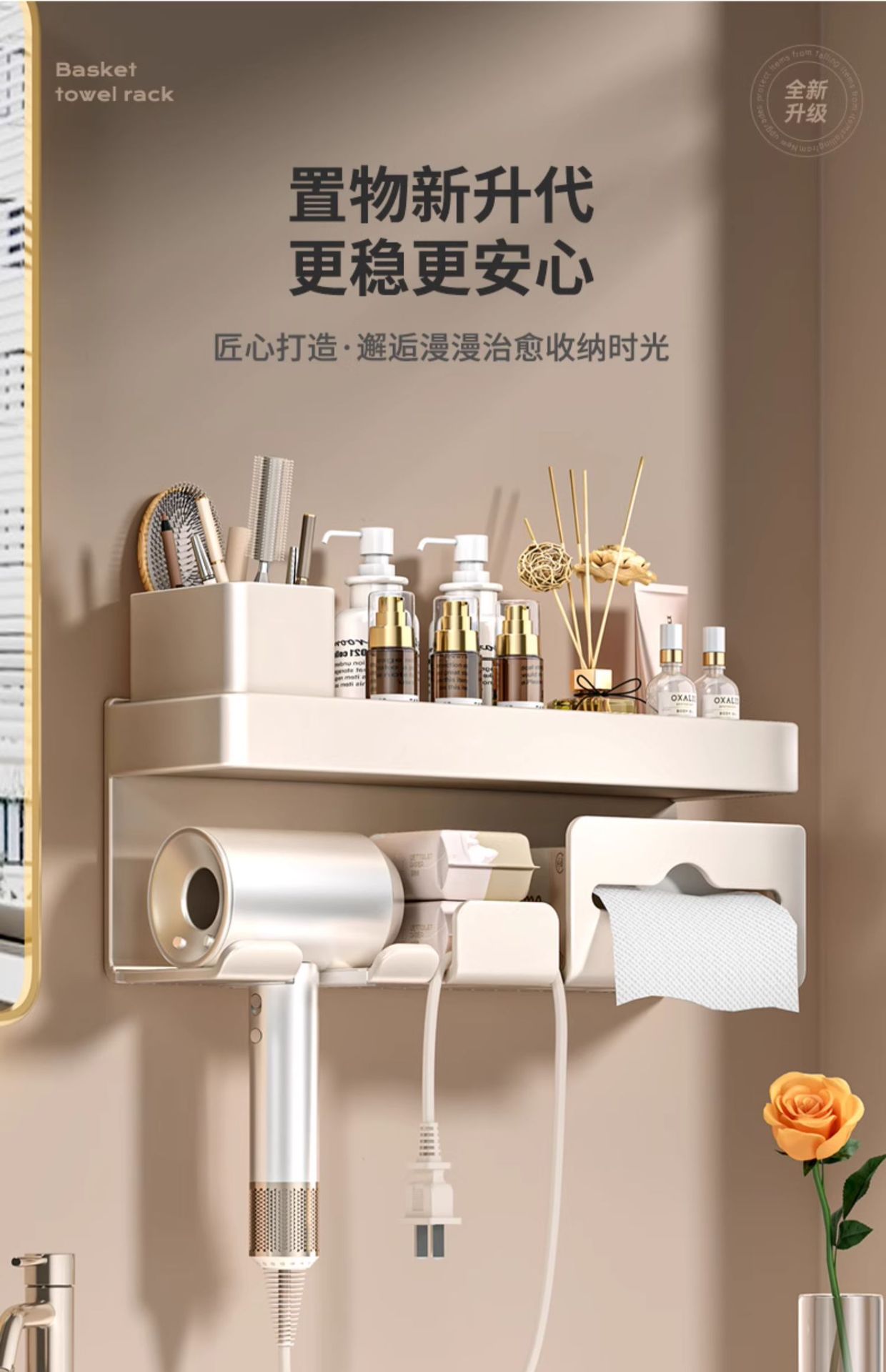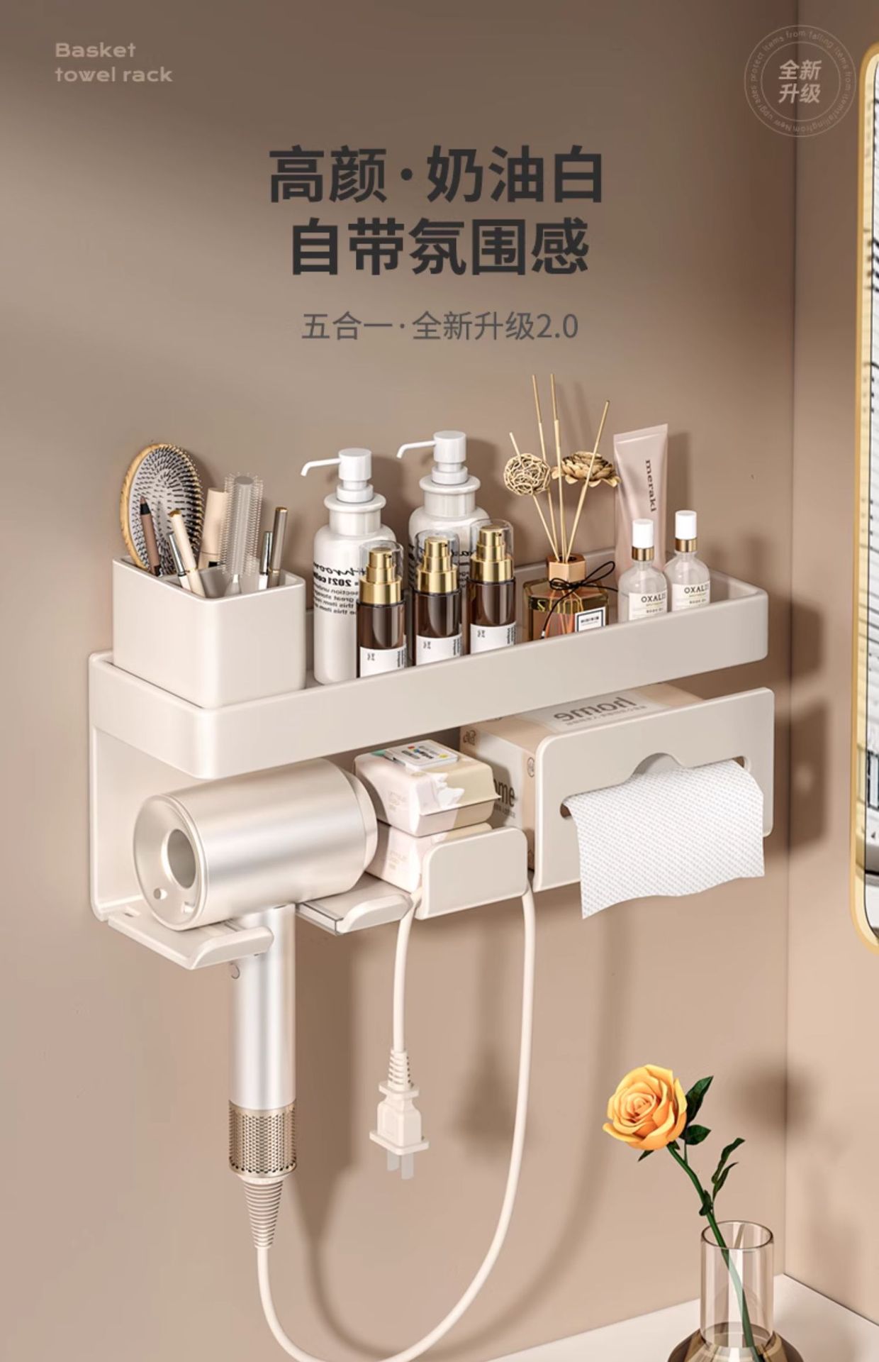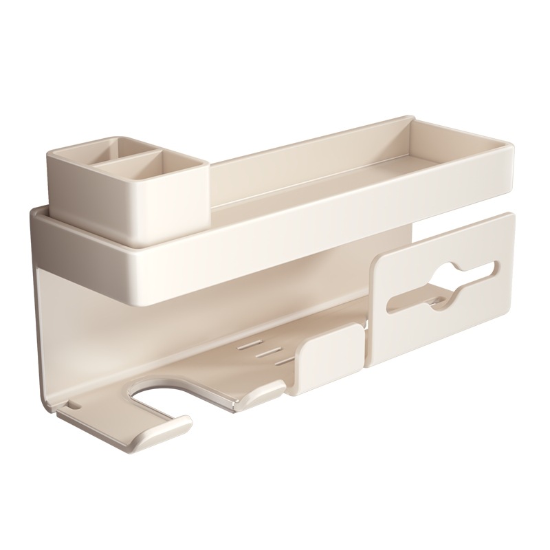 밀크화이트 헤어드라이어홀더 + 수납선반 + 빗통 + 걸이끈이 달린 종이타월홀더-01049